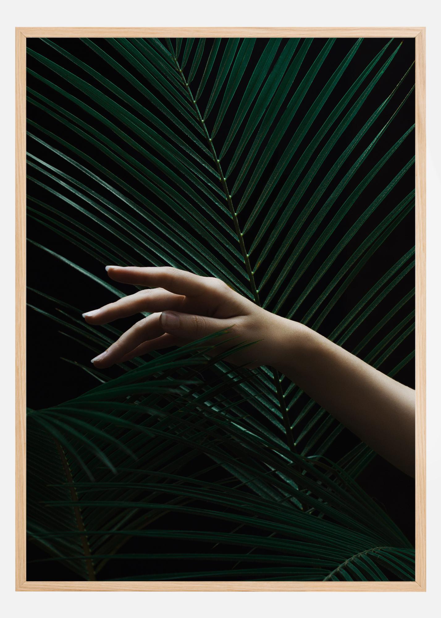 Botaninė fotografija su žaliomis palmės panašiomis šakomis juodame fone. Ištiesta ranka suteikia gyvybingumo ir kontrasto. Tai sodri plakatė, puikiai tinkanti didesnei paveikslų sienai.