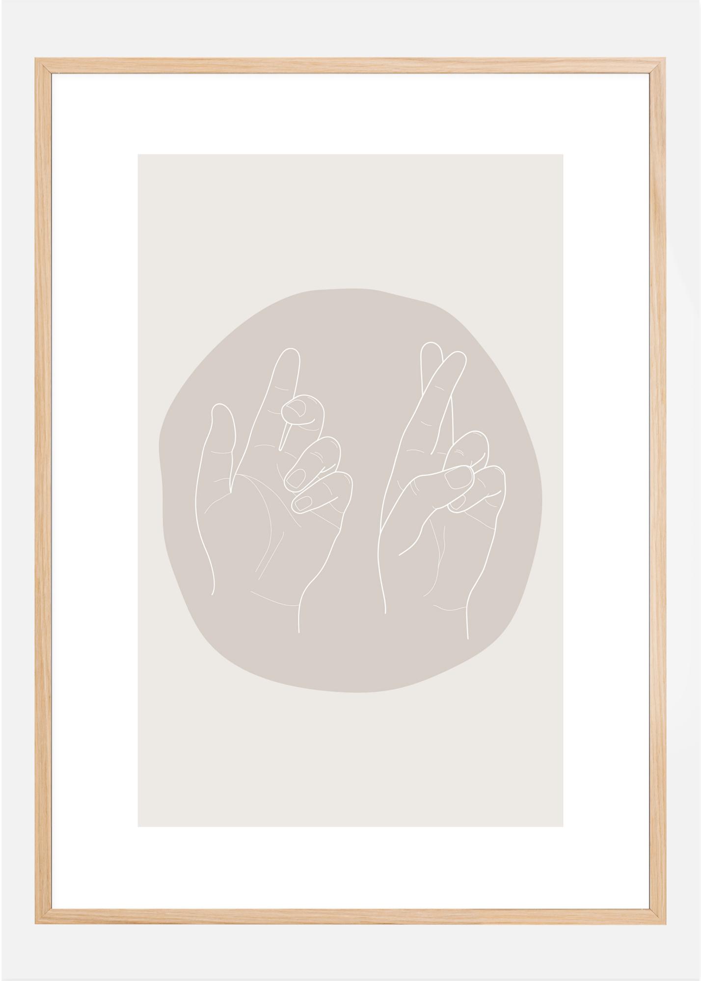 Paprastas plakatas su dviem kairėm rankom prieš apskritą smėlio formą. Apskritimas yra ant kūno spalvos fono, o abi rankos nukreiptos į plakato viršutinį kraštą. Rankos yra atsipalaidavusios ir sukuria ramybės atmosferą jūsų namuose. Puikus vaizdas jūsų darbo kambariui.