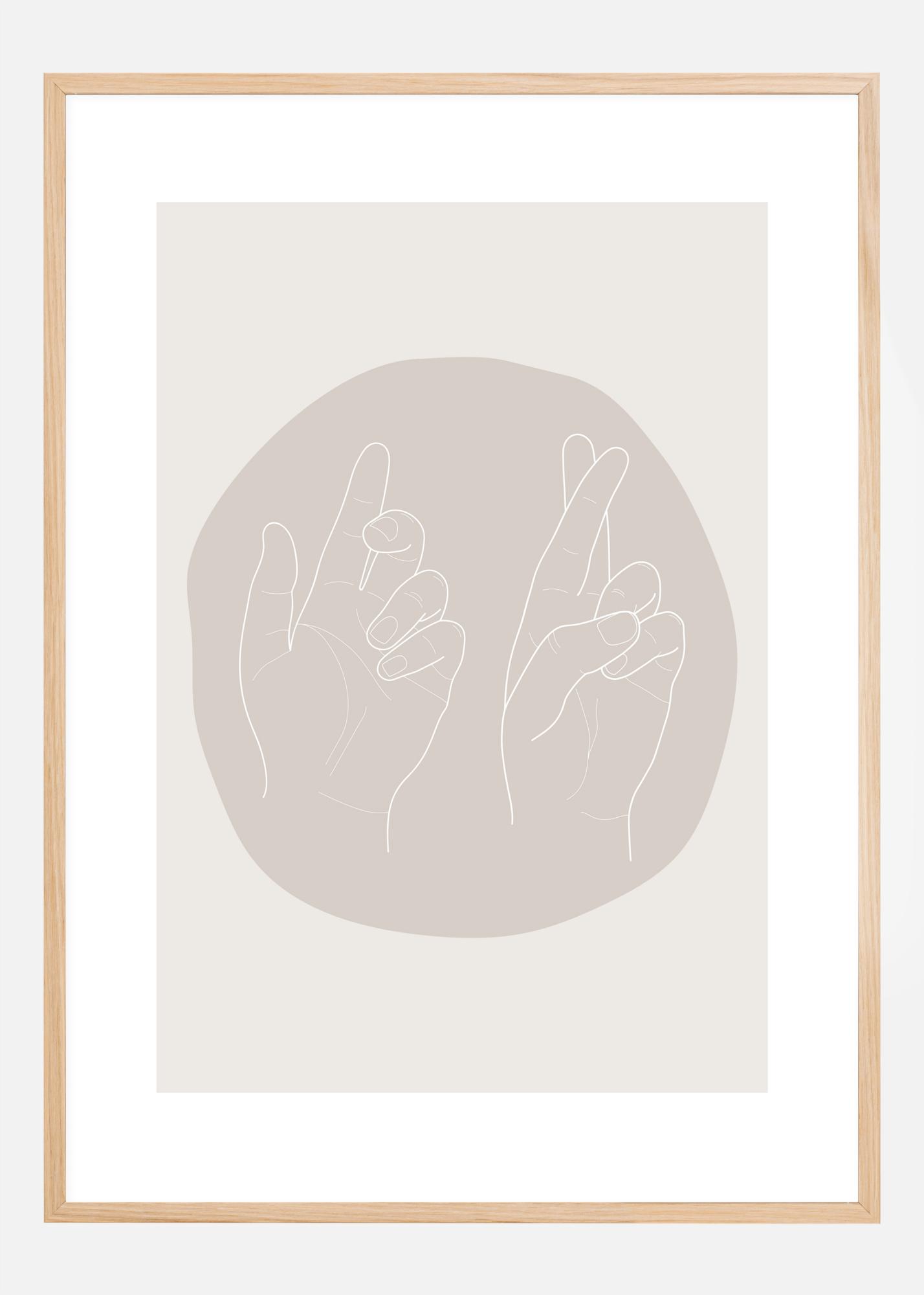 Paprastas plakatas su dviem kairiosiomis rankomis ant apvalios smėlio formos. Apskritimas yra išdėstytas kūno spalvos fone, o abi rankos nukreiptos į plakato viršutinį kraštą. Rankos yra atsipalaidavusios ir sukuria ramią atmosferą jūsų namuose. Puikus vaizdas jūsų darbo kambariui.