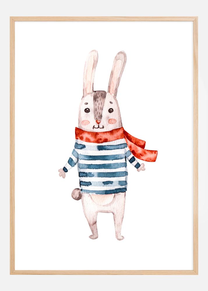 Šis žavus plakatas vaizduoja džiugią triušį, apsirengusį dryžuotu megztiniu ir plazdančiu raudonu šaliku. Triušio šilta šypsena ir žaisminga laikysena spinduliuoja džiaugsmą ir nekaltumą, sukurdami širdingą ir kviečiantį jausmą. Iliustracija, atlikta švelniais akvarelių tonais, suteikia lengvumo ir paprastumo, kuris sukuria jaudinančią ir nostalgišką efektą.