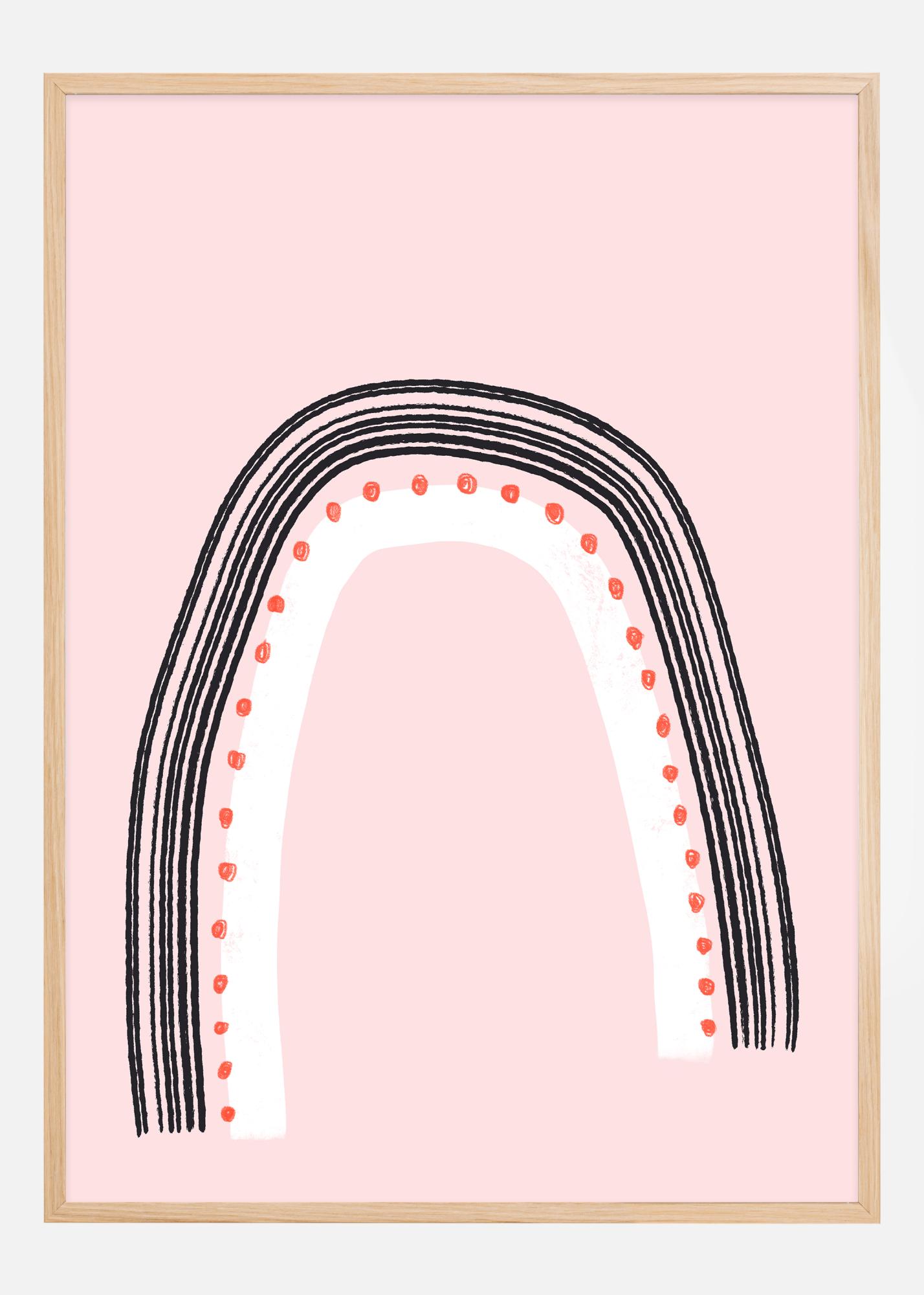 Šis žaismingas ir žavus plakatas vaizduoja stilizuotą vaivorykštę su moderniu ir grafiniu požiūriu. Ant šviesiai rožinio fono drąsūs, juodi vaivorykštės lankų kontūrai sukuria aiškų kontrastą, o eilės mažų, raudonų širdelių eina viena kreive, suteikdamos nenugalimą džiaugsmo ir pozityvumo jausmą. Šis atspausdinimas spinduliuoja paprastumu ir džiaugsmu ir galėtų apšviesti bet kurį kambarį savo žavesiu ir draugišku spinduliavimu.