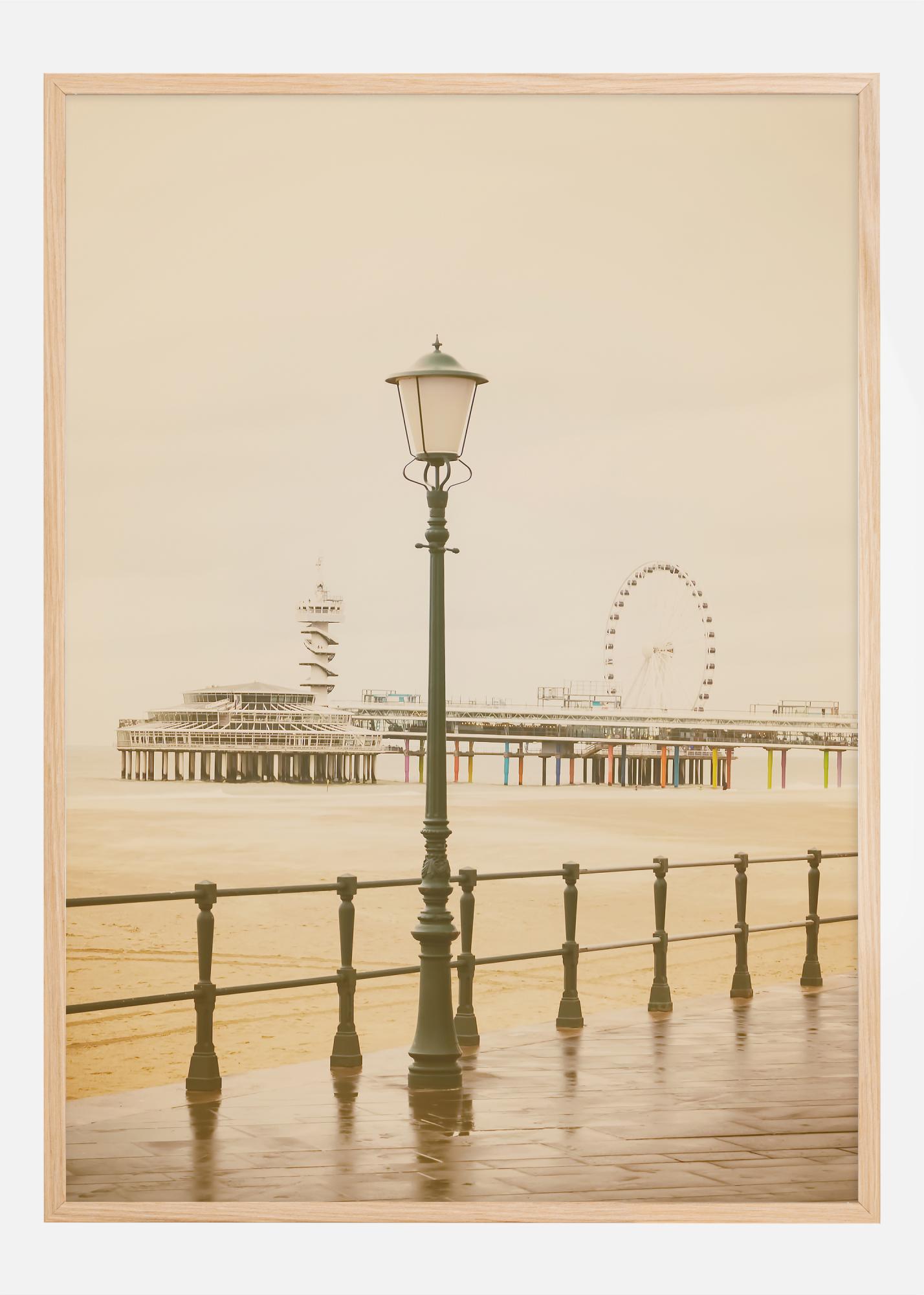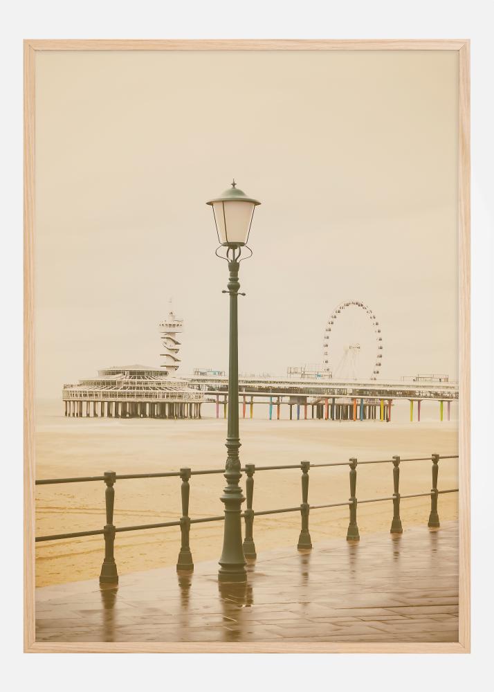Šis nostalgiškas plakatas sukelia lėtos, svajingos dienos prie jūros jausmą. Senoviškas žibintas stovi pirmame plane, tylus sargas tuščioje pajūrio promenadoje su jos klasikinėmis baliustradomis. Fone matomas molas su stebėjimo bokštu ir dideliu apžvalgos ratu, kuris suteikia laiko nesibaigiančio atrakcionų parko romantikos jausmą. Švelnios sepijos ir smėlinės spalvos tonai sustiprina praeities eros jausmą ir kviečia apmąstymams.