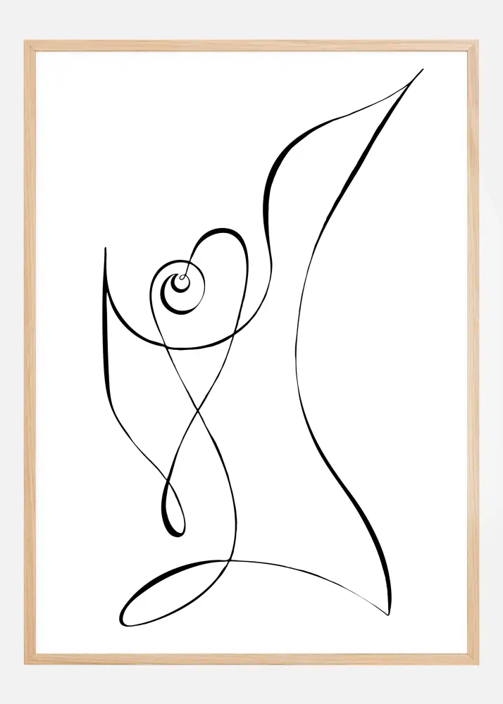 Paprastas abstraktus plakatas su laisva interpretacija. Rinkinys lenktų juodų linijų, nubrėžtų ant balto fono, sukuria širdies formą paveikslo viduryje. Puikiai tinka visiems, kurie mėgsta minimalistinį stilių, kad pridėtų klasės prisilietimą prie šiuolaikinio namo.