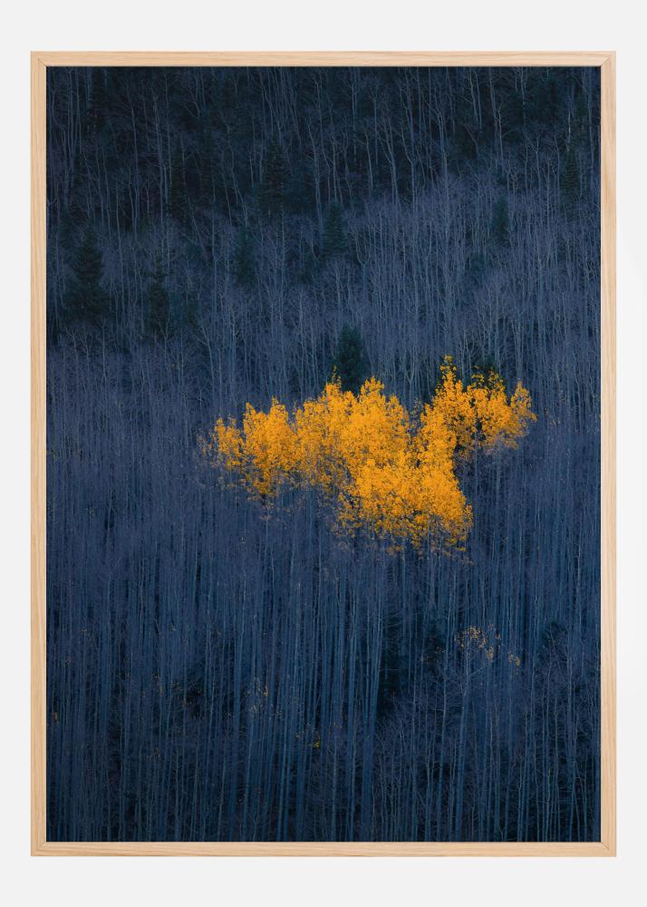 Nuostabus plakatas, vaizduojantis tamsiai žalią ir vidurnakčio mėlyną medį. Spaudinio viduryje medžių viršūnės yra paryškintos geltona spalva, suteikiant spaudiniui šiek tiek spalvos. Gražus spaudinys, kurį galima pakabinti svetainėje, kad sukurtumėte atpalaiduojančią atmosferą.