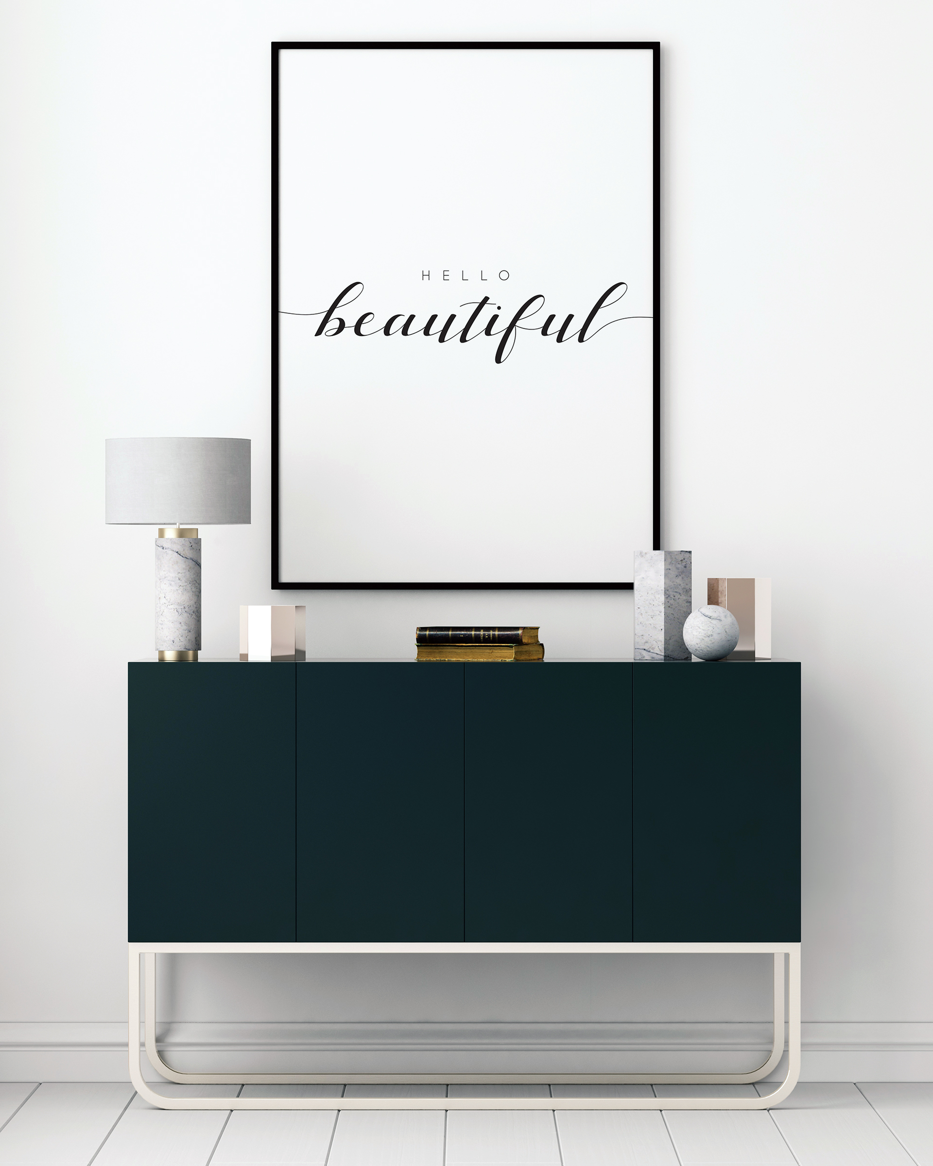Paprastas juodai baltas plakatas su dviem žodžiais, esančiais nuotraukos centre. Žodis „Hello“ yra mažomis raidėmis, o žodis „Beautiful“ patraukia mūsų dėmesį dėl savo dydžio ir elegantiškų raidžių. Neįtikėtinai galingas vaizdas pakabinti vaikų kambaryje.