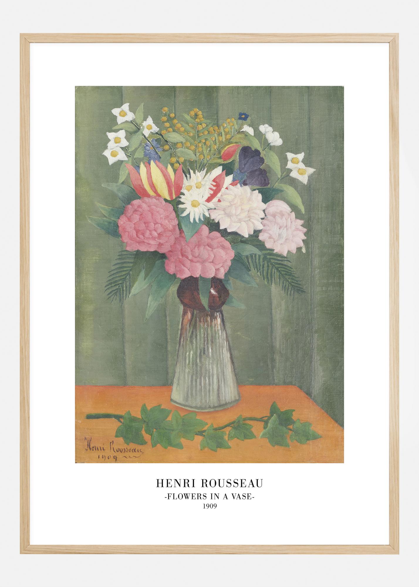 Ši Henri Rousseau 1909 m. sukurta "Gėlės vazoje" afiša vaizduoja gražų ir įvairiaspalvį gėlių puokštę, kurios malonus ir detali vaizdavimas primena raminančias vasaros dienas. Tai yra idealus spaudinys tiems, kurie siekia įnešti gamtos grožio ir ramybės jausmą į savo namus ar darbo vietą, ir gali suteikti klasikinio žavesio bet kuriai erdvei.