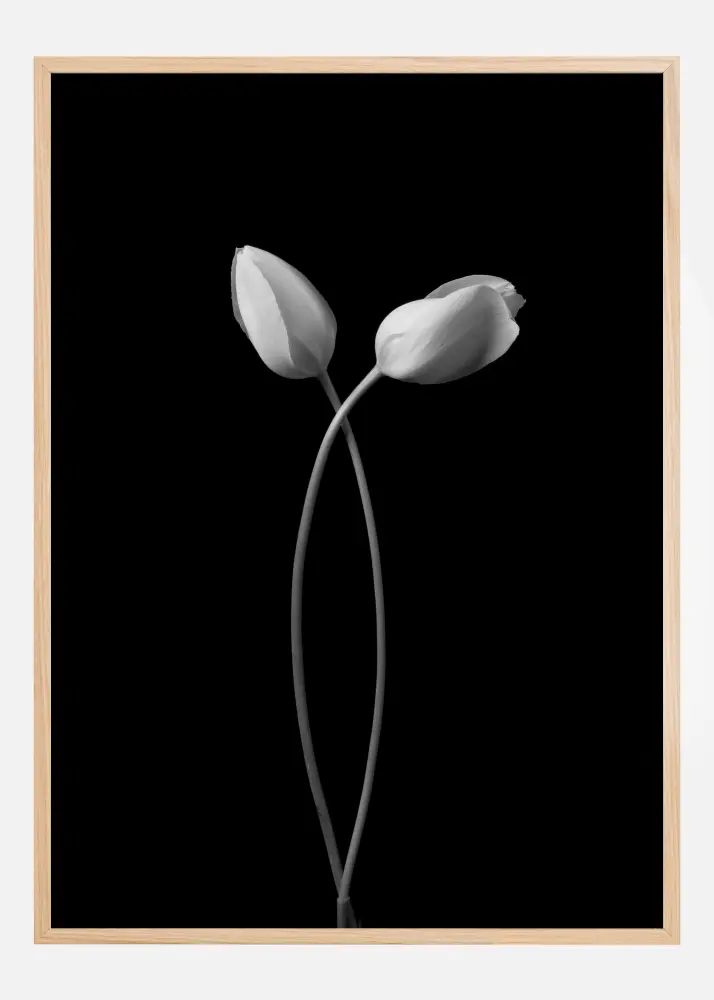 Elegantiška plakatas su dviem tulpėmis, apsikabinusiomis prieš paprastą juodą foną. Padėkite šią ant geltonos sienos, kad įneštumėte spalvą į šią dramatišką sceną. Pajuskite ryšį su gamta per šį plakatą.