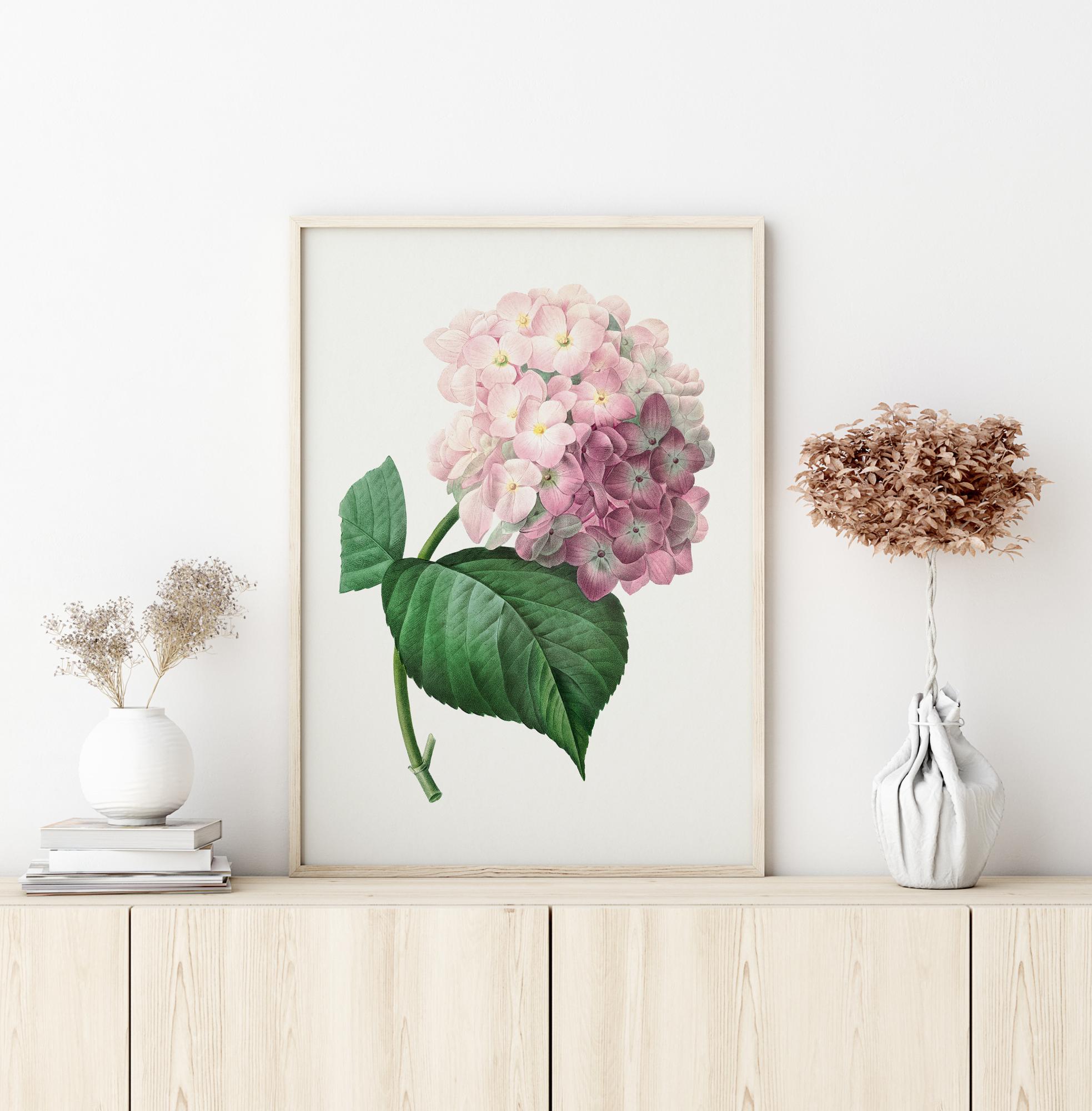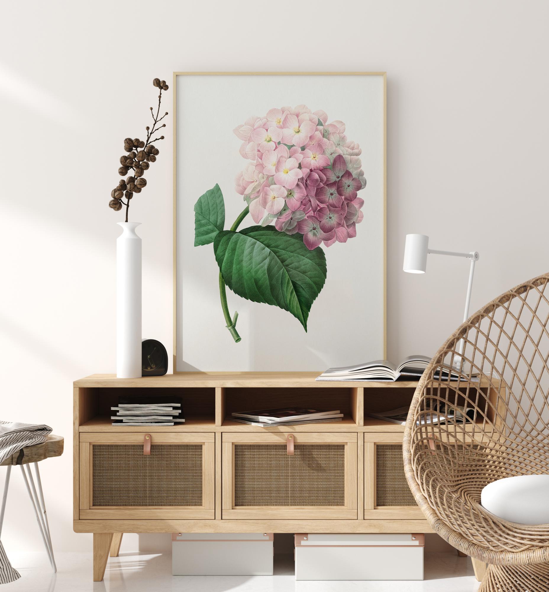 Gėlėtas plakatas su hortenzija. Švelniai rožiniai žiedlapiai su švelniai žaliu stiebu bei žaliu lapu vyrauja paveikslo centre. Prie švarios baltos fono ši graži, tačiau jautri gėlė suteikia ramybės ir poilsio jausmą. Pakabinkite šį paveikslą žiemos sode, kad suteiktumėte kambariui šiek tiek papildomos klasės.