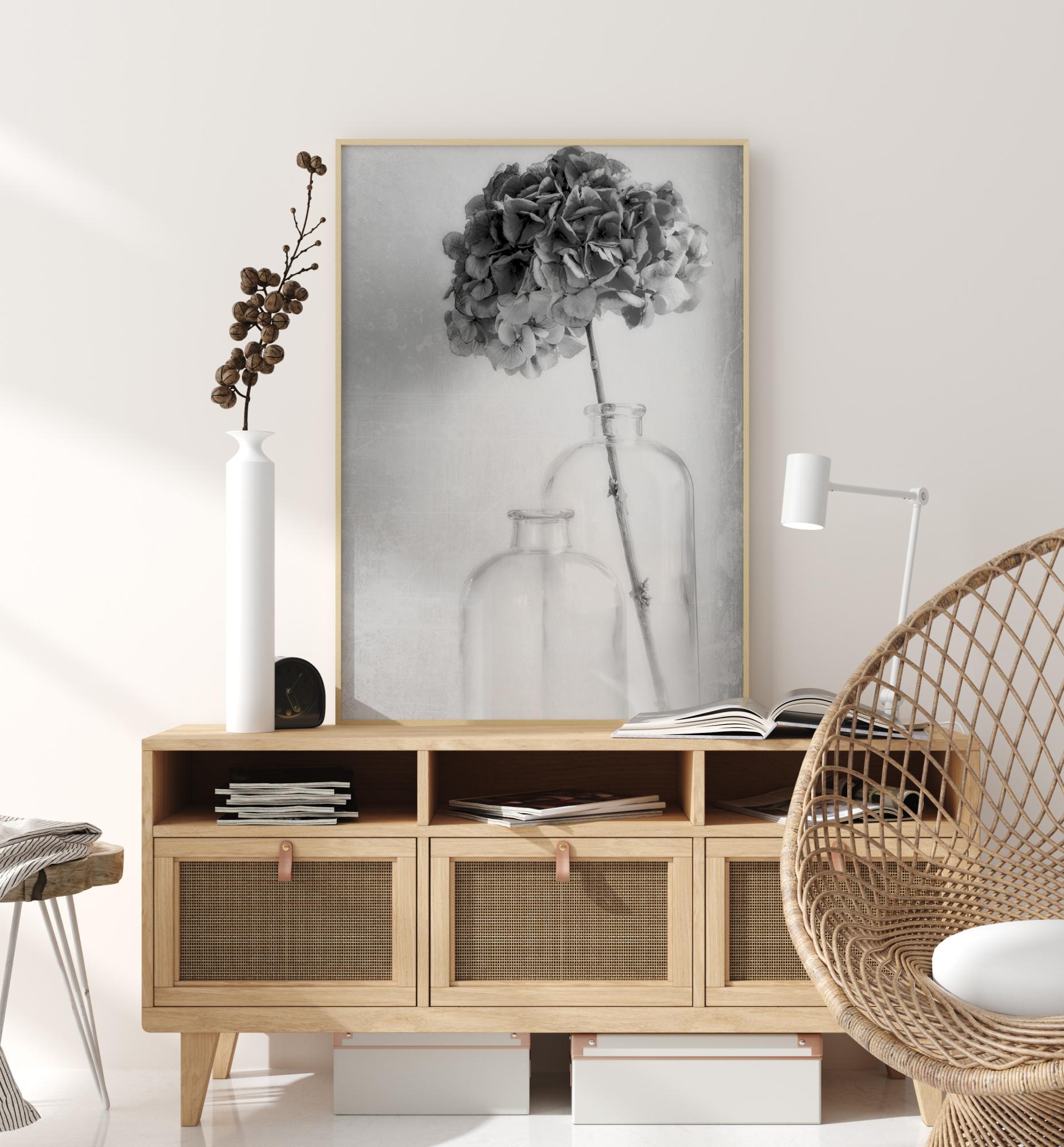 Gražus gamtos plakatas su hortenzijos kotu permatomoje vazoje. Priešais gėlėtą baltą užuolaidą krenta subtilus rožinis žiedlapis. Užuolaida plazda lengvoje vėjo gūsije. Šis vaizdas beveik leidžia pajusti brizą.