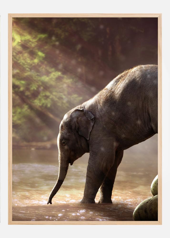 Žavinga nuotrauka, kurioje matyti drambliuko jauniklis, kurį mama skatina eiti į upę. Dienos šviesa šviečia per medžius ir atsispindi vandenyje, sukurdama šilumos pojūtį. Drambliukas dvejoja, ar eiti į vandenį, bet mama švelniai padeda. Šis mielas plakatas atspindi intensyvią motinos ir vaiko meilę.