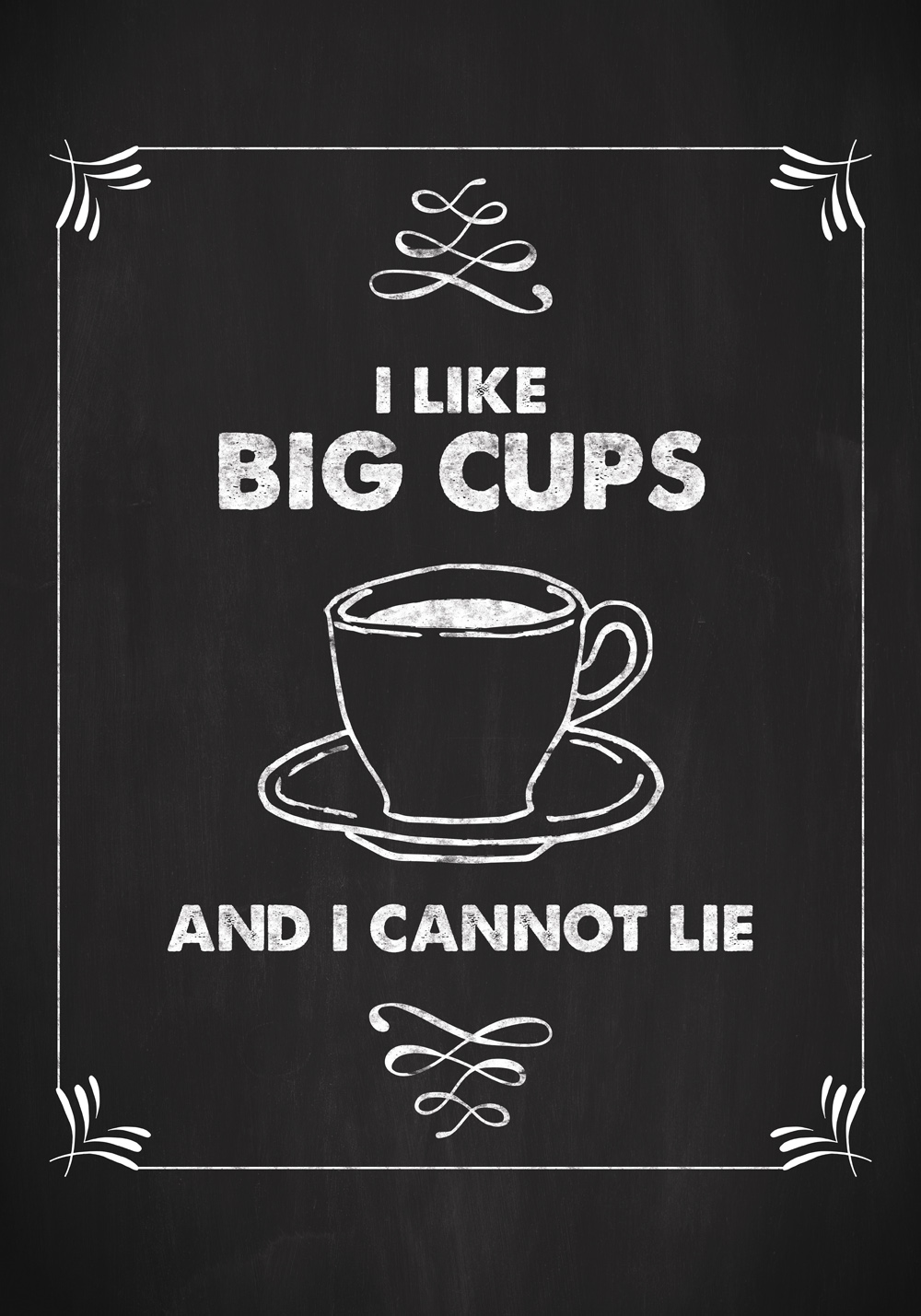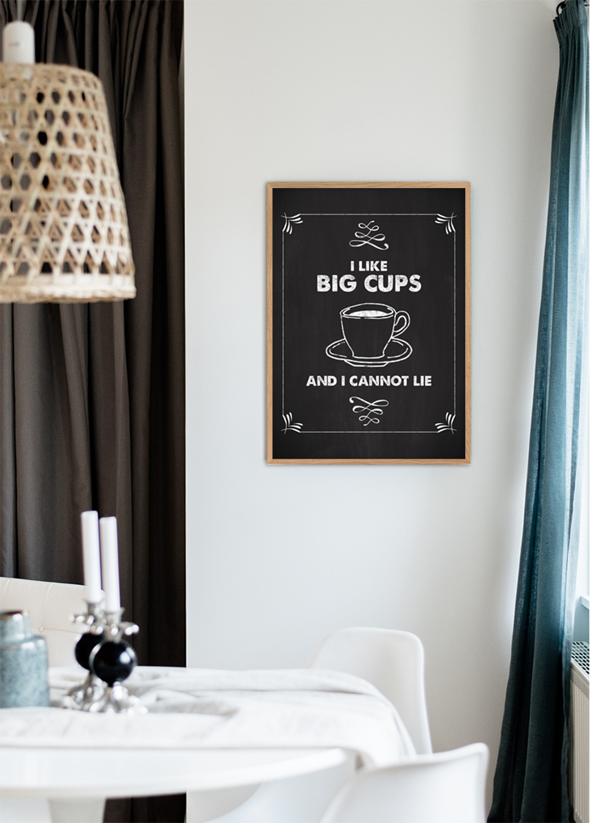 Šmaikštus raštas su žinia - Man patinka didelės puodeliai, ir aš negaliu meluoti, skirtas tiems, kurie mėgsta dideles kavos ar arbatos puodelius. Juodai balta plakatas, su kreidinės lentos jausmu, puikiai tinka virtuvės lentynoms kartu su receptų knygomis ir maisto ruošimo aksesuarais. O kodėl gi jos nepakabinus kartu su kitais grafikos spaudiniais ant sienos su tema iš virtuvės pasaulio. Papildykite plakatą paprastu juodu rėmeliu, kuris leidžia žodžiams kalbėti ir sustiprina mokyklinės lentos įspūdį.