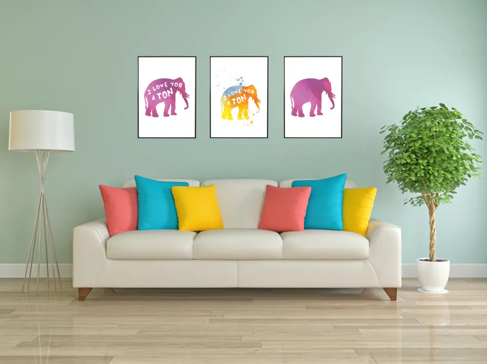 Meili ir linksmas plakatas, tinkamas padovanoti tiems, kurie myli dramblius ir nori spalvų sprogimo ant sienos. Dramblys atrodo tarsi atspausdintas iš gausos spalvų ant balto popieriaus, su tekstu baltu šriftu, turinčiu ranka rašytą jausmą. Plakatas puikiai atrodo įrėmintas stilingu vienspalviu rėmu, kuris išryškina motyvo atspalvius ir puikiai dera su kitais kambario, kuriame bus kabinama paveikslas, interjero elementais.