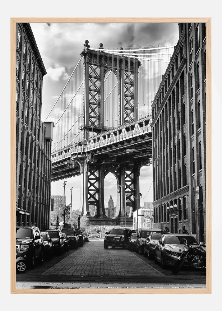 Nespalvotas architektūrinis plakatas su Manheteno tiltu. Po debesuotu dangumi abiejose gatvės pusėse stovi eilės automobilių. Toli kyla didingas Empire State pastatas. Tobulas spaudinys pakabinti itin modernioje aplinkoje.