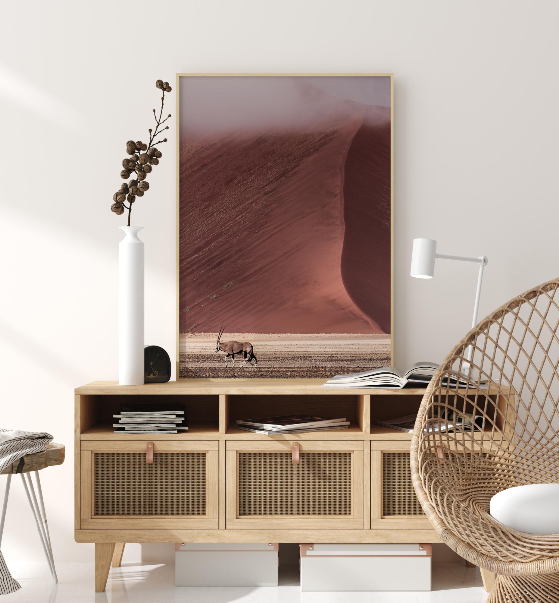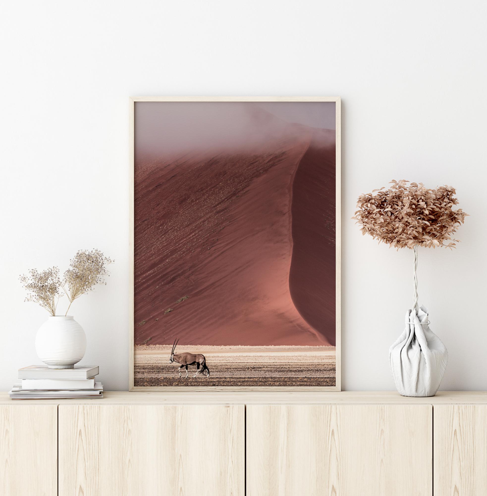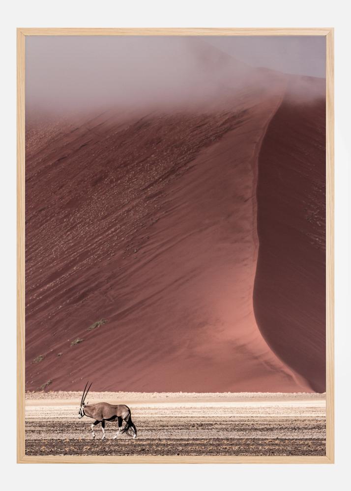 Paprastas plakatas su pavargusiu gazele kirčiantis dykumą. Fone įspūdinga raudona kopų smėlio susilieja su smėlinga žeme nuotraukos apačioje. Gražios spalvos išnyksta dykumos rūke. Kremine spalva fonui šios raminančios spalvos sukuria gražų gamtos vaizdą.