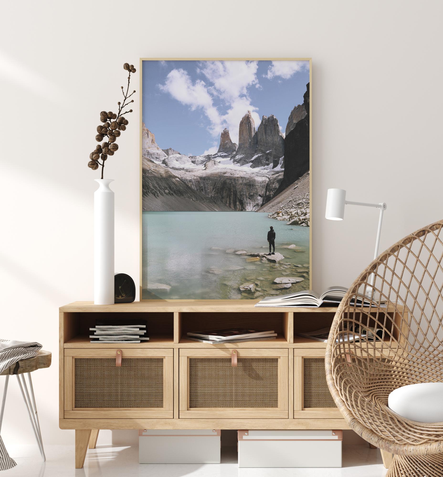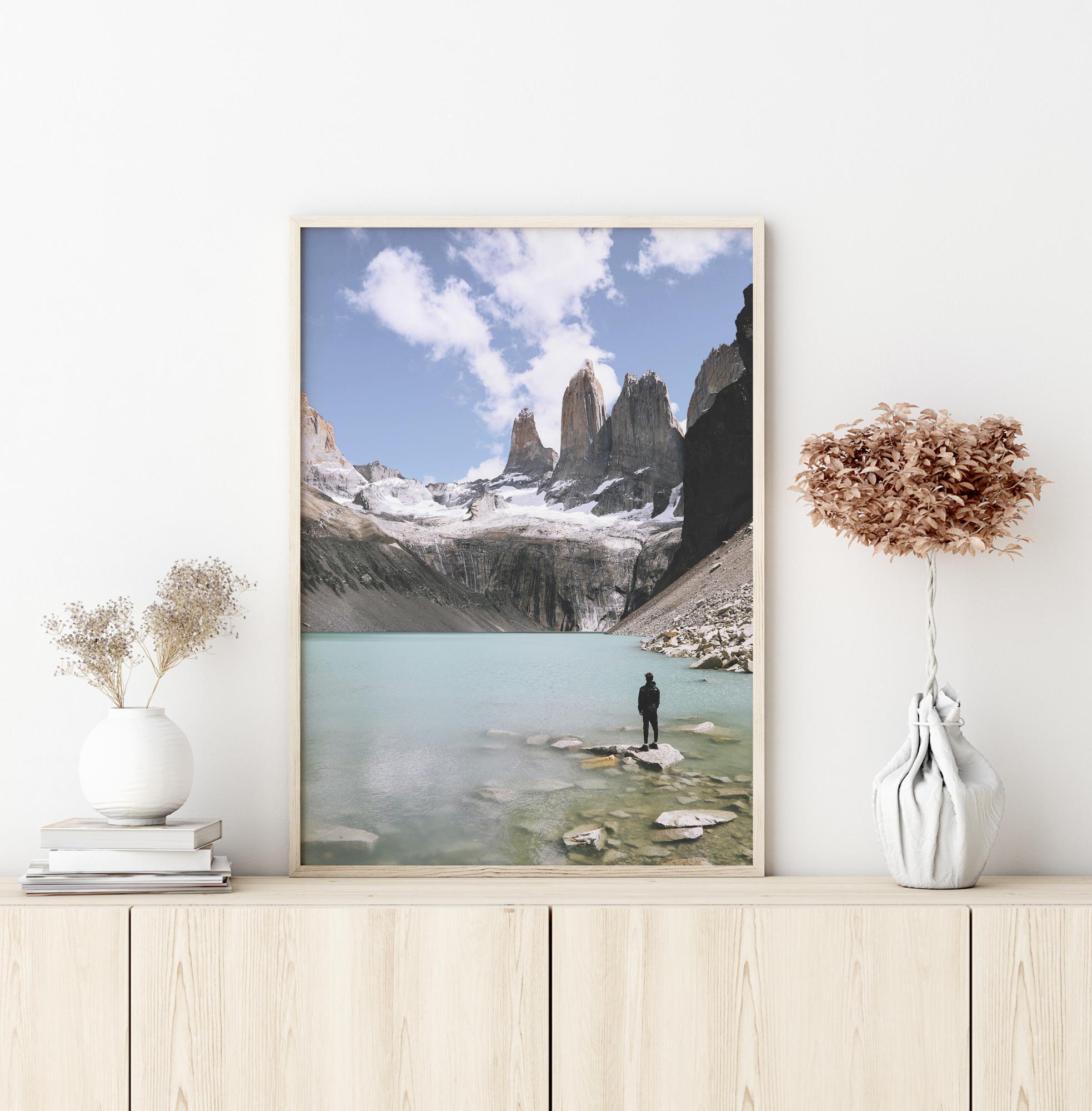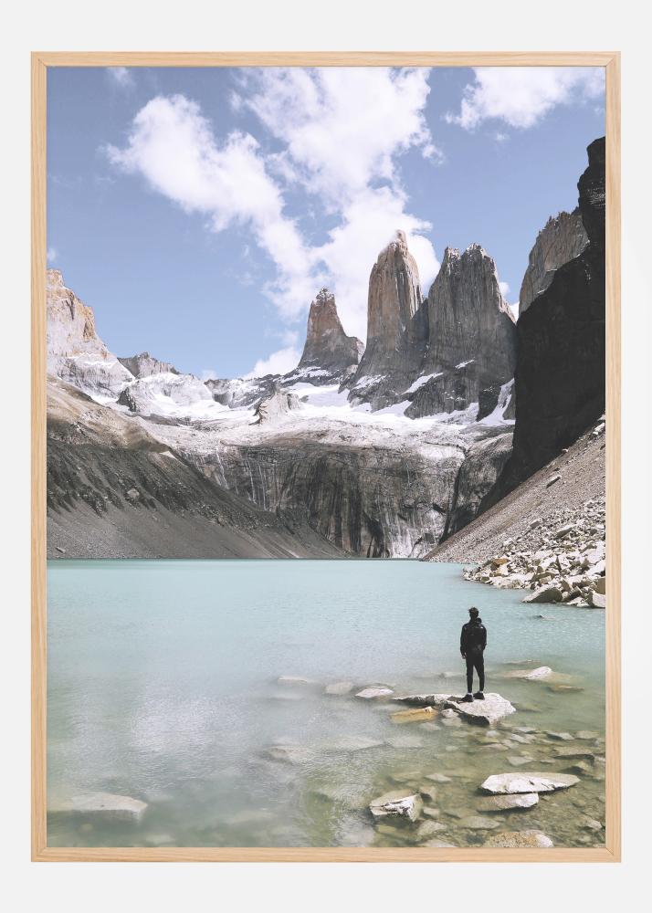 Natūralus plakatas su vienišu figūra, stebinčia kvapą gniaužiančią aplinką. Stovintis ant akmens prie ežero kranto, įspūdingi snieguoti kalnai supa turkio spalvos ežerą. Beveik gali pajusti šaltą orą iš šio magiško vaizdo.