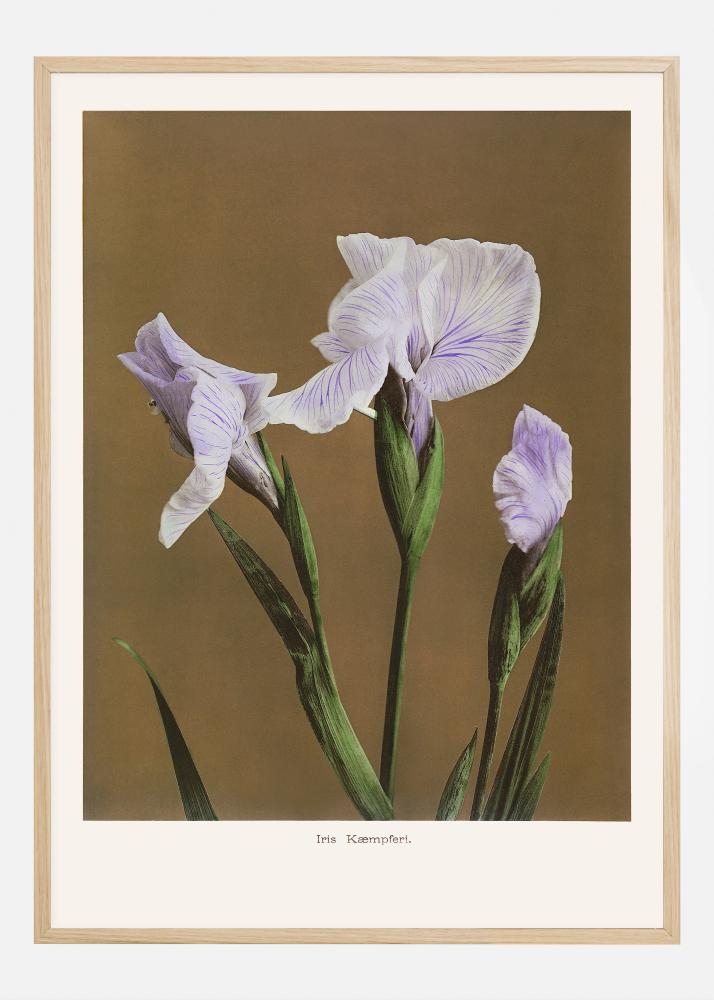 Šis nuostabus plakatas vaizduoja puošniąją Iris Kaempferi, dažnai vadinamą japoniška iris, išdidžiai demonstruojančią savo išskirtinius violetinius ir baltus žiedlapius. Švelnūs žiedai įvairių violetinių atspalvių, nuo pastelinio iki gilesnių violetinių brūkšnių, papildomi plonomis linijomis ir raštais, kurie suteikia rafinuotumo ir detalių gausos pojūtį. Prie vienodai kavos spalvos fono augalo grakšti forma išsiskiria, todėl šis spausdinys tampa ryškiu dekoro elementu bet kokiame interjere.