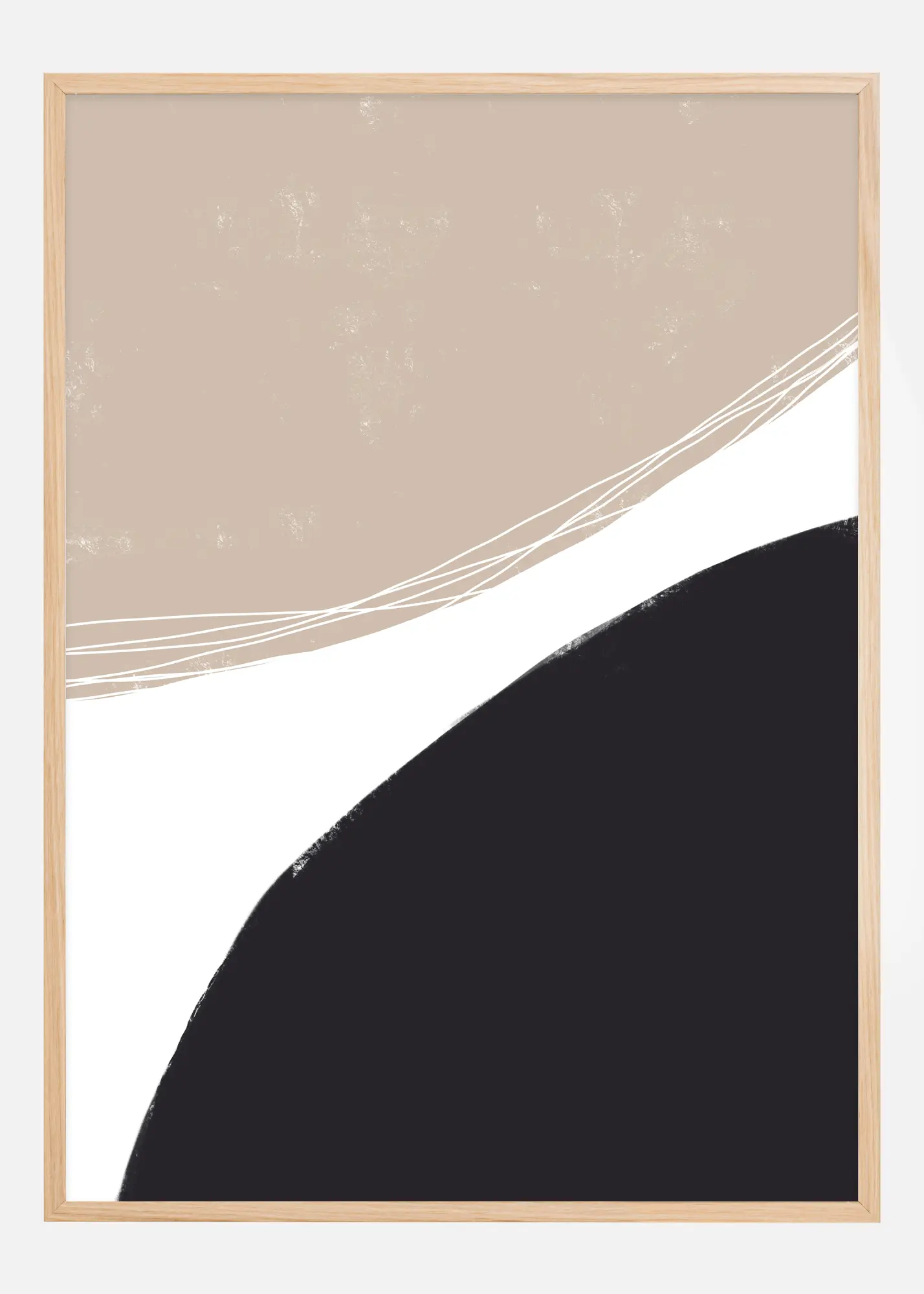 Šis minimalistinis ir asketiškas plakatas pateikia raminančią ir subalansuotą kreivų linijų bei organinių formų kompoziciją. Didelė, tamsi forma, dominuojanti apatinėje paveikslėlio dalyje, suteikia pagrindo ir svorio pojūtį, o šviesesnės linijos viršuje siūlo švelnų ir dinamišką elementą, kontrastuojantį su tamsia forma. Neutralioje spalvų paletėje yra smėlio ir juodos atspalvių, kurie sukuria šiuolaikinės elegancijos pojūtį.