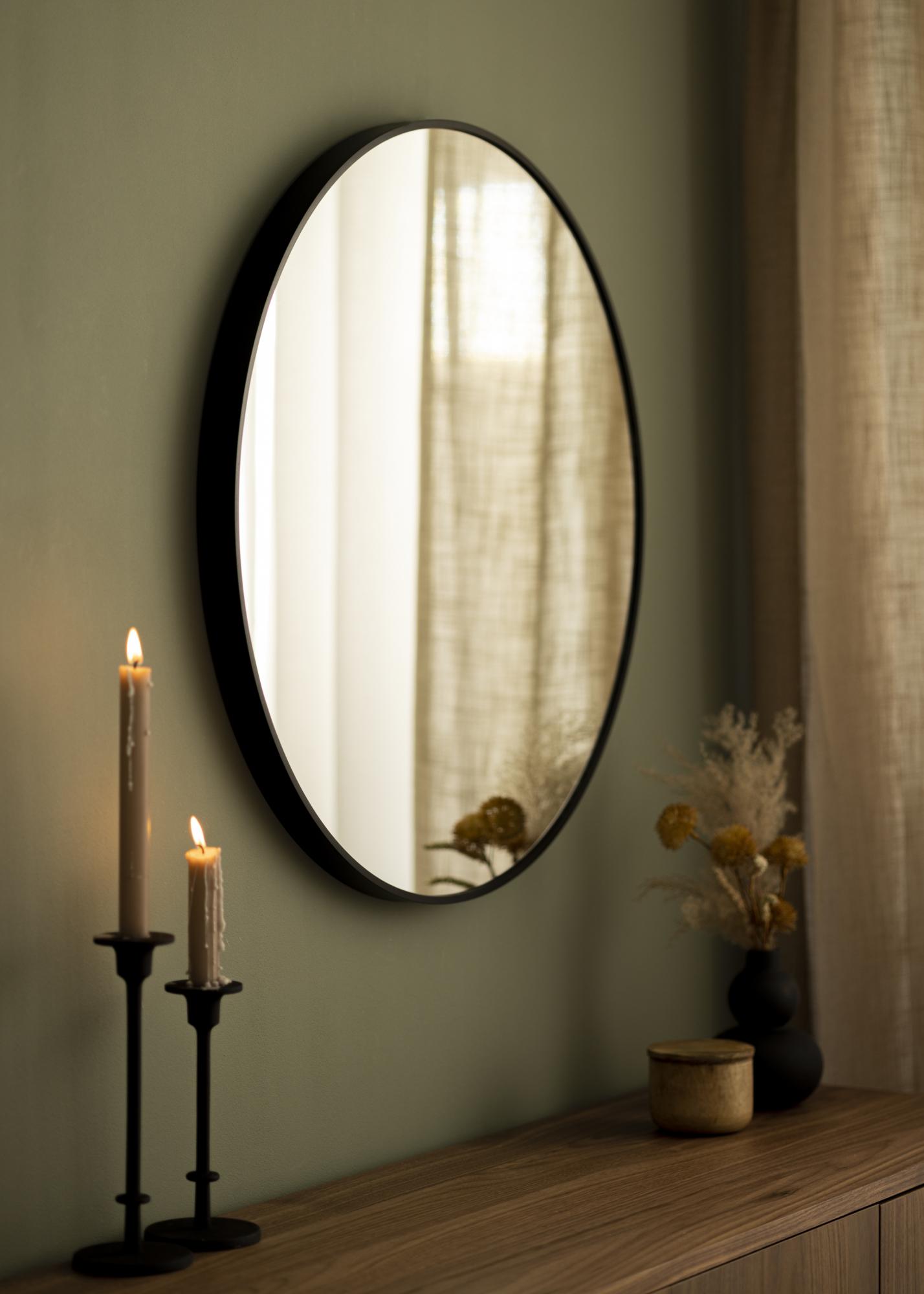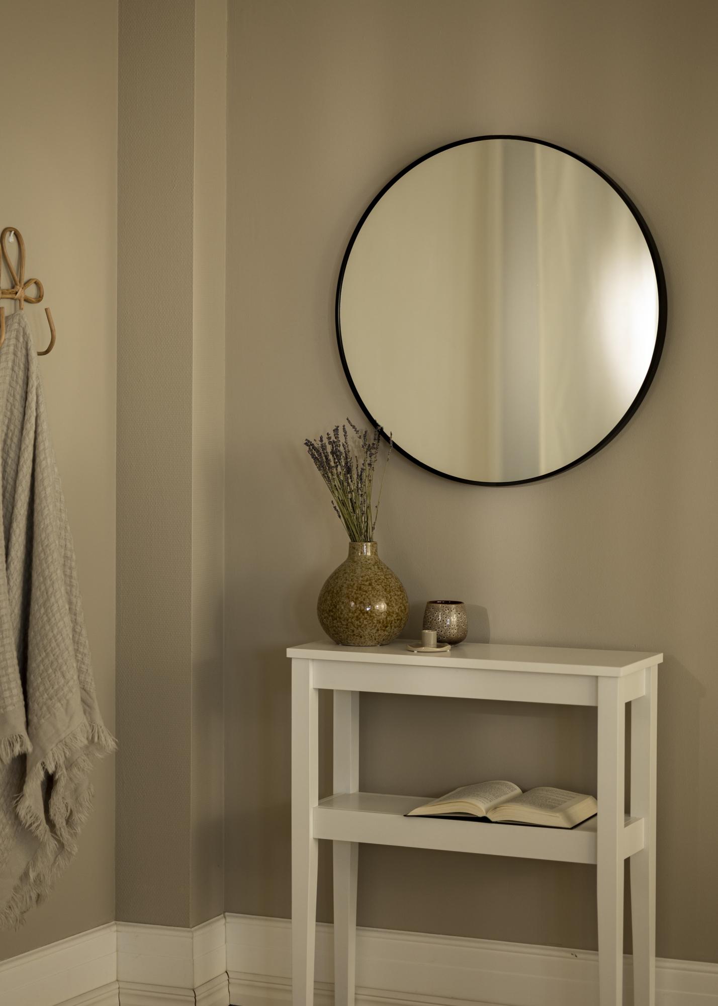 KAILA Apvalus Veidrodis Kraštas Juodas yra apvalus veidrodis su elegantišku plonu metaliniu rėmu, nudažytu matiniu juodu, kuris suteikia pramoninį ir madingą įvaizdį. Rėmo gylis – priklausomai nuo dydžio – yra nuo 30 iki 40 mm, todėl veidrodžio stiklas iškyla šiek tiek nuo sienos ir sukuria įspūdingą 3D efektą. Rėmo gylis taip pat suteikia veidrodžiui solidumą, tuo pačiu išlaikant minimalistinį išvaizdą. Tobulas apvalus veidrodis, kurį galima patalpinti bet kuriame kambaryje, kuriame norite pridėti funkcionalumą ir elegantišką švedišką dizainą!