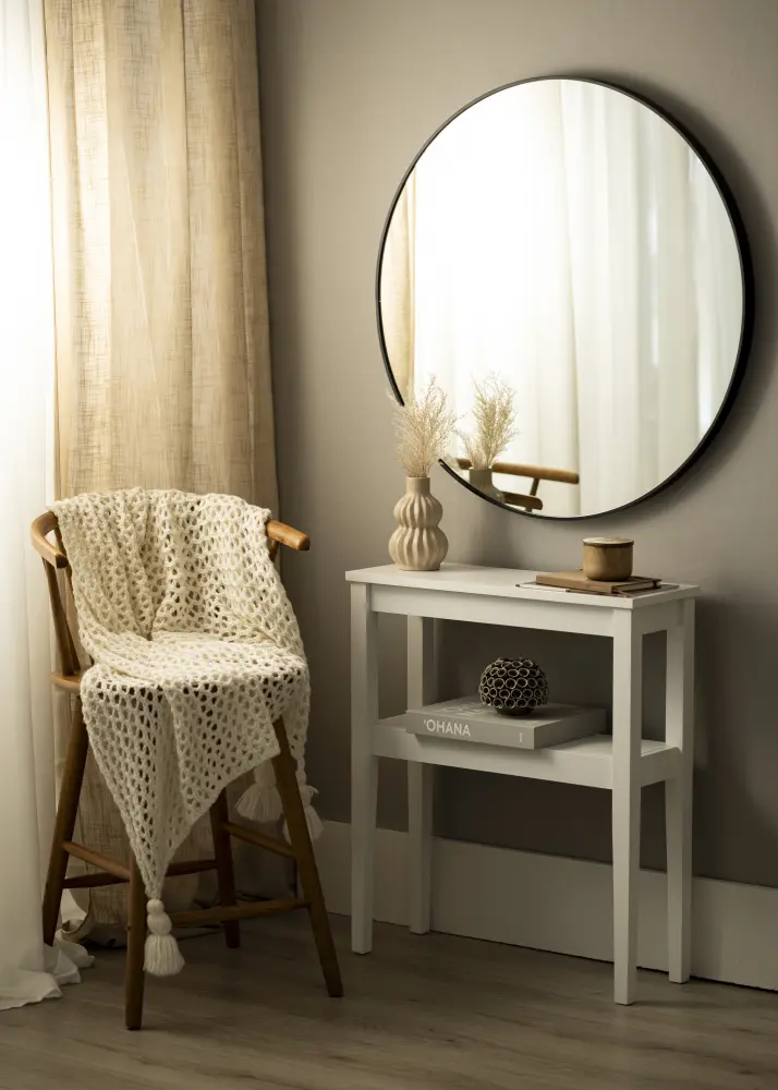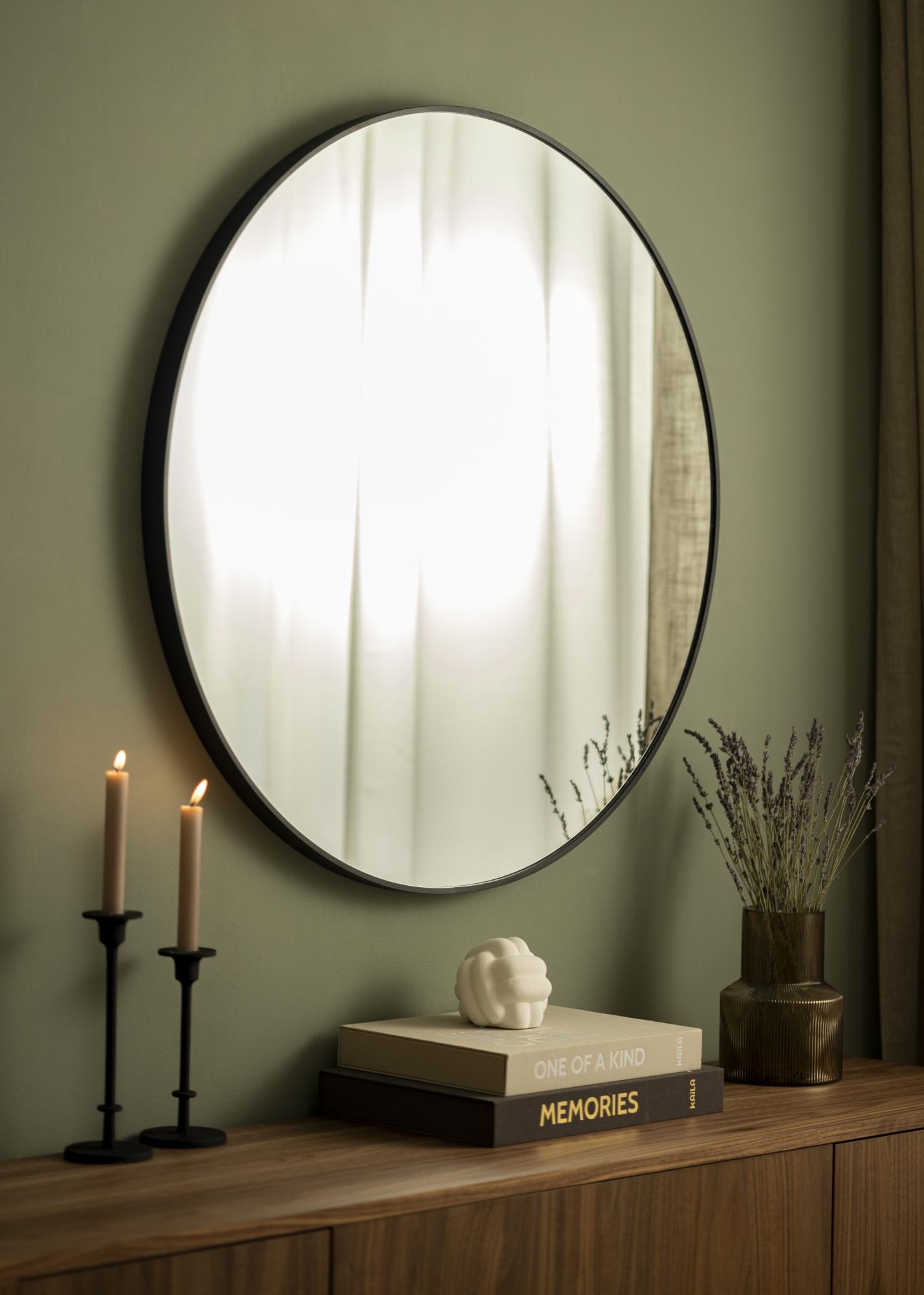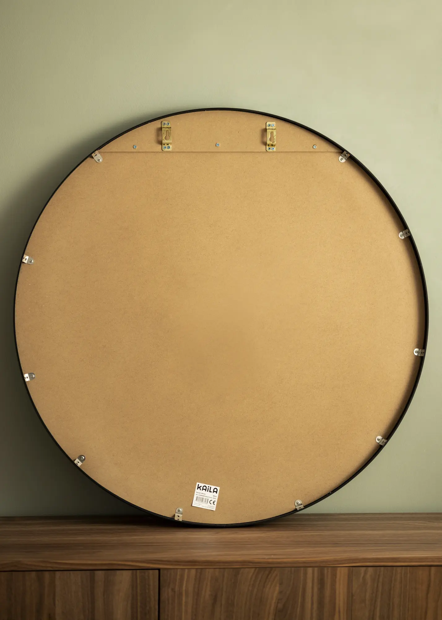 KAILA Apvalus Veidrodis Kraštas Juodas yra apvalus veidrodis su stilingu plonu metalo rėmu, nuspalvintu matine juoda spalva, suteikiančia pramoninę ir madingą išvaizdą. Rėmas turi – priklausomai nuo dydžio – gylį nuo 30-40 mm, todėl veidrodžio stiklas išsikiša nuo sienos ir sukuria įspūdingą 3D efektą. Rėmo gylis taip pat suteikia veidrodžiui solidumo jausmą, tuo pačiu išlaikydamas minimalistinę išvaizdą. Puikus apvalus veidrodis, kurį galite padėti bet kuriame kambaryje, kur norite pridėti funkcionalumą ir stilingą švedišką dizainą!