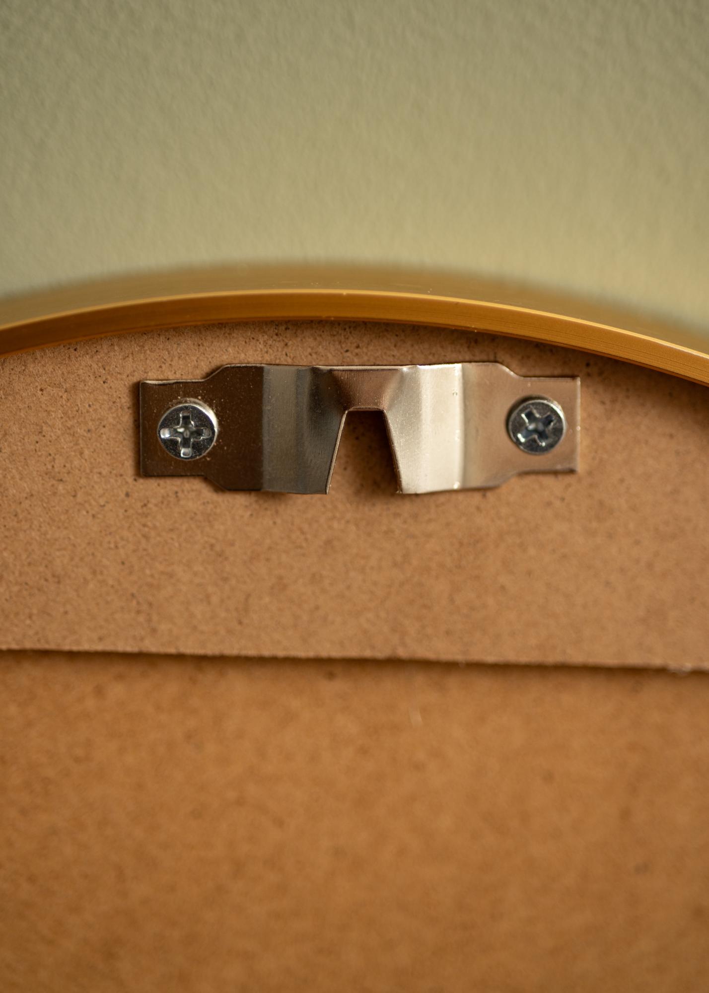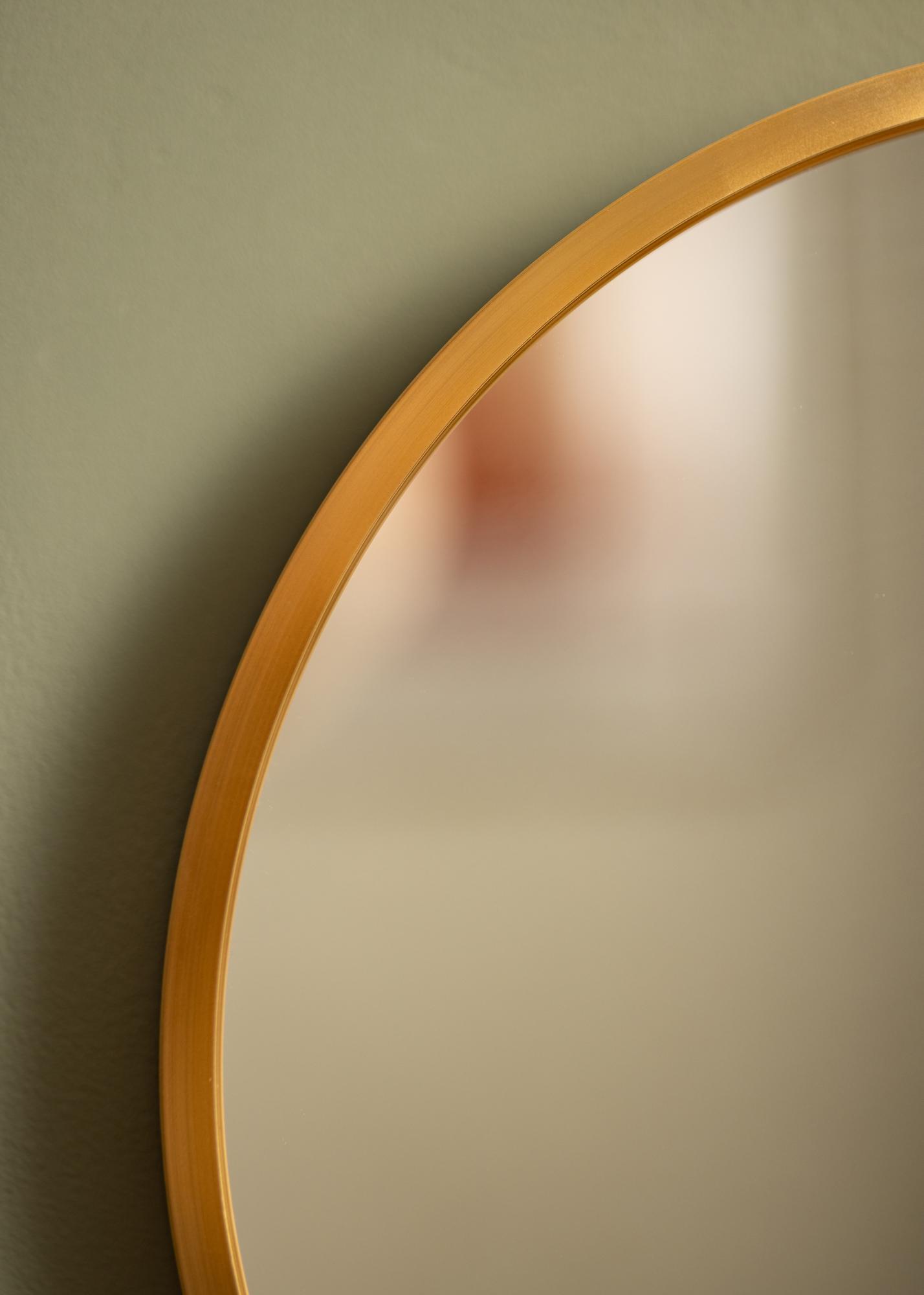 Apskritas veidrodis su stilingu švedišku dizainu ir metaliniu rėmu, turinčiu gražią auksinę apdailą. Rėmas turi šveistą paviršių, kas suteikia jo gražiai auksinei spalvai šiek tiek matinę išvaizdą. Rėmas taip pat madingai plonas, bet tuo pačiu metu – priklausomai nuo dydžio – turi gylį nuo 30 iki 40 mm, kas leidžia jį šiek tiek išsikišti nuo sienos ir sukuria įspūdingą 3D efektą. Rėmo gylis taip pat suteikia veidrodžiui solidumo ir tvirtumo jausmą, nepašalinant minimalistinės veidrodžio pojūčio.