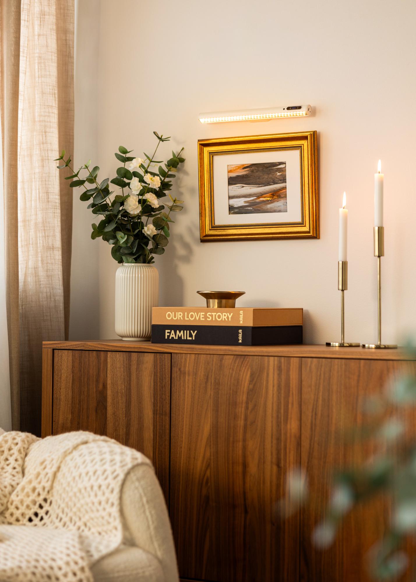 KAILA Illuminate yra stilingas ir baterijomis maitinamas paveikslų apšvietimas baltos spalvos apdaila, puikiai tinka išryškinti jūsų paveikslus be trukdančių laidų. Belaidė konstrukcija leidžia lengvai ir lanksčiai montuoti, nereikalaujant galvoti apie elektros lizdus. Elegantiška balta spalva suteikia modernią ir diskretišką išraišką, kuri dera su įvairiais interjero stiliais, o tolygus apšvietimas išryškina detales ir spalvas jūsų mene. Lengva įdiegti ir naudoti – praktiškas ir patogus sprendimas jūsų sienų menui.