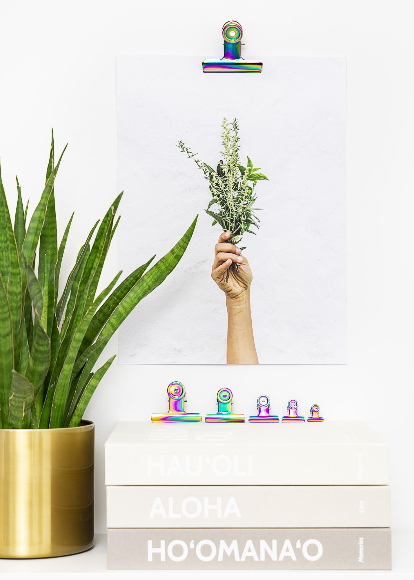 Skanus vaivorykštės spalvų metalinis spaustukas su blizgia apdaila, suteikiantis jūsų plakatams ir atspaudams madingą ir šiek tiek kitokį pakabinimą. Plakato spaustuko stipri, bet lanksti anga leidžia pritvirtinti tiek ploniausią popierių, tiek storesnius plakatus. Jei turite didelį plakatą, kurį norite pakabinti, galite naudoti dvi metalines spaustukas. Plakato spaustuko dizainas yra stilizuotas ir paprastas, o dėl apvalios viršūnės skylių lengvai pritvirtinsite jį prie sienos naudodami mažą vinį ar varžtą.