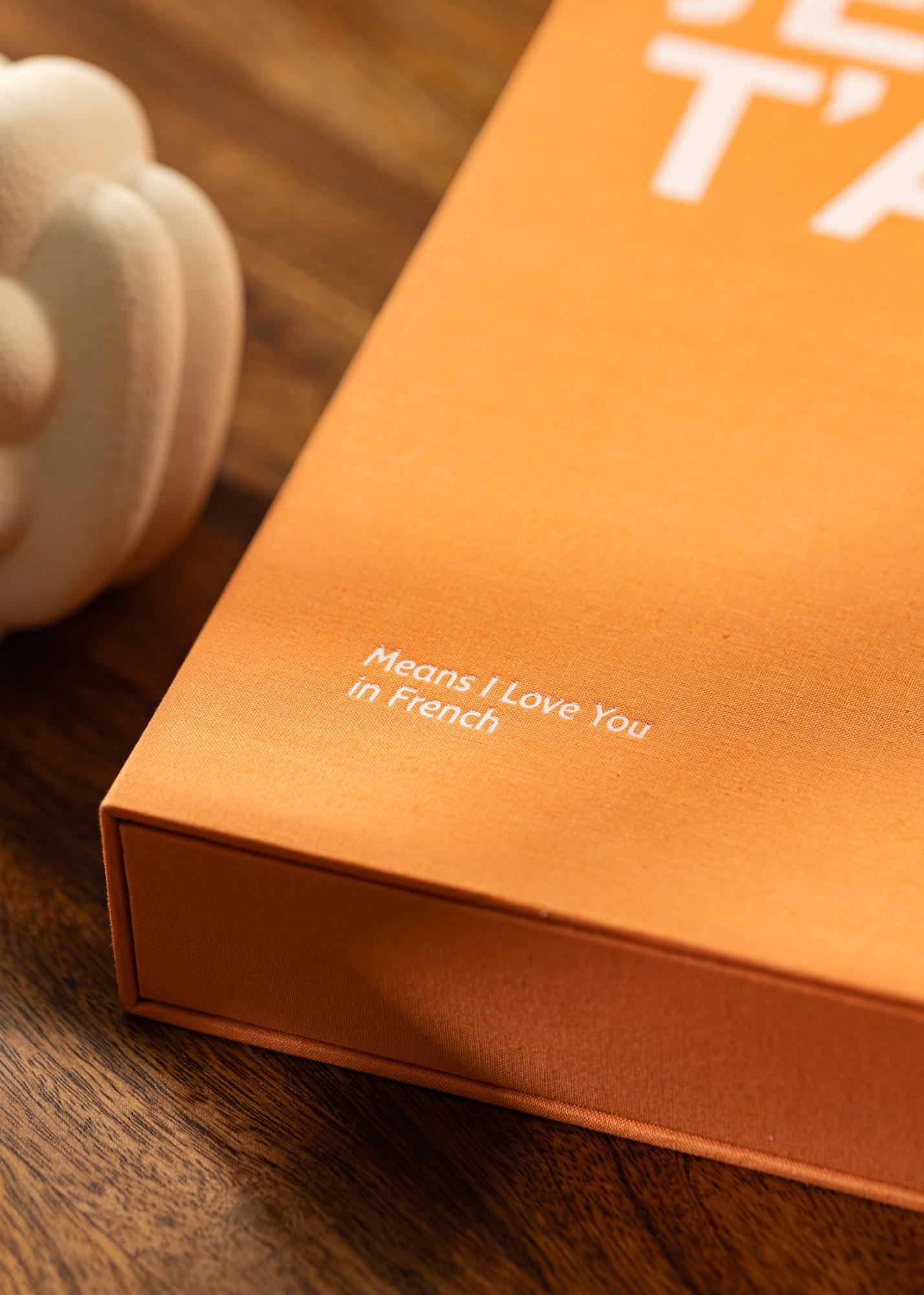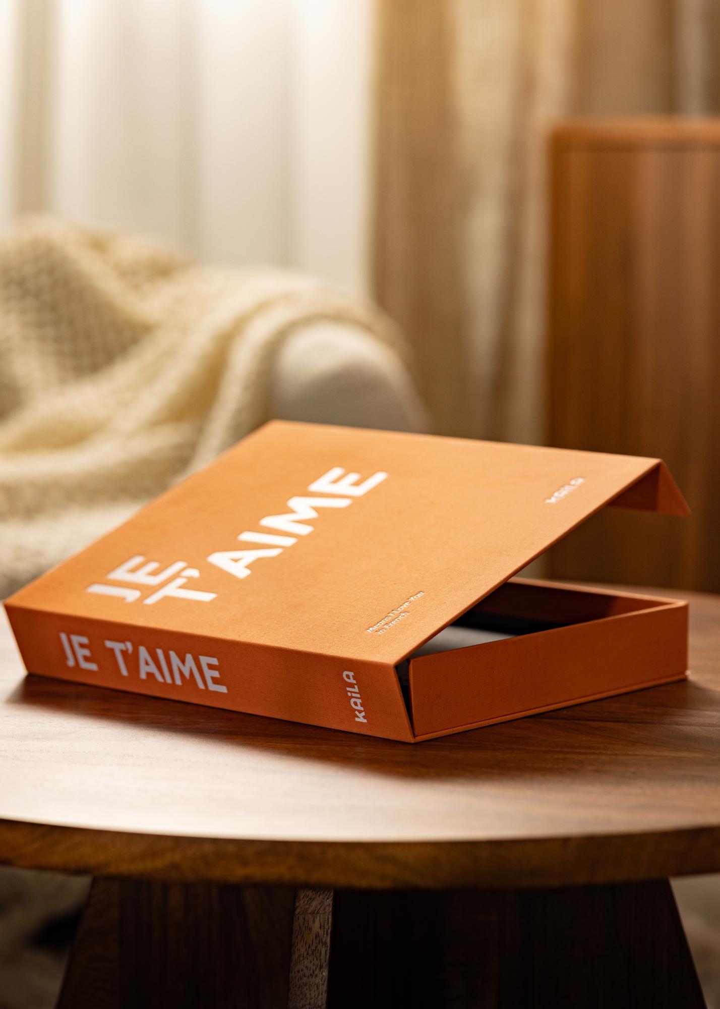 Šiame Coffee Table Albume gausu stiliaus, prabangos ir romantikos. Išskirtinis dizainas sukurtas kaip dėžutė su audiniu apklotu viršeliu stilingos oranžinės spalvos. Viršelį puošia baltas tekstas su fraze „JE T'AIME“, po kurio pateikiamas paaiškinantis antraštė „Tai reiškia Myliu tave prancūziškai“. Viduje yra gražiai dekoruotas vidinis viršelis ir 60 juodų albumų puslapių (30 lapų). Kadangi nuotraukas įklijuojate patys, turite galimybę būti kūrybingais.