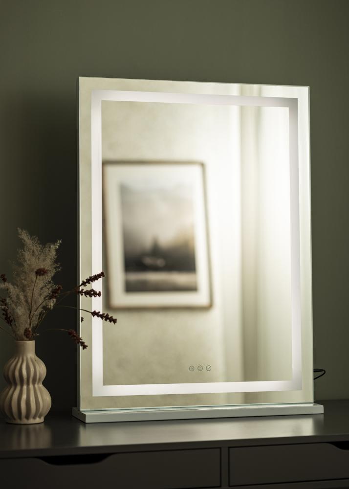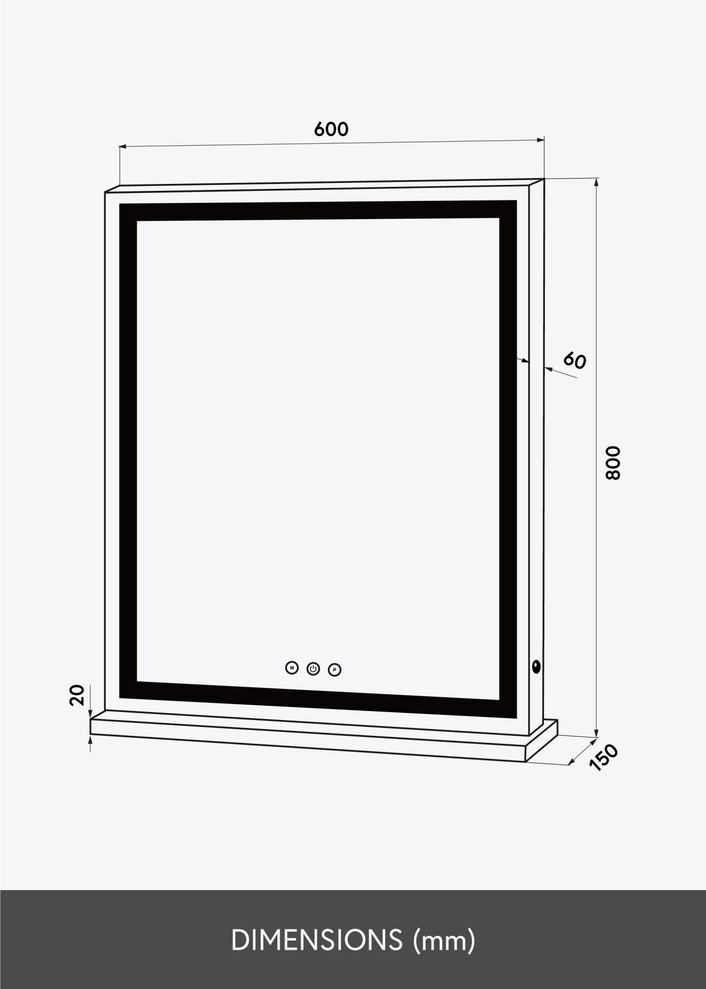 Šis makiažo veidrodis yra tobula minimalizmo ir modernumo kombinacija. Jo klasikinė forma ir modernus LED apšvietimo juostos sudaro rėmą aplink 80x60 cm dydžio veidrodžio paviršių. Veidrodis turi nuimamą stovą, taigi jūs galite pasirinkti, ar nori, kad veidrodis stovėtų ant stalo ar kabėtų ant sienos. Jis montuojamas vertikaliai.