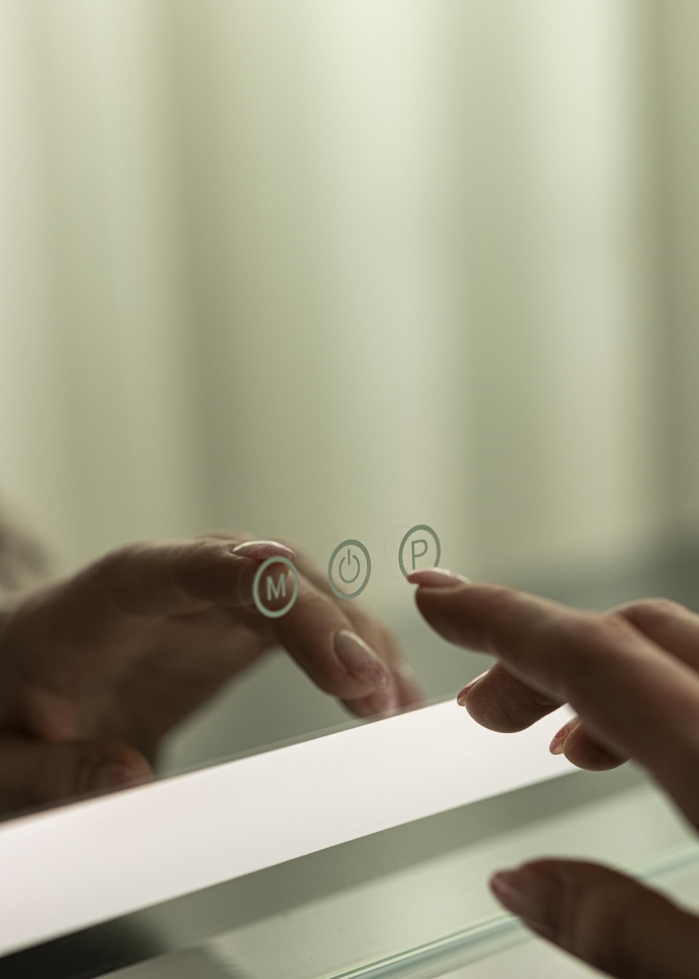 Veidrodžio apatinėje dalyje yra trys lietimo mygtukai – vienas įjungia ir išjungia apšvietimą, o du keičia šviesos nustatymus. Mygtukas „M“ reguliuoja šviesos spalvos temperatūrą tarp 3000K-6000K, o „P“ mygtukas pritemdo apšvietimą. Kitaip tariant, galite nustatyti tobulą apšvietimą bet kuriai progai.