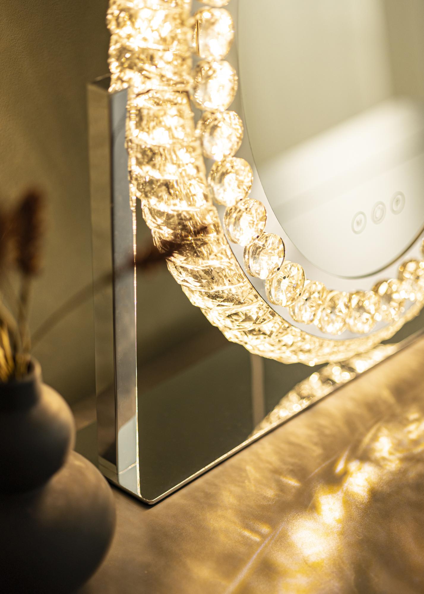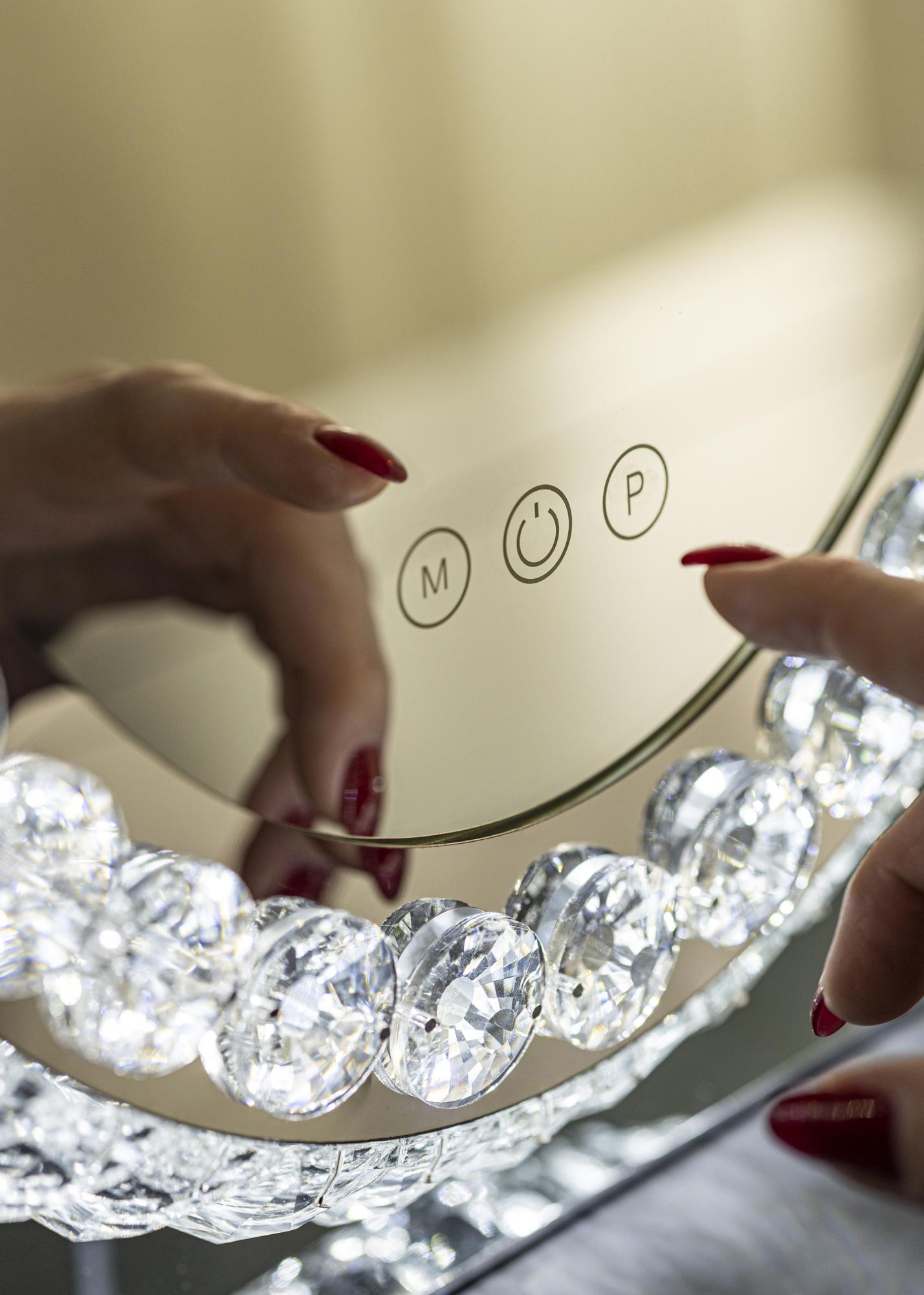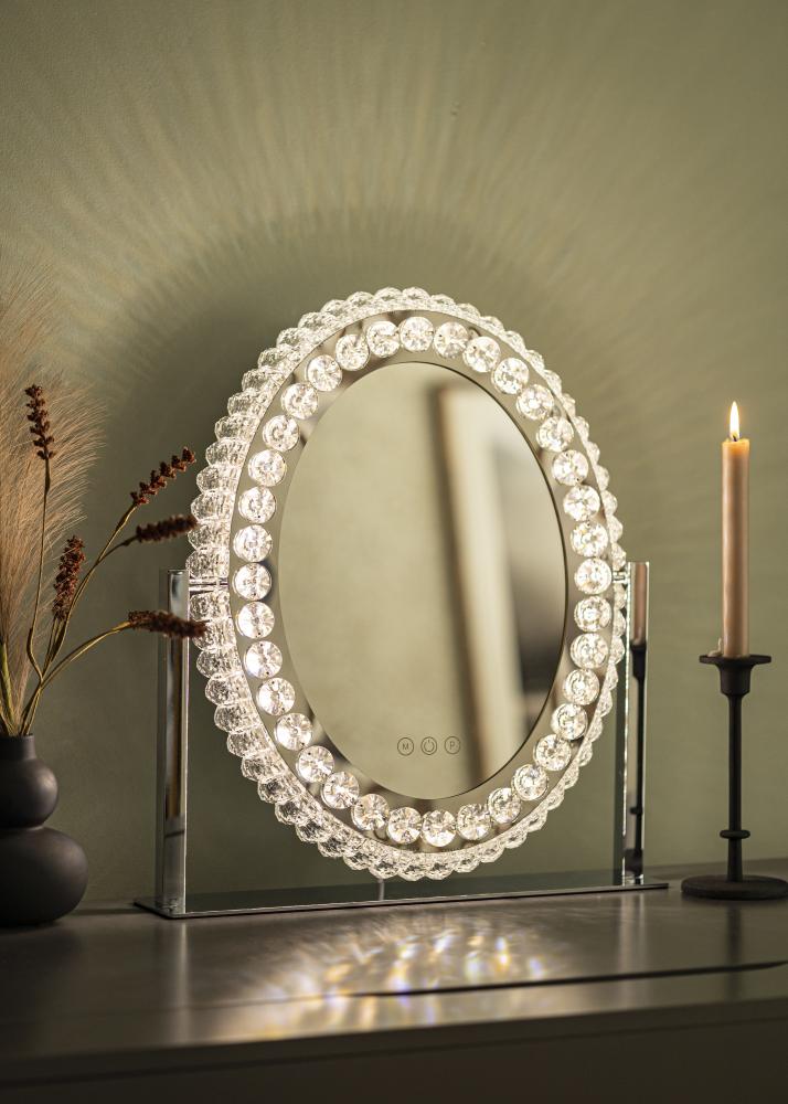 Tai klasikinio stiliaus makiažo veidrodis su dekoratyviniu rėmu ir LED apšvietimu. Ovalo formos veidrodžio rėmas su kristalais panašiais papuošimais suteikia jam prabangų išvaizdą, puikiai derantį tiek miegamajame, tiek svetainėje. Jis yra pagamintas iš nerūdijančio plieno ir turi stovinčią konstrukciją.