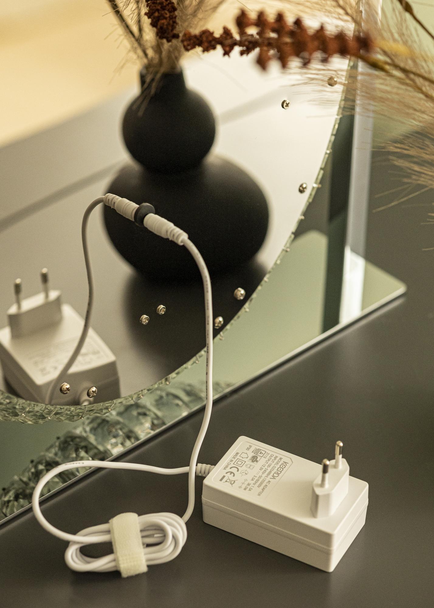 Integruotas LED apšvietimas suteikia malonų švytėjimą – puikų, kai atliekate makiažą ir ruošiatės dienai. Be to, galite reguliuoti šviesą prisilietimo mygtukais, esančiais veidrodžio apatinėje dalyje. Su "M" mygtuku galite keisti apšvietimo spalvos temperatūrą, o su "P" mygtuku galite reguliuoti šviesos stiprumą iki pageidaujamo lygio. Taip pat yra įjungimo/išjungimo mygtukas, skirtas įjungti ir išjungti veidrodžio apšvietimą. Elektros jungtis atliekama su kištuku.