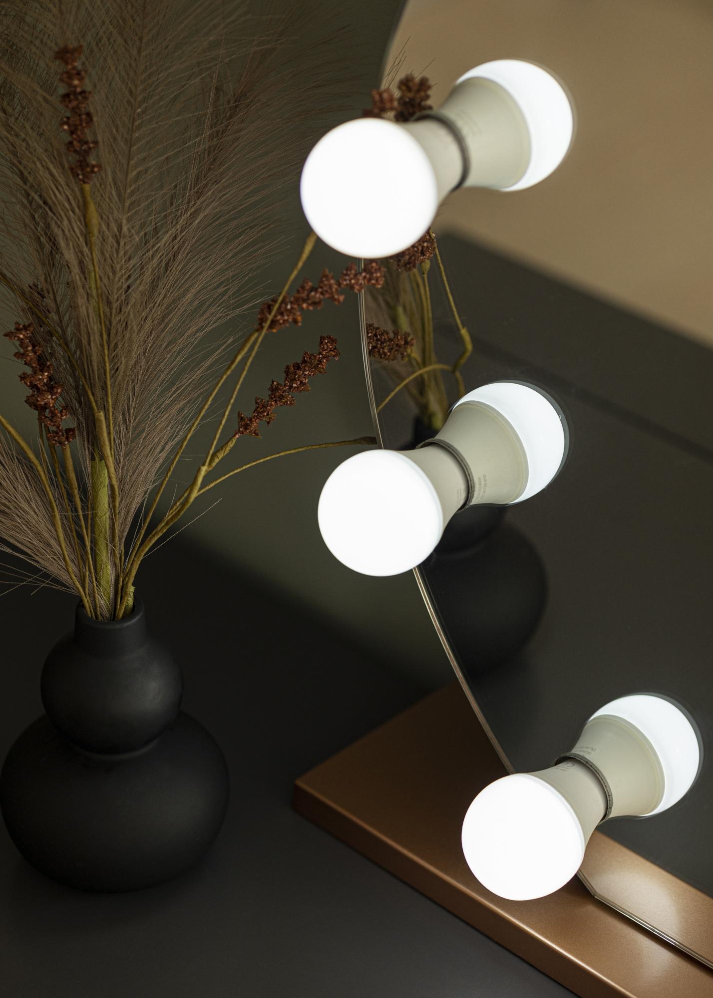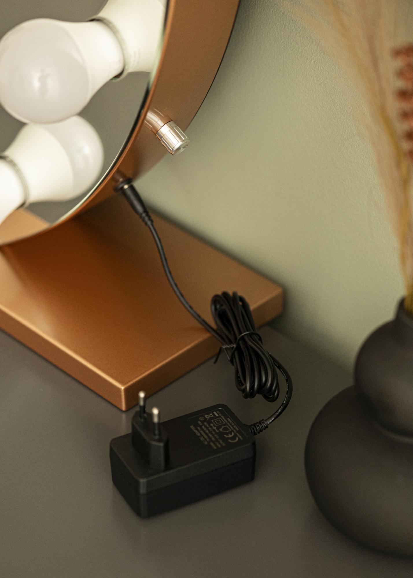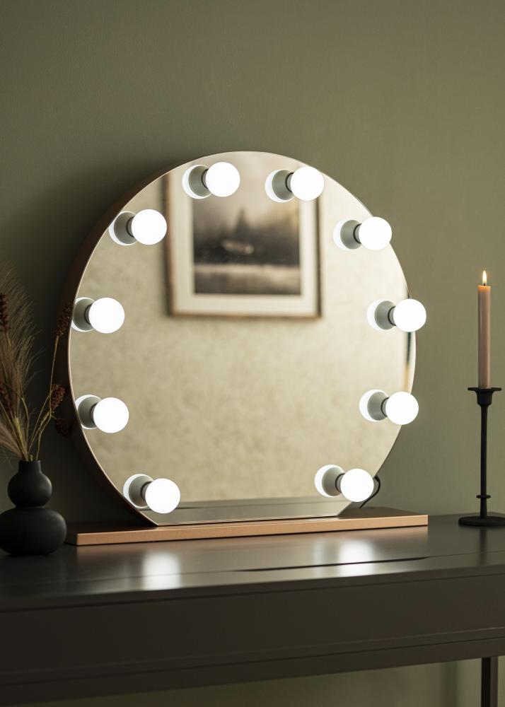Leiskite šiam rožinio aukso spalvos makiažo veidrodžiui suteikti jūsų kambariui prabangos. Veidrodžio 10 lempučių, išdėstytų rėmo pavidalu aplink veidrodžio paviršių, skleidžia baltą, šaltą ir vienodą šviesą. Lemputės turi E27 lizdą ir yra keičiamas. Dėl išmaniosios pritemdymo funkcijos galite reguliuoti šviesos intensyvumą pagal savo poreikius. Viskas, ką jums reikia padaryti, yra pasukti mygtuką ant vienos vedrodžio šoninės dalies.
