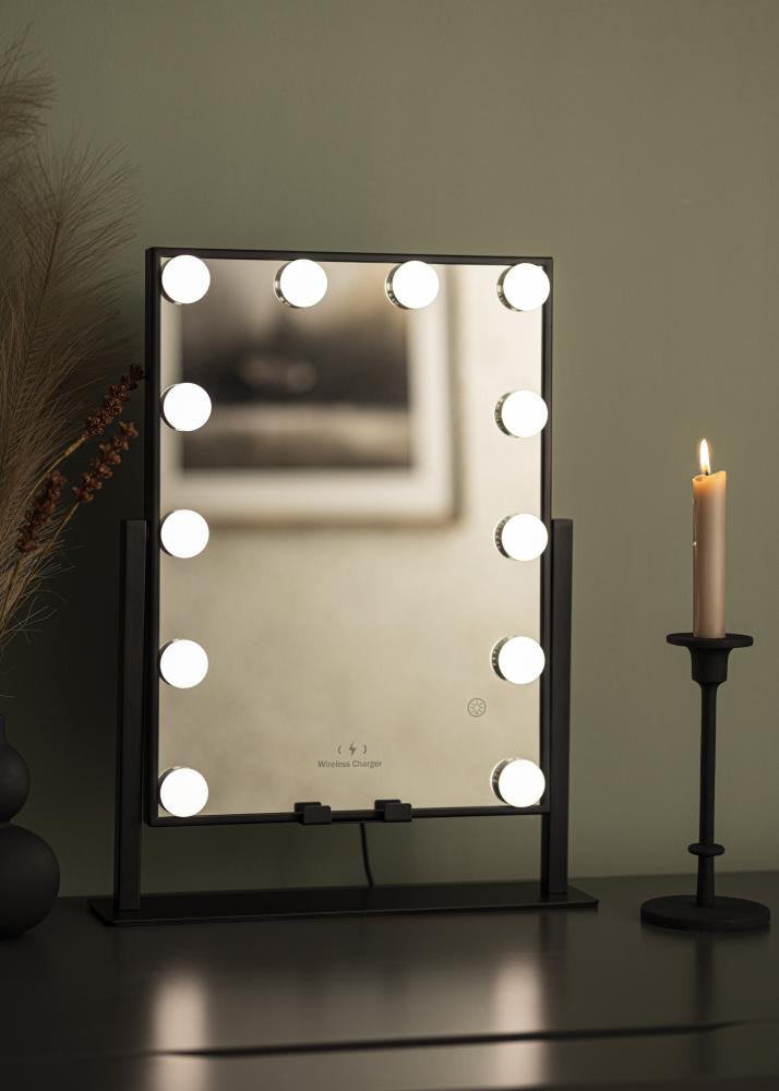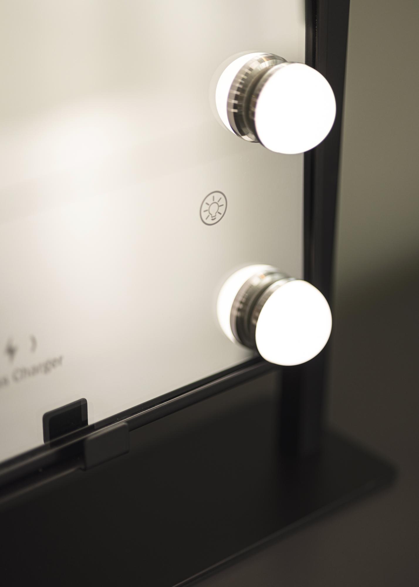 Norite įkrauti savo išmanųjį telefoną tuo pat metu, kai sėdite priešais veidrodį? Jokių problemų. Šis makiažo veidrodis turi integruotą įkrovimą visiems išmaniesiems telefonams, kurie palaiko belaidį įkrovimą. Tiesiog padėkite savo įrenginį nurodytoje vietoje ant veidrodžio ir įkraukite jį 5V/2A (10 W) galia. Funkcija veikia nuolat, kai veidrodis yra įjungtas.