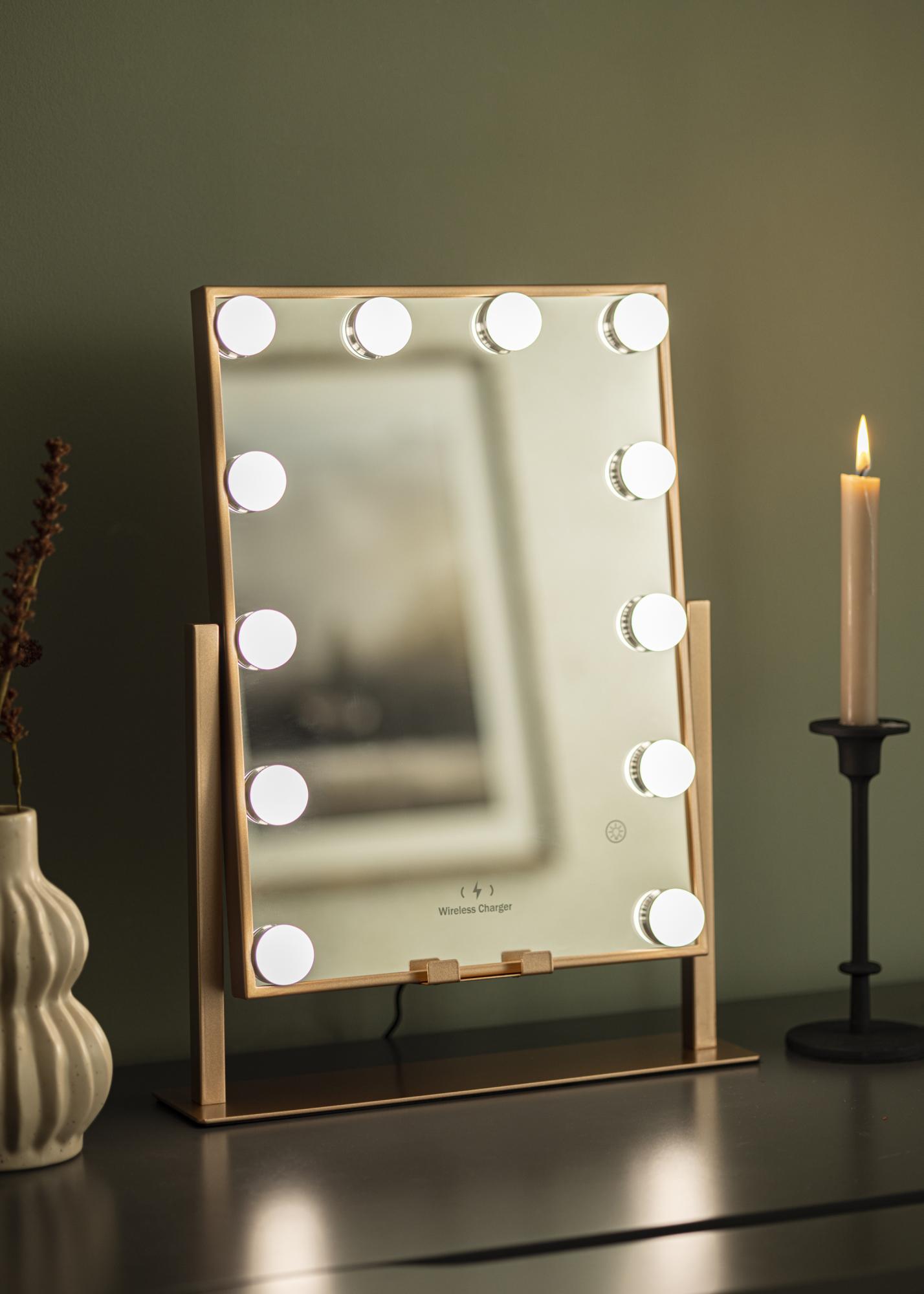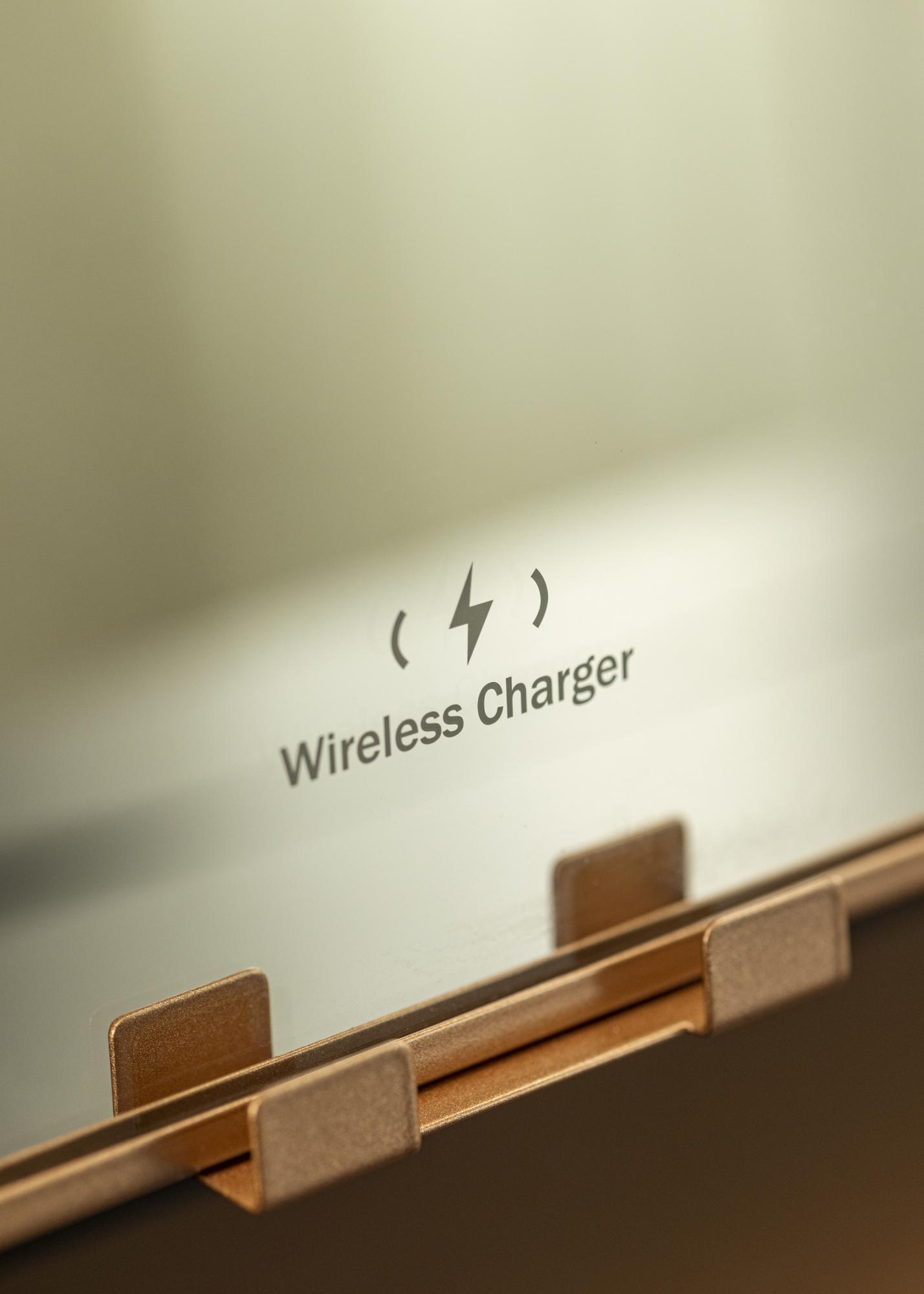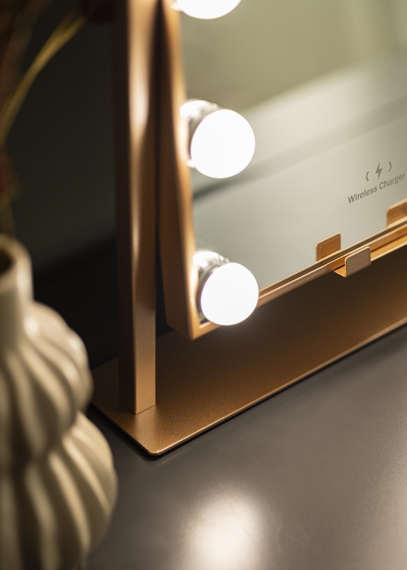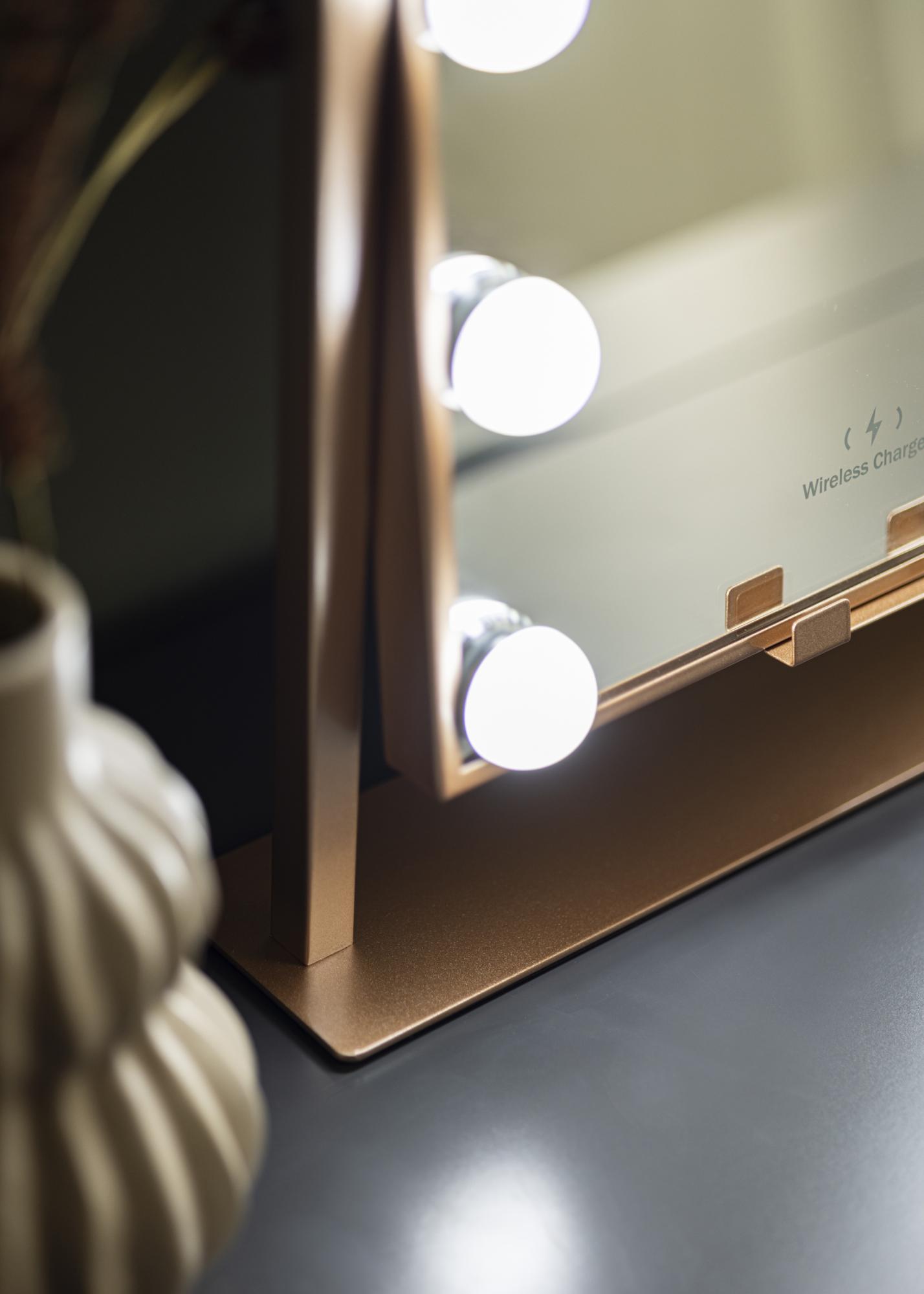 Tai yra makiažo veidrodis rožinio aukso atspalvio su prabangia belaidžio įkrovimo funkcija! Kai veidrodis įjungtas, padėkite savo telefoną ant pritaikytos vietos, kad jį įkrautumėte 5V/2A (10W) galia. Įkrovimo funkcija veikia visoms išmaniesiems telefonams, palaikantiems belaidį įkrovimą. Kitos protingos funkcijos, kurias turi šis veidrodis, yra reguliuojamas veidrodžio paviršius ir integruotas LED apšvietimas, kuris suteikia gerą apšvietimą, kai taikote makiažą. Apšvietimą sudaro 12 LED lempučių, kurios gražiai įrėmina veidrodžio paviršių ir suteikia visam veidrodžiui stilingą išvaizdą. Apšvietimas yra reguliuojamas, o norėdami nustatyti apšvietimą iki norimo šviesumo lygio, laikykite veidrodžio priekyje esančią prisilietimo mygtuką kelias sekundes.