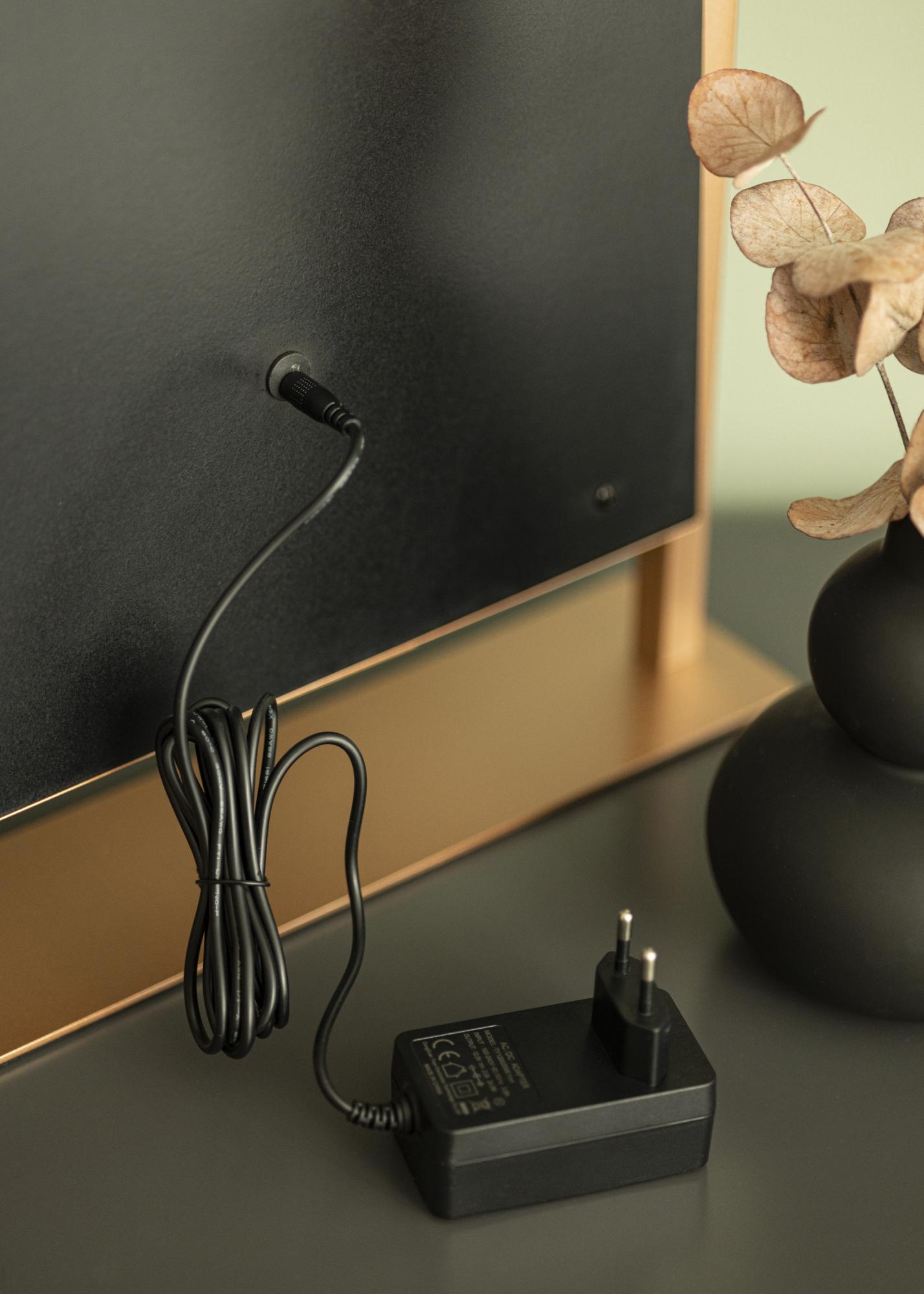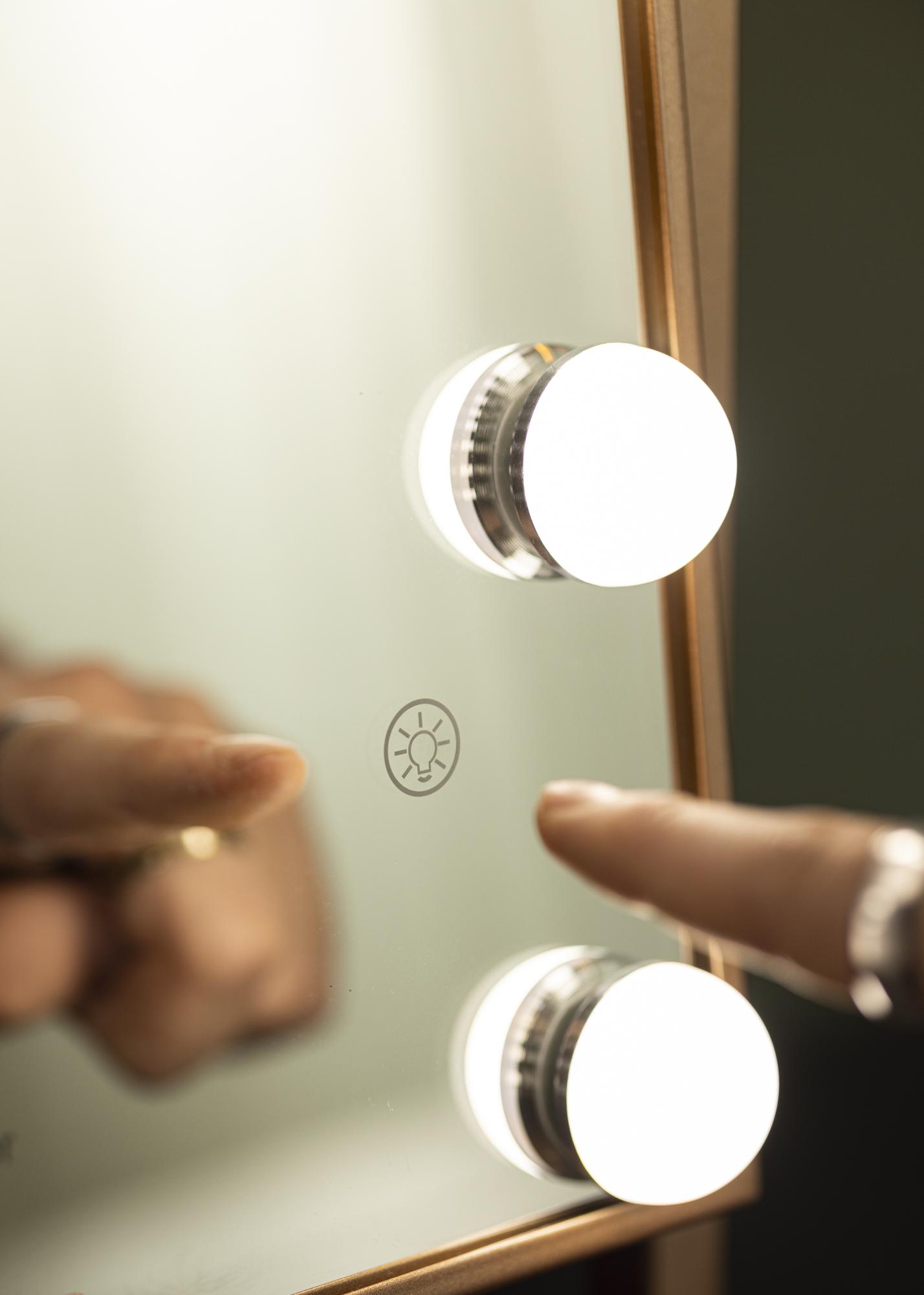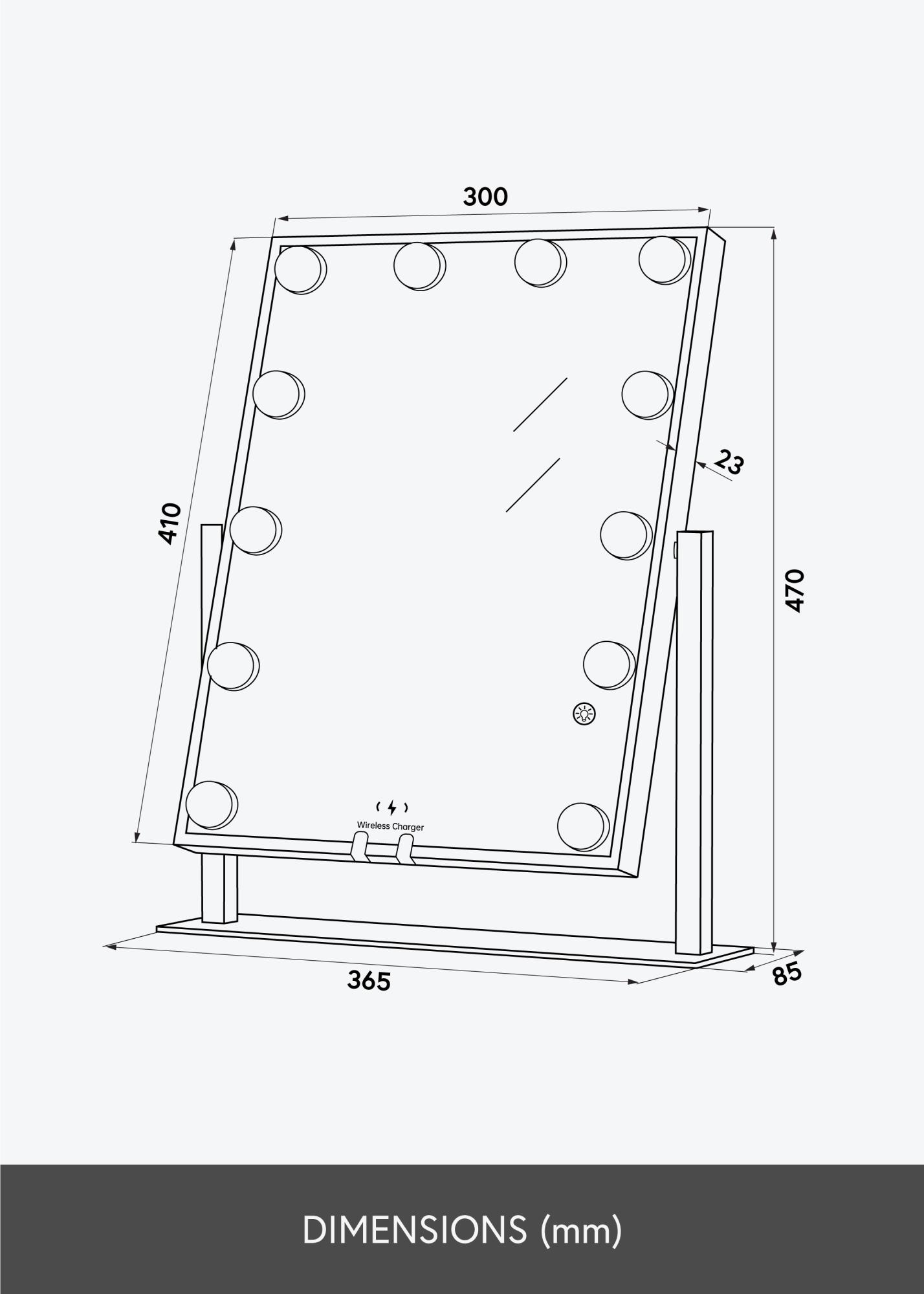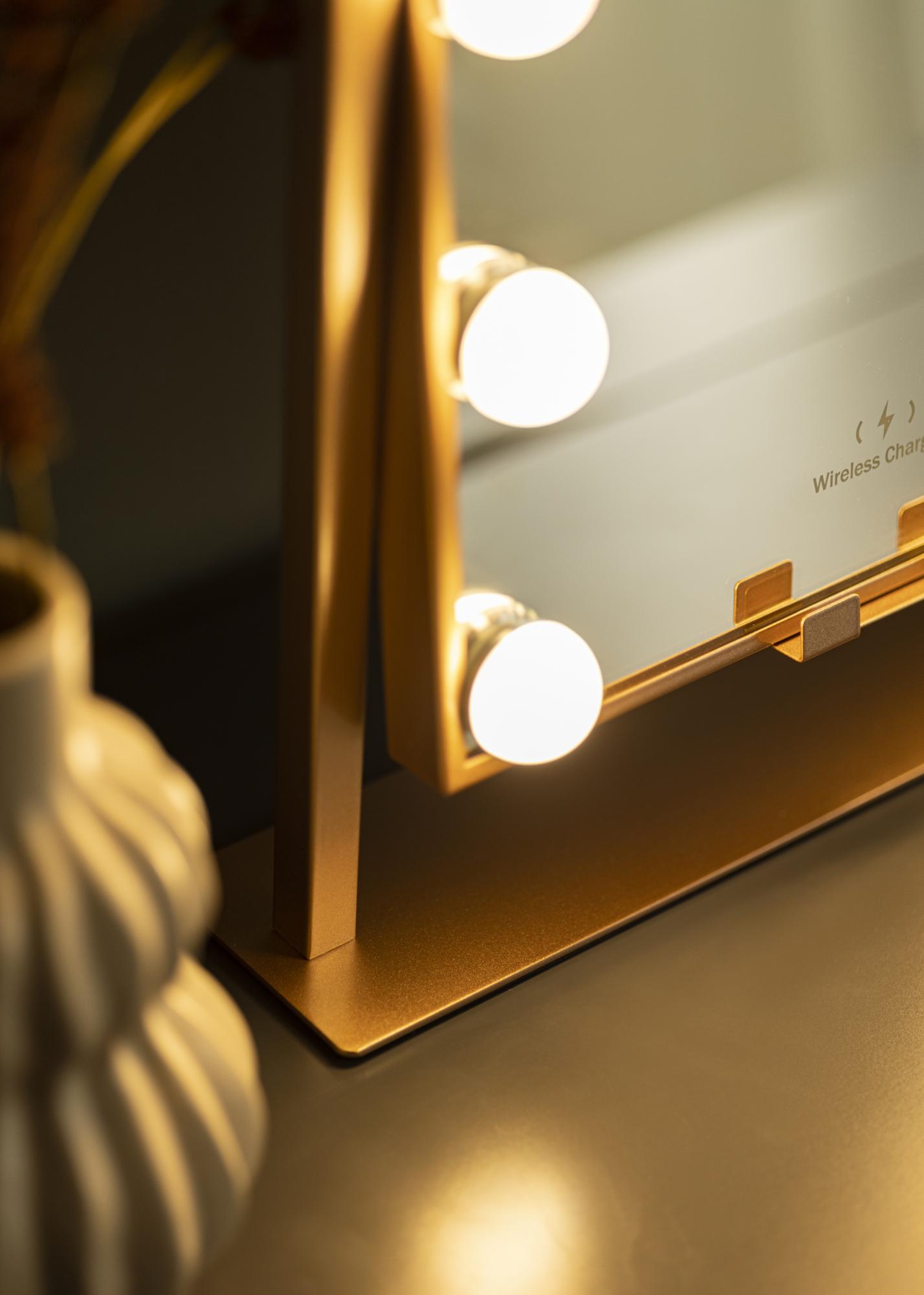 Tai yra makiažo veidrodis rožinio aukso atspalvio su prabangia belaidžio įkrovimo funkcija! Kai veidrodis įjungtas, padėkite savo telefoną ant pritaikytos vietos, kad jį įkrautumėte 5V/2A (10W) galia. Įkrovimo funkcija veikia visoms išmaniesiems telefonams, palaikantiems belaidį įkrovimą. Kitos protingos funkcijos, kurias turi šis veidrodis, yra reguliuojamas veidrodžio paviršius ir integruotas LED apšvietimas, kuris suteikia gerą apšvietimą, kai taikote makiažą. Apšvietimą sudaro 12 LED lempučių, kurios gražiai įrėmina veidrodžio paviršių ir suteikia visam veidrodžiui stilingą išvaizdą. Apšvietimas yra reguliuojamas, o norėdami nustatyti apšvietimą iki norimo šviesumo lygio, laikykite veidrodžio priekyje esančią prisilietimo mygtuką kelias sekundes.