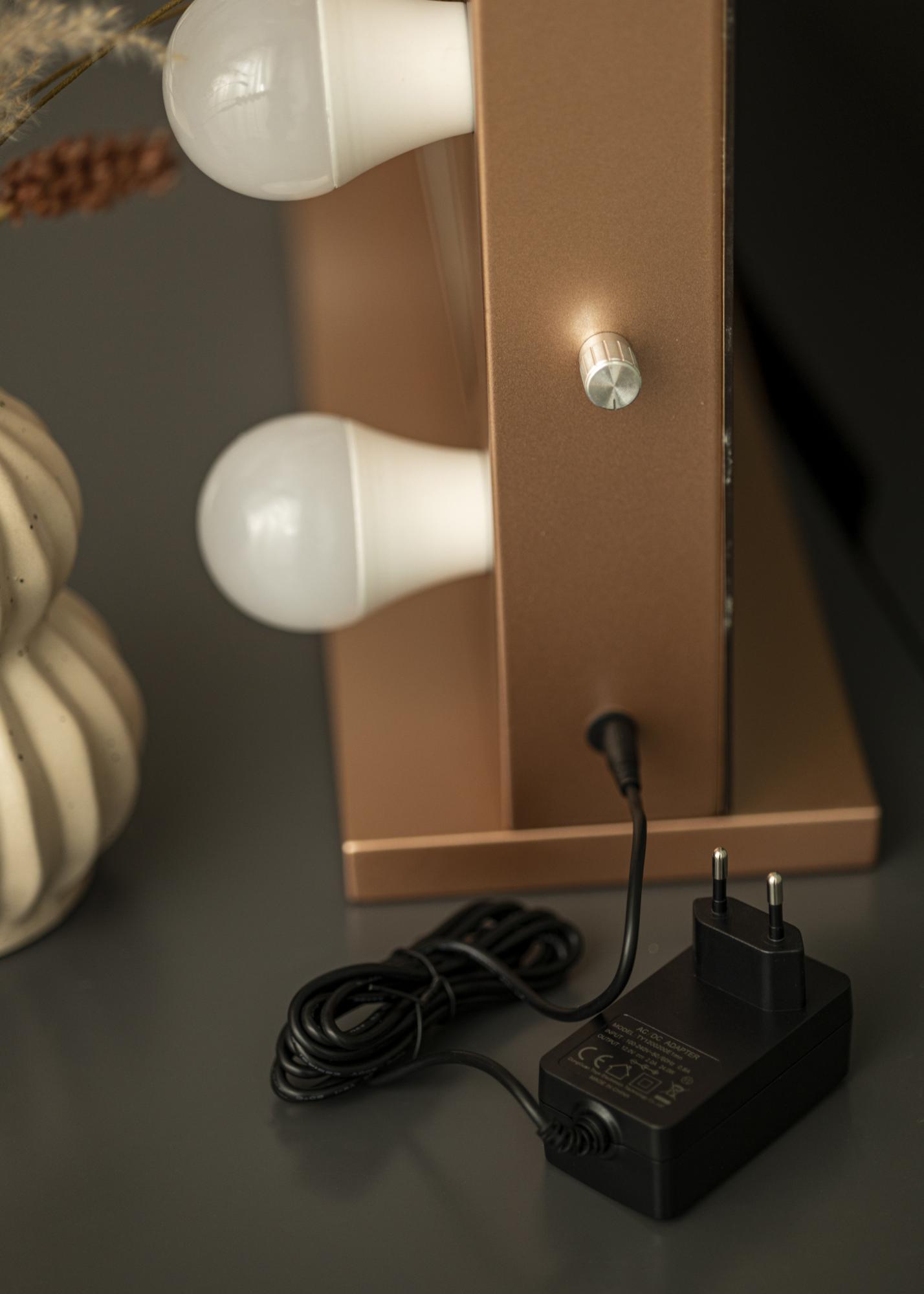 Rožinio aukso rėmas derinamas su pėda to paties stilingo atspalvio, todėl šis veidrodis yra puikus interjero elementas tiek ant stalo, tiek ir komodose. Jei norite verčiau pakabinti veidrodį ant sienos naudodami tvirtinimus ant nugarinės pusės, galite laisvai nuimti pėdos stendą. Elektros prijungimas atliekamas su kištuku.