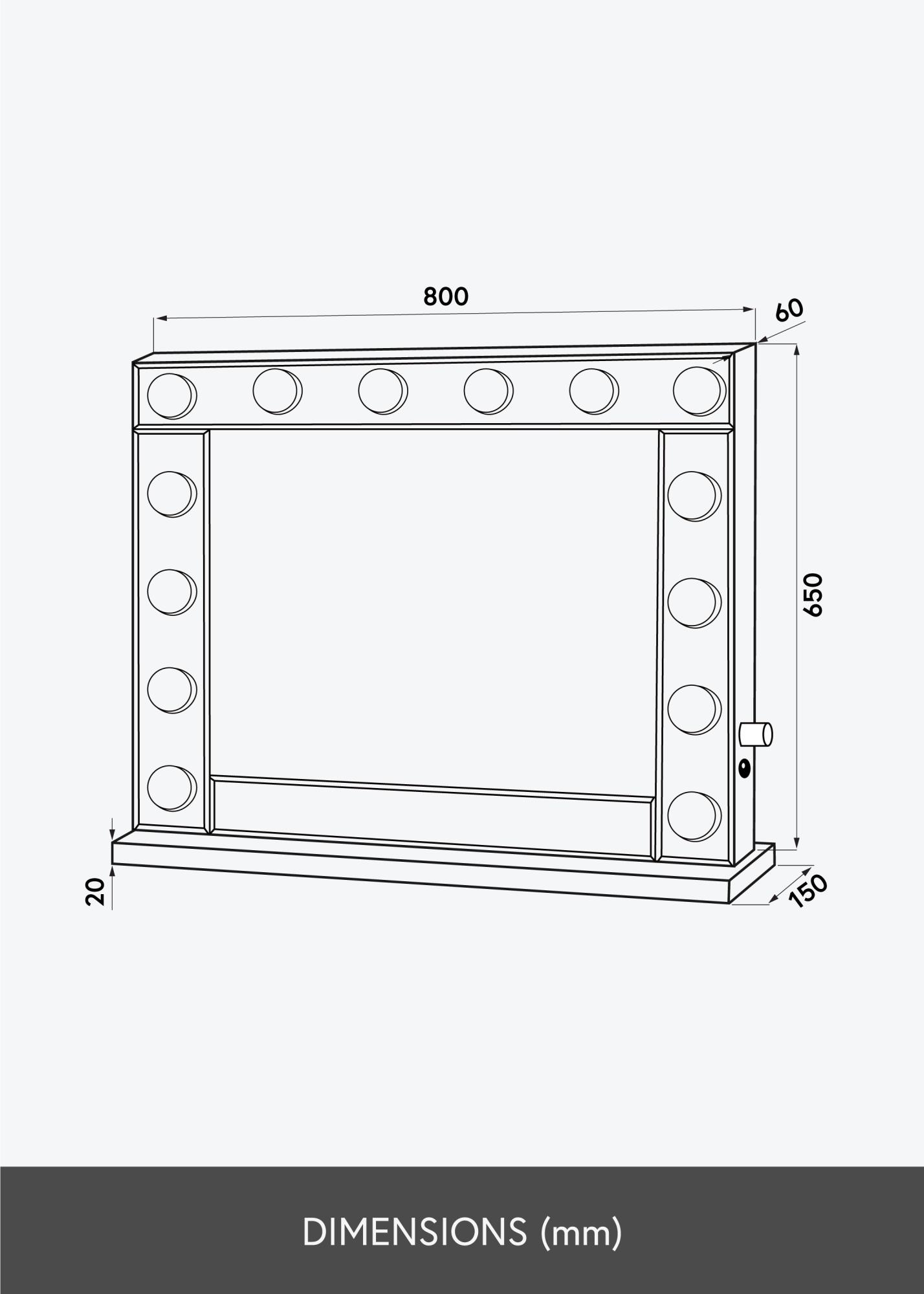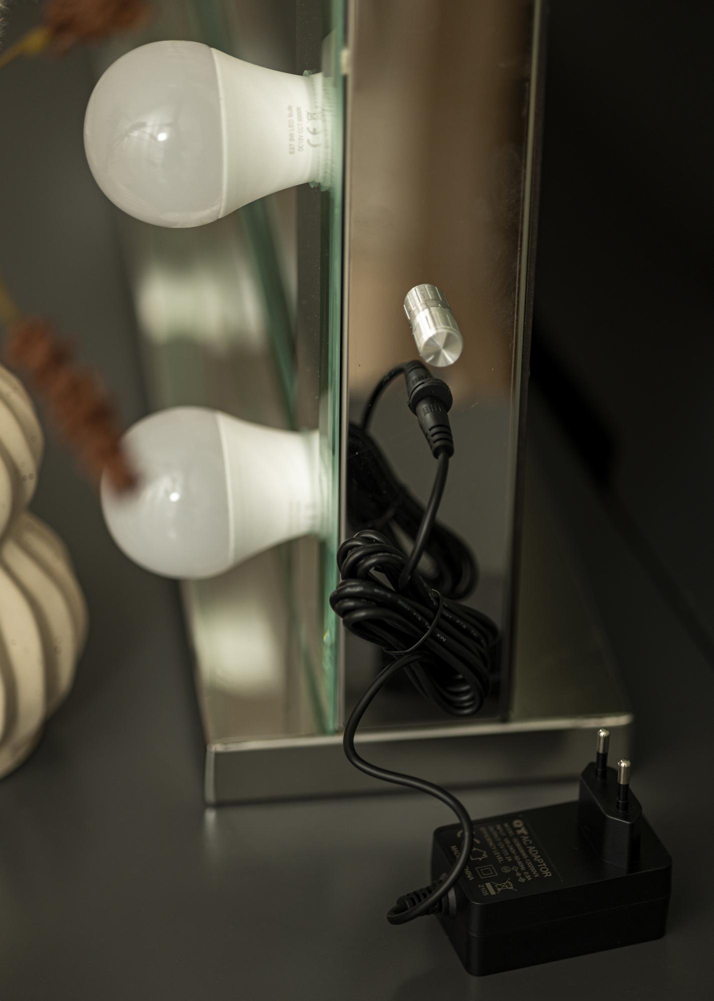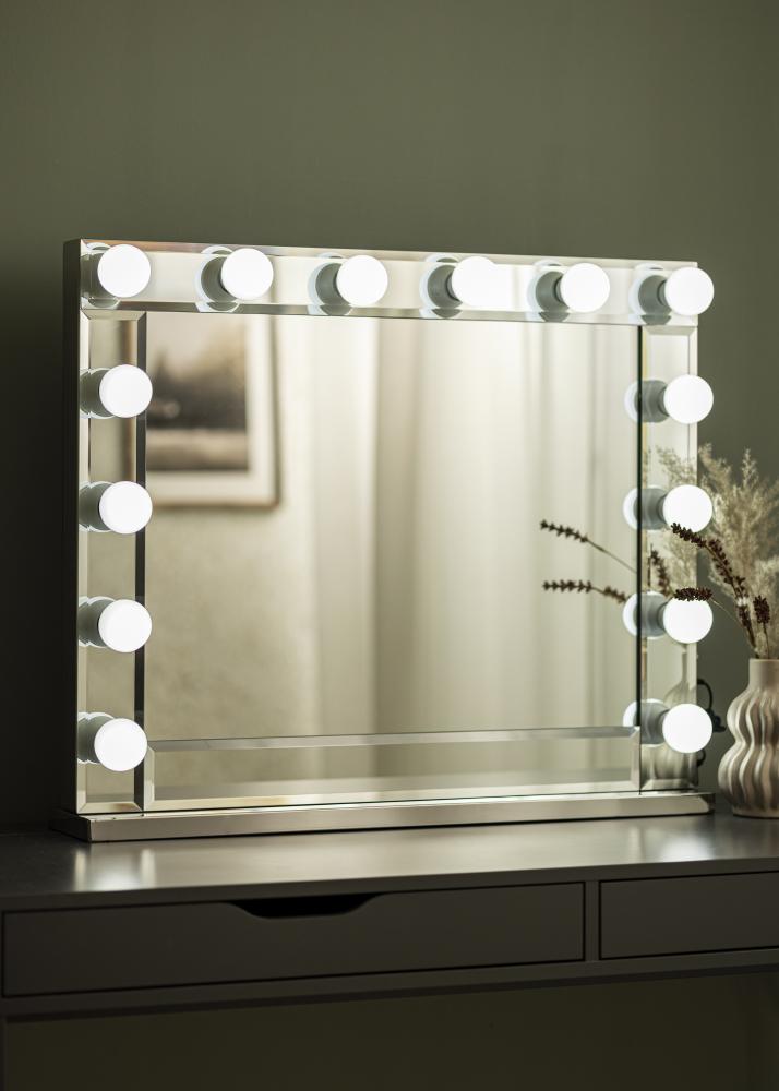 Suteikite savo namams prabangos su šiuo Holivudo dizaino kosmetiniu veidrodžiu. Veidrodis turi sidabrinės spalvos rėmelį, papuoštą 14 lemputėmis, suteikiančiomis veidrodžiui prabangų įspūdį. Lemputės yra keičiamos ir turi E27 lizdą. Lemputės skleidžia šaltai baltą šviesą. Jei norite, galite pasirinkti reguliuoti apšvietimą iki tokio ryškumo, kuris tinka jūsų tikslui – ryški šviesa puikiai tinka, kai darotės makiažą, o blankesnė šviesa yra tinkamesnė kaip foninis apšvietimas. Šis reguliavimas atliekamas paprastai per mažą sukimo mygtuką veidrodžio šoninėje pusėje.
