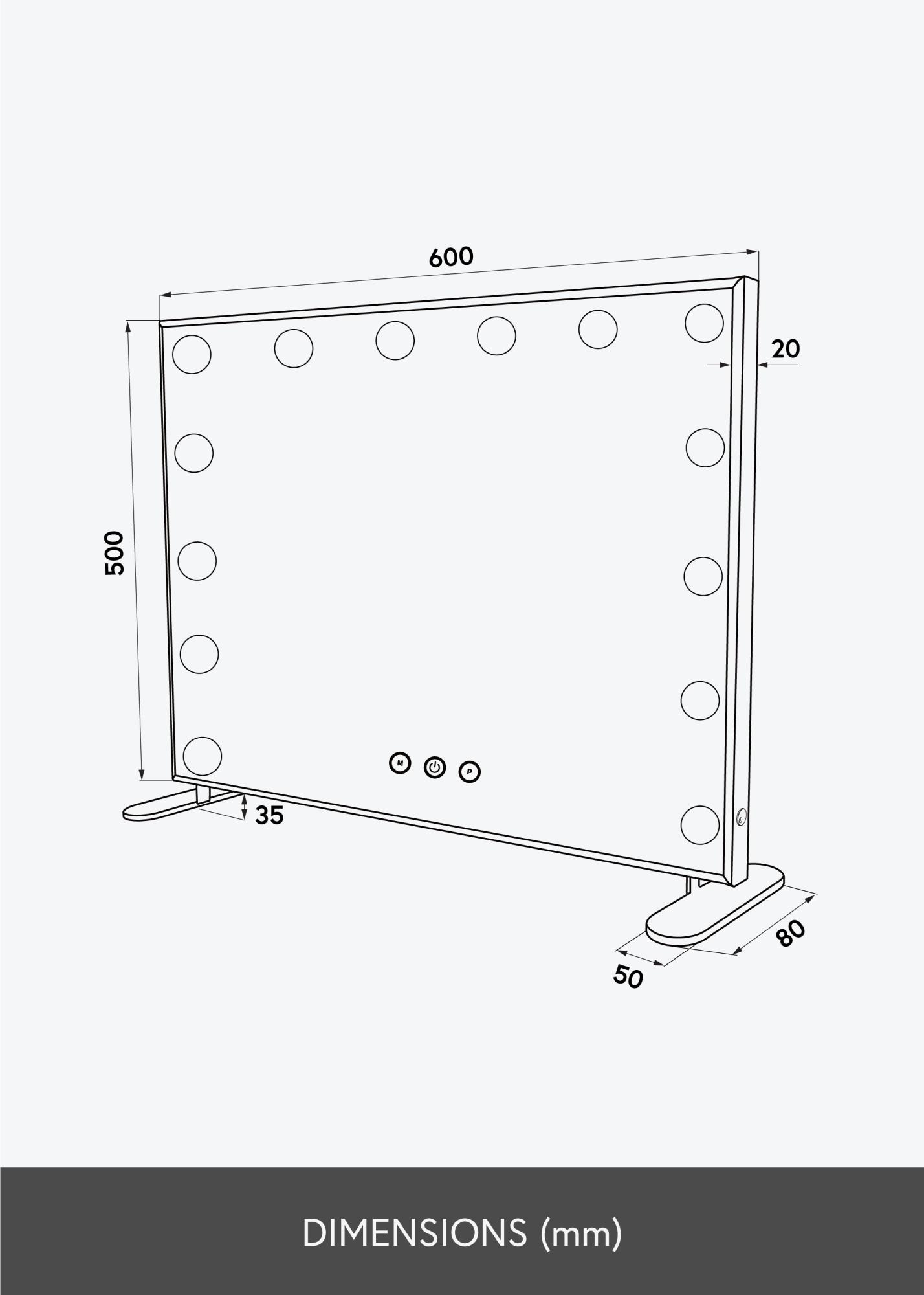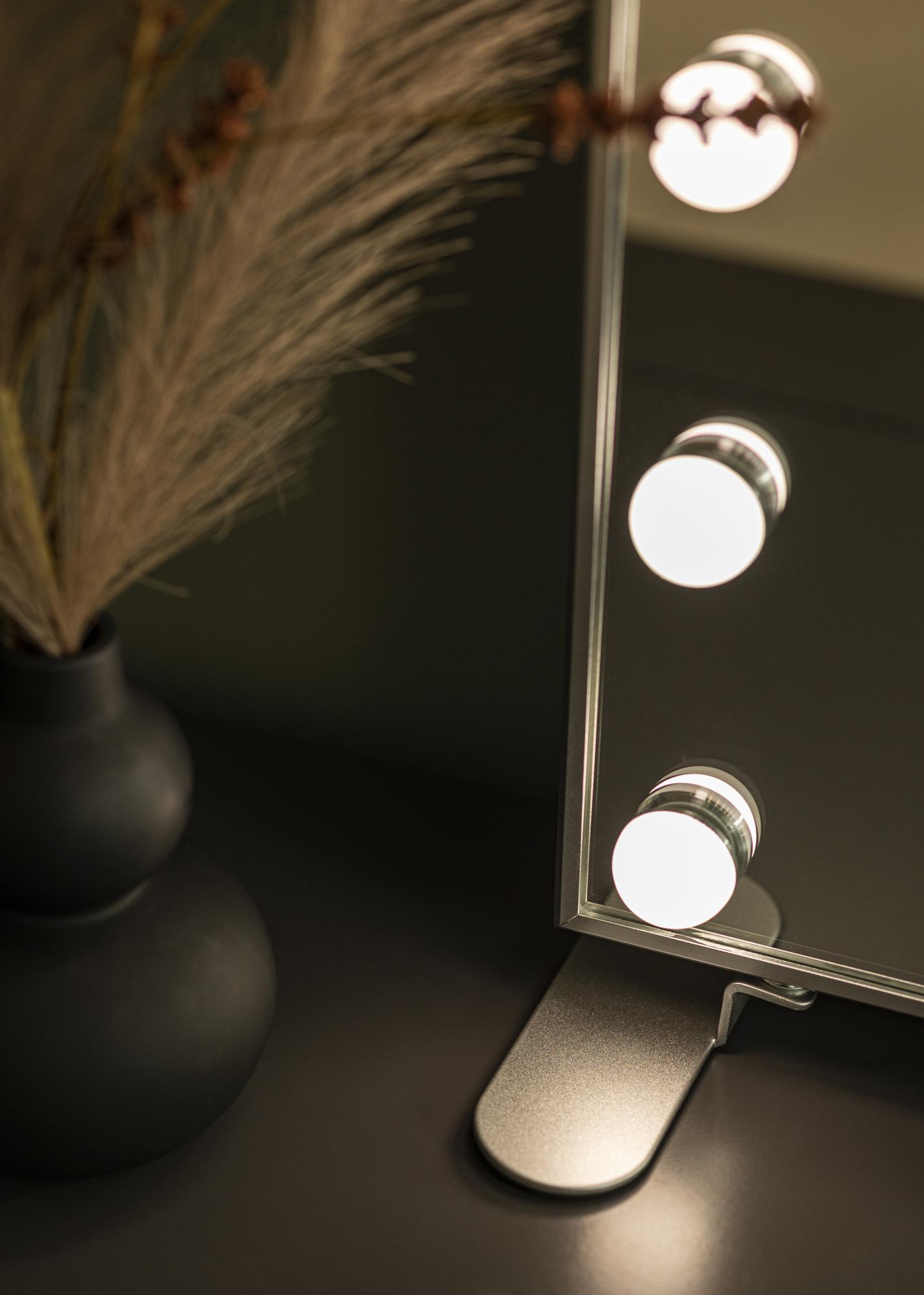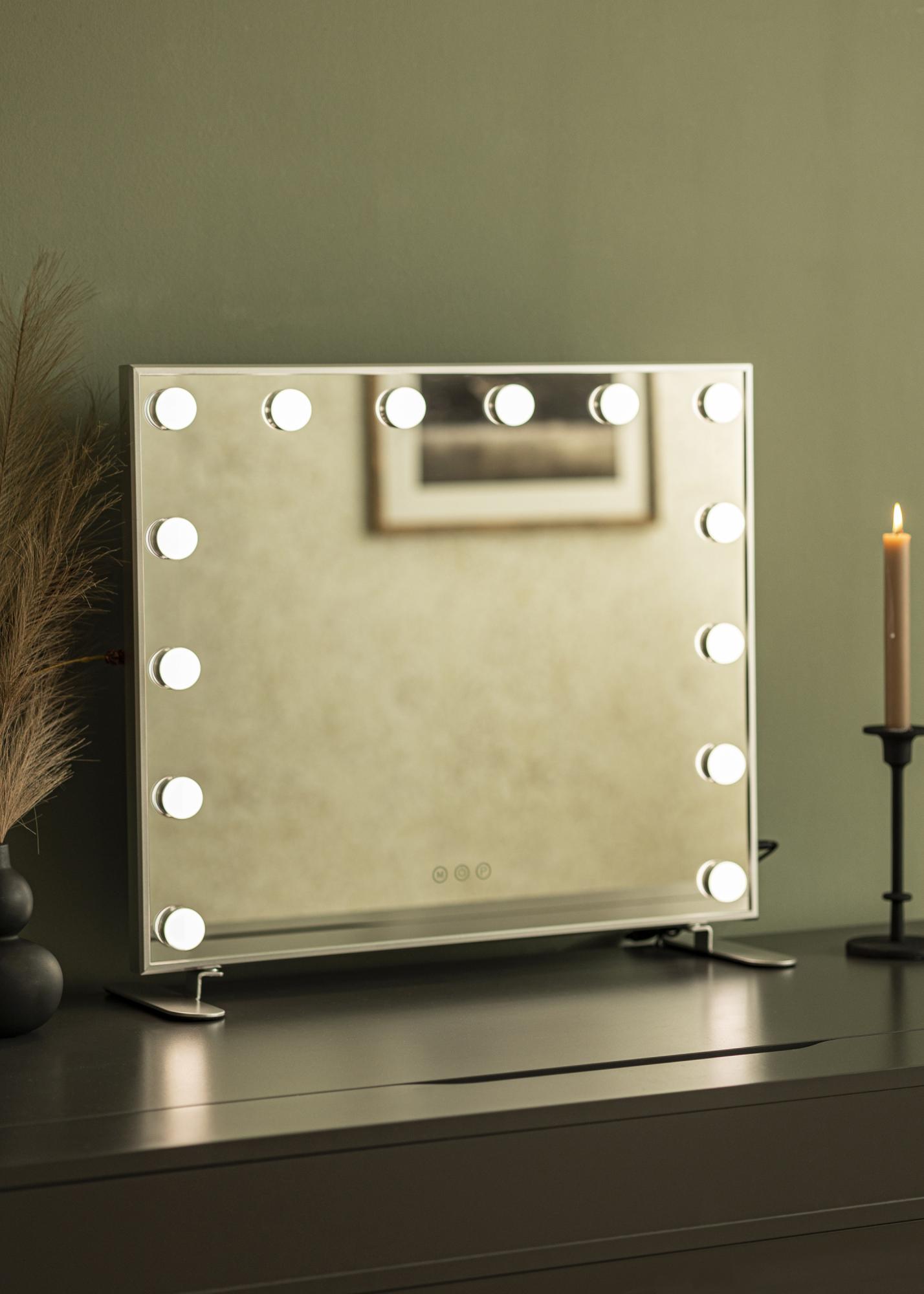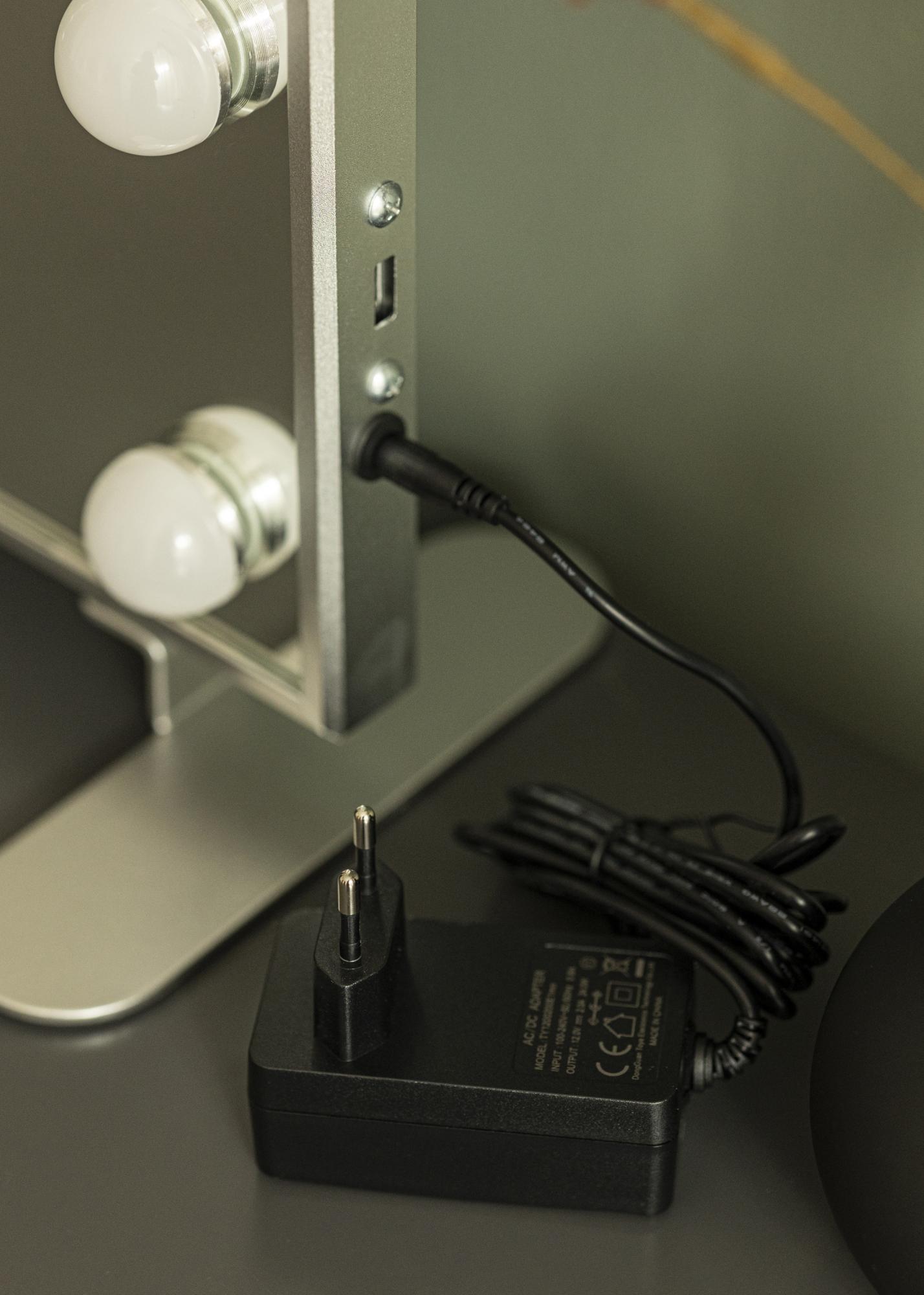Tai stilingas kosmetinis veidrodis, kuris taps puikiu interjero akcentu visuose namų kambariuose. Plonas sidabrinis rėmas, apjuosiantis 60x50 cm veidrodžio paviršių, sukuria labai elegantišką įspūdį, o 14 suapvalintų LED lempučių, išdėstytų veidrodžio kraštuose, suteikia išskirtinumo pojūtį. Vienoje veidrodžio pusėje yra USB lizdas, leidžiantis įkrauti išmaniuosius įrenginius per USB jungtį.