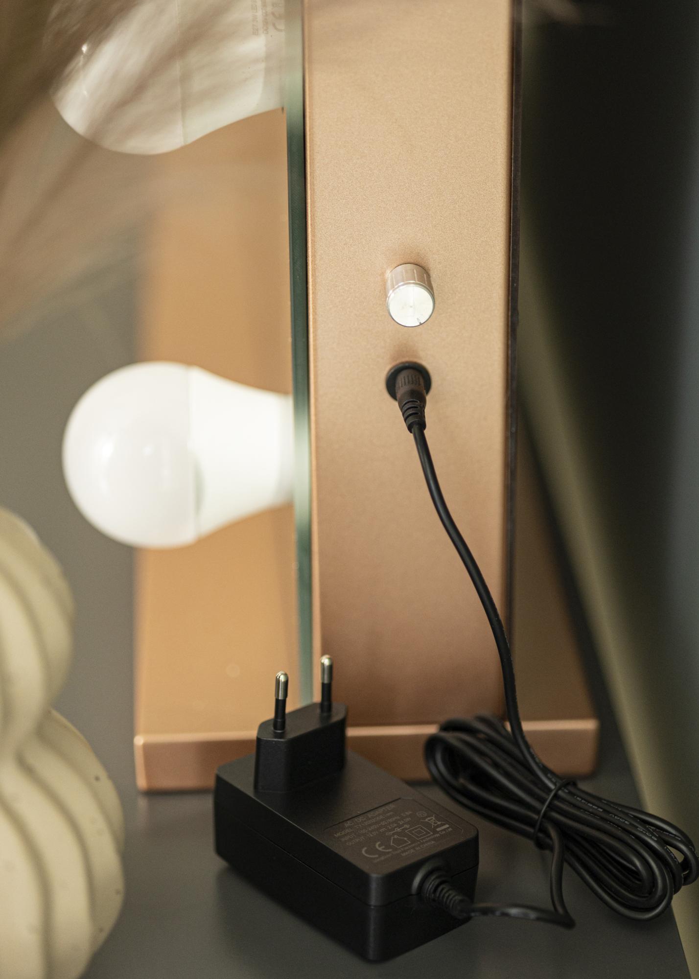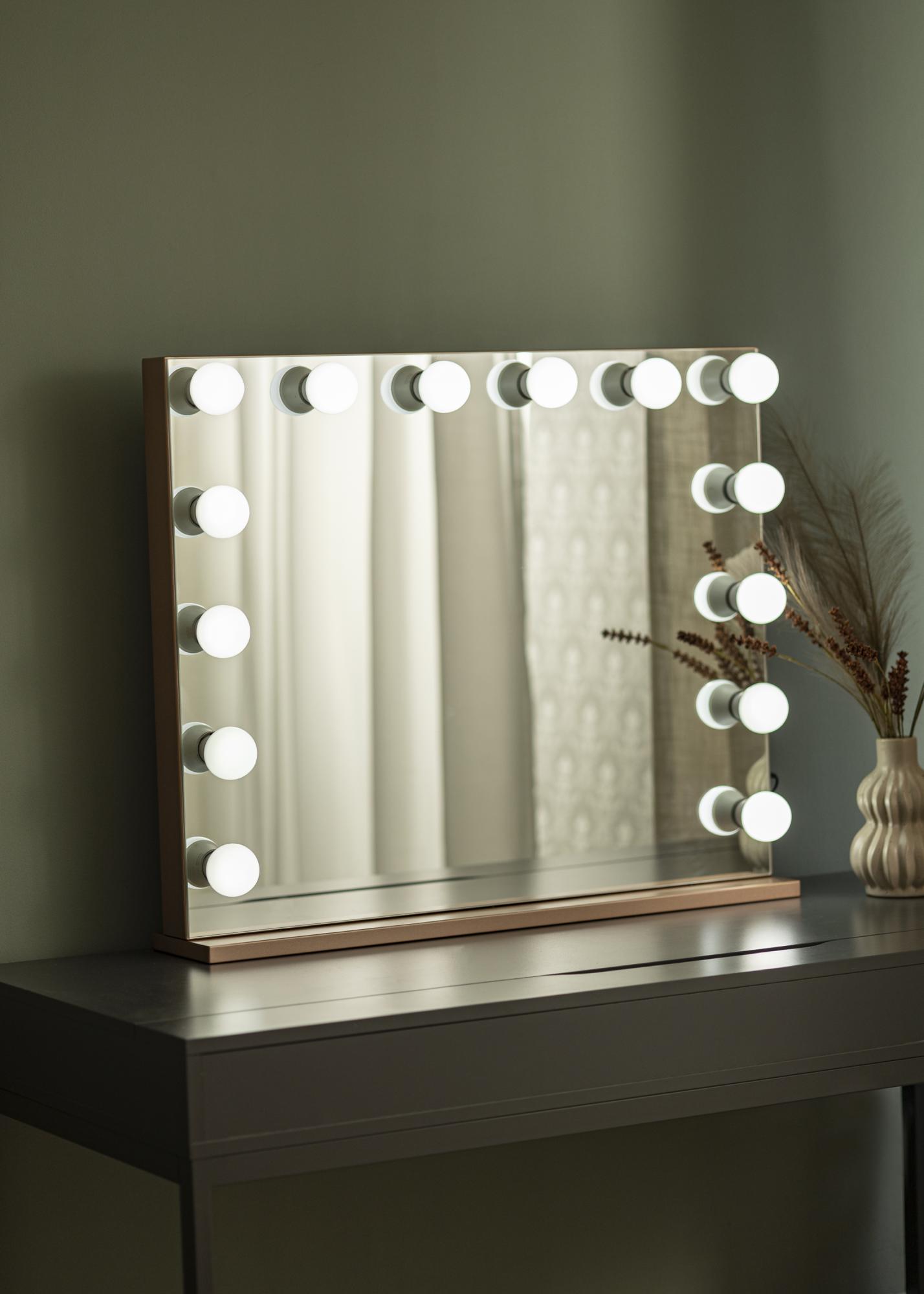 Rėmas pagamintas iš geležies su išskirtine rožinio aukso spalva, kuri suteikia papildomą prabangos matmenį jo išvaizdai. Šis veidrodis suprojektuotas būti lanksčiu ir gali būti naudojamas tiek kaip laisvai stovintis veidrodis, tiek įspūdingas sienos veidrodis. Padas yra nuimamas, suteikiantis jums laisvę pasirinkti, kaip norite naudoti ir kur pastatyti veidrodį savo namuose. Nesvarbu, ar jis stovi ant grindų, ar kabo ant sienos, šis makiažo veidrodis su apšvietimu puikiai pabrėš bet kurio kambario išvaizdą. Elektros prijungimas yra paprastas ir atliekamas su standartiniu kištuku.
