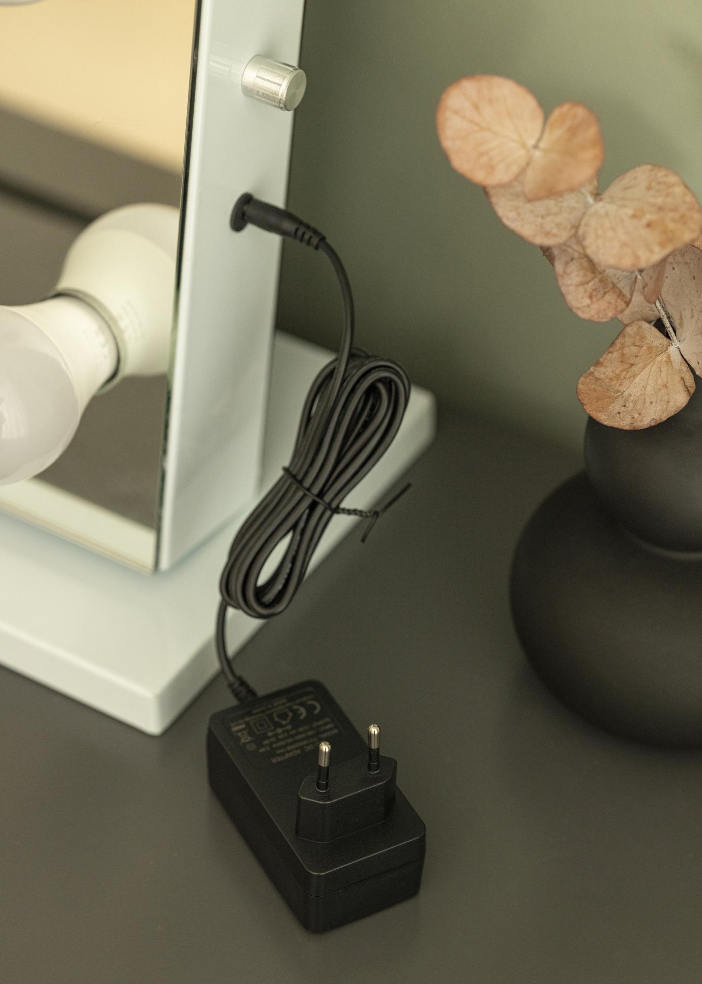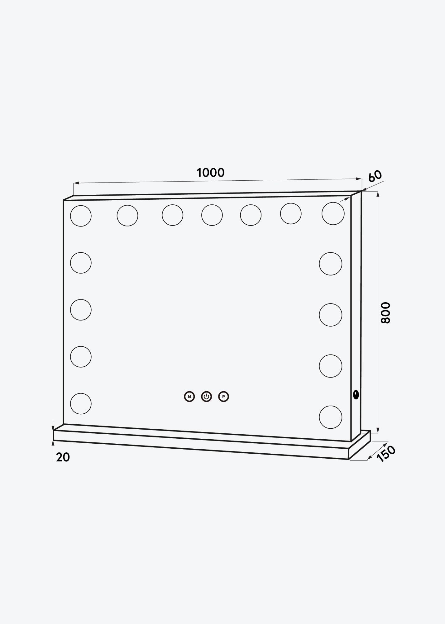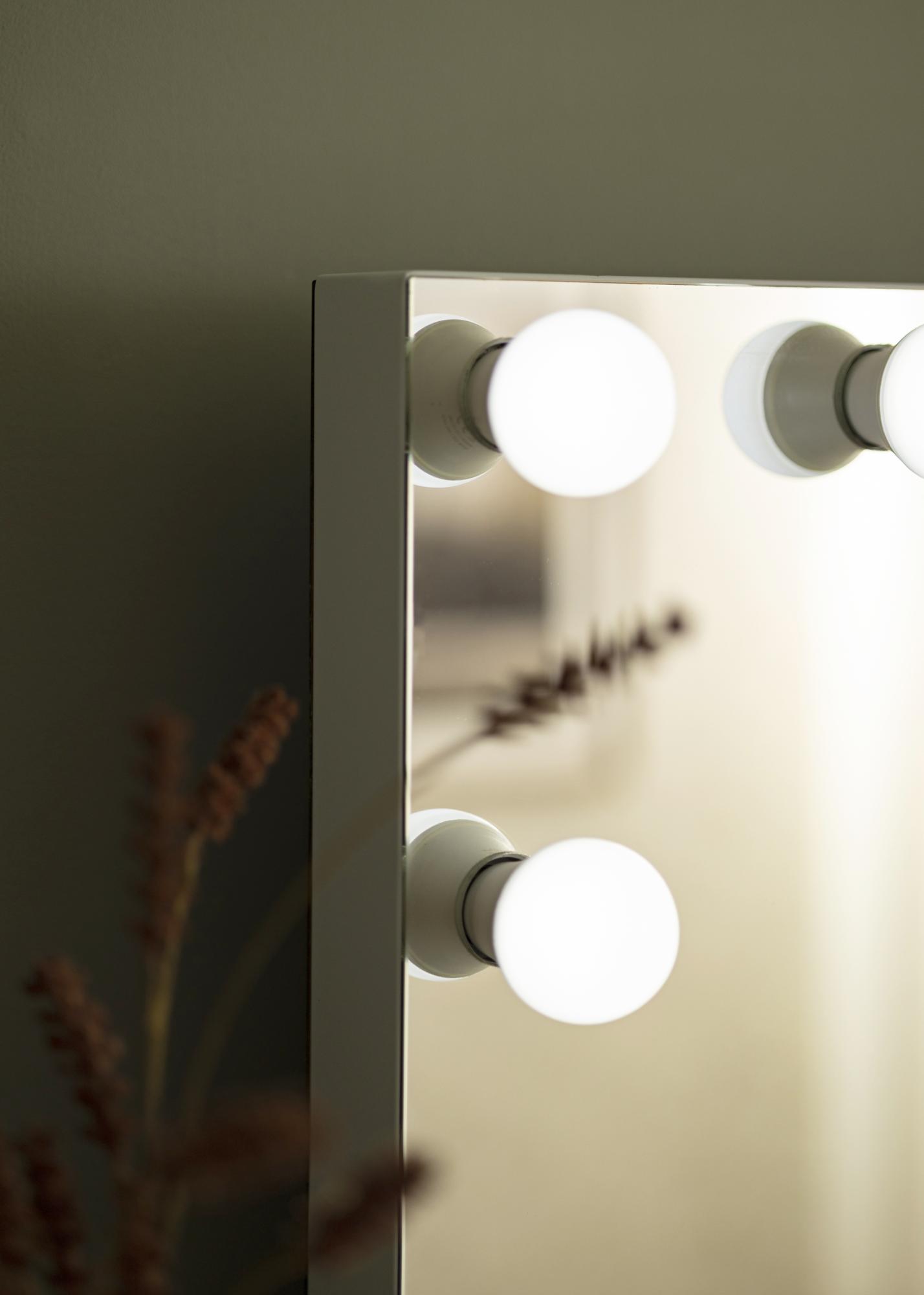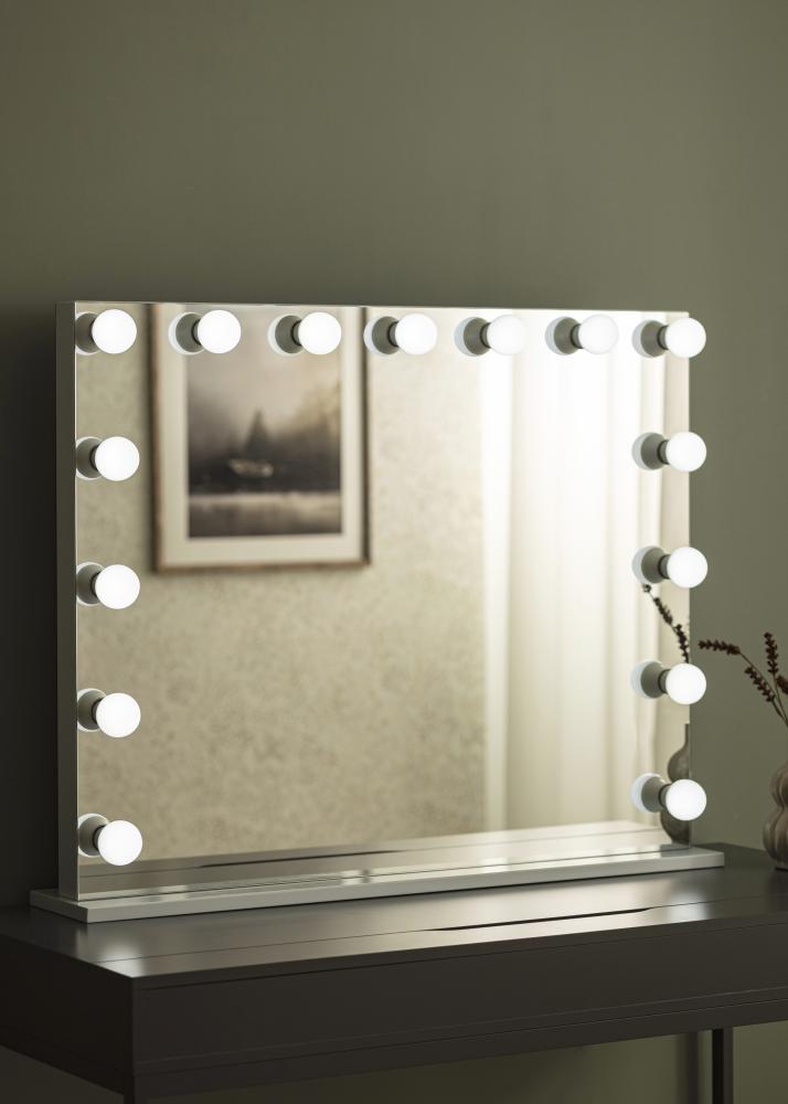 Šis Holivudo įkvėptas makiažo veidrodis suteiks jūsų makiažo kampeliui prabangos. Dizainas suteikia prabangos įspūdį, dėka didelio veidrodžio paviršiaus 100x80 cm ir įmontuoto apšvietimo, susidedančio iš 15 lempučių, kurios apgaubia veidrodžio kraštus. Lemputės turi E27 lizdą ir gali būti pakeistos, jei reikia. Veidrodis gali būti pastatytas vertikaliai, todėl jis puikiai tiks ant komodos miegamajame, indaujės svetainėje ar bet kuriame kitame kambaryje, kur norite stilingo veidrodžio. Jei norite pakabinti veidrodį ant sienos, pagrindas gali būti nuimtas.