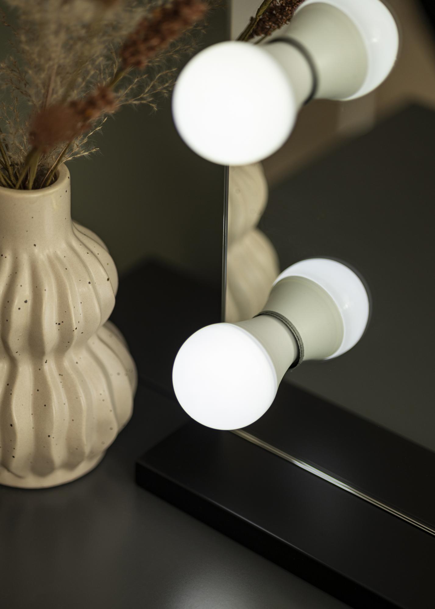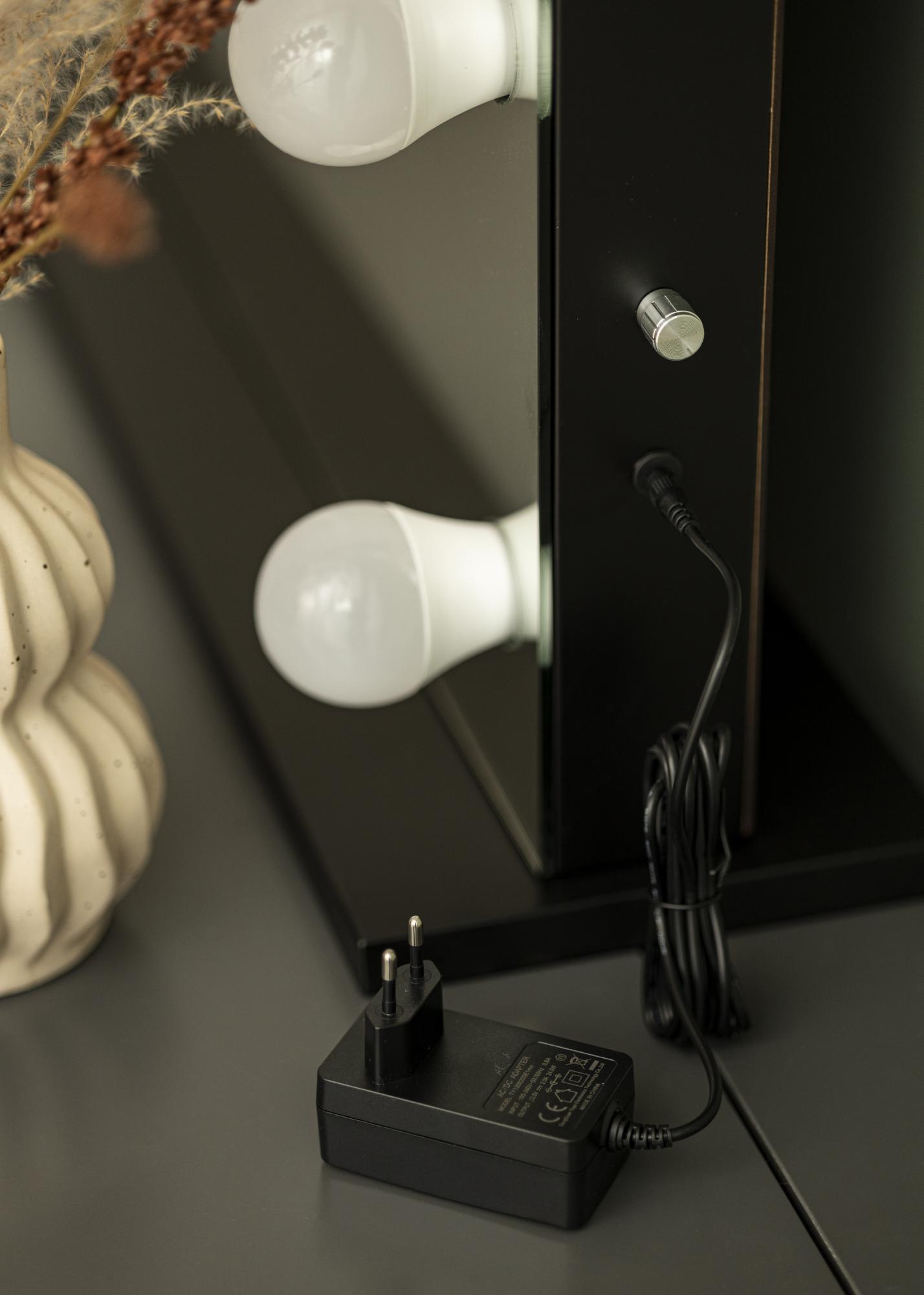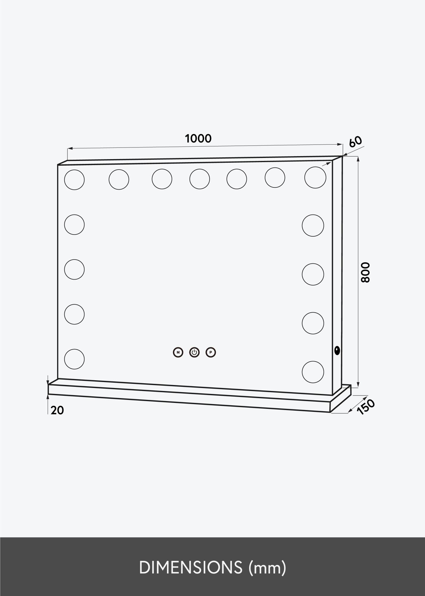 Su didesniu veidrodžiu su apšvietimu, galite pridėti stilių ir funkcionalumą į miegamąjį ar svetainę. Šis veidrodis turi veidrodžio paviršių, kuris matuoja net 100x80 cm, gražiai įrėmintą 15 lempučių su E27 lizdu. Elegantiškas dizainas, klasikinė stačiakampė forma ir lemputės palei veidrodžio šonus, primena žavingą Holivudą. Lemputės skleidžia šaltą baltą šviesą. Apšvietimą galima lengvai reguliuoti iki norimo šviesumo, naudojant sukamąją rankenėlę vienoje veidrodžio pusėje.