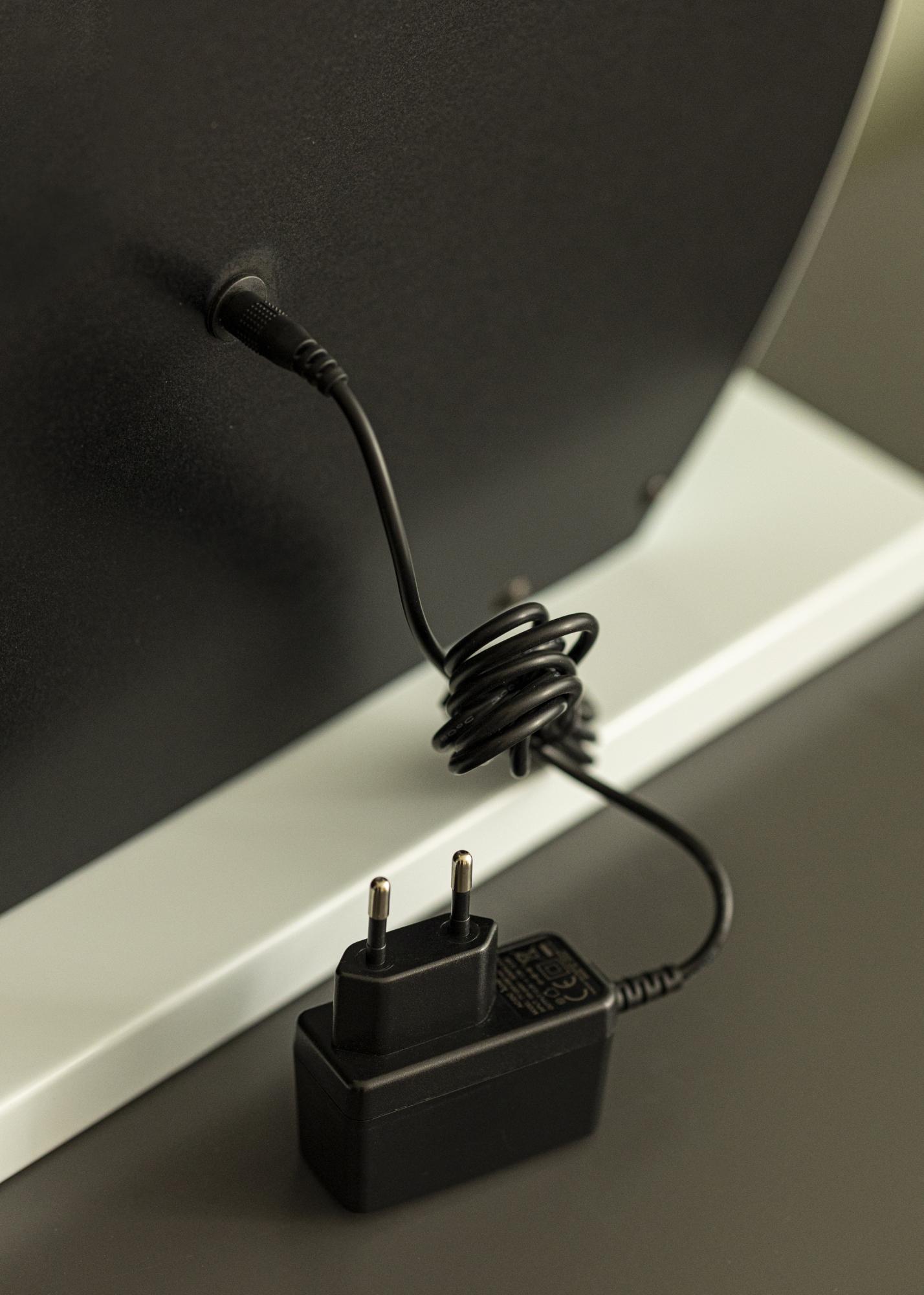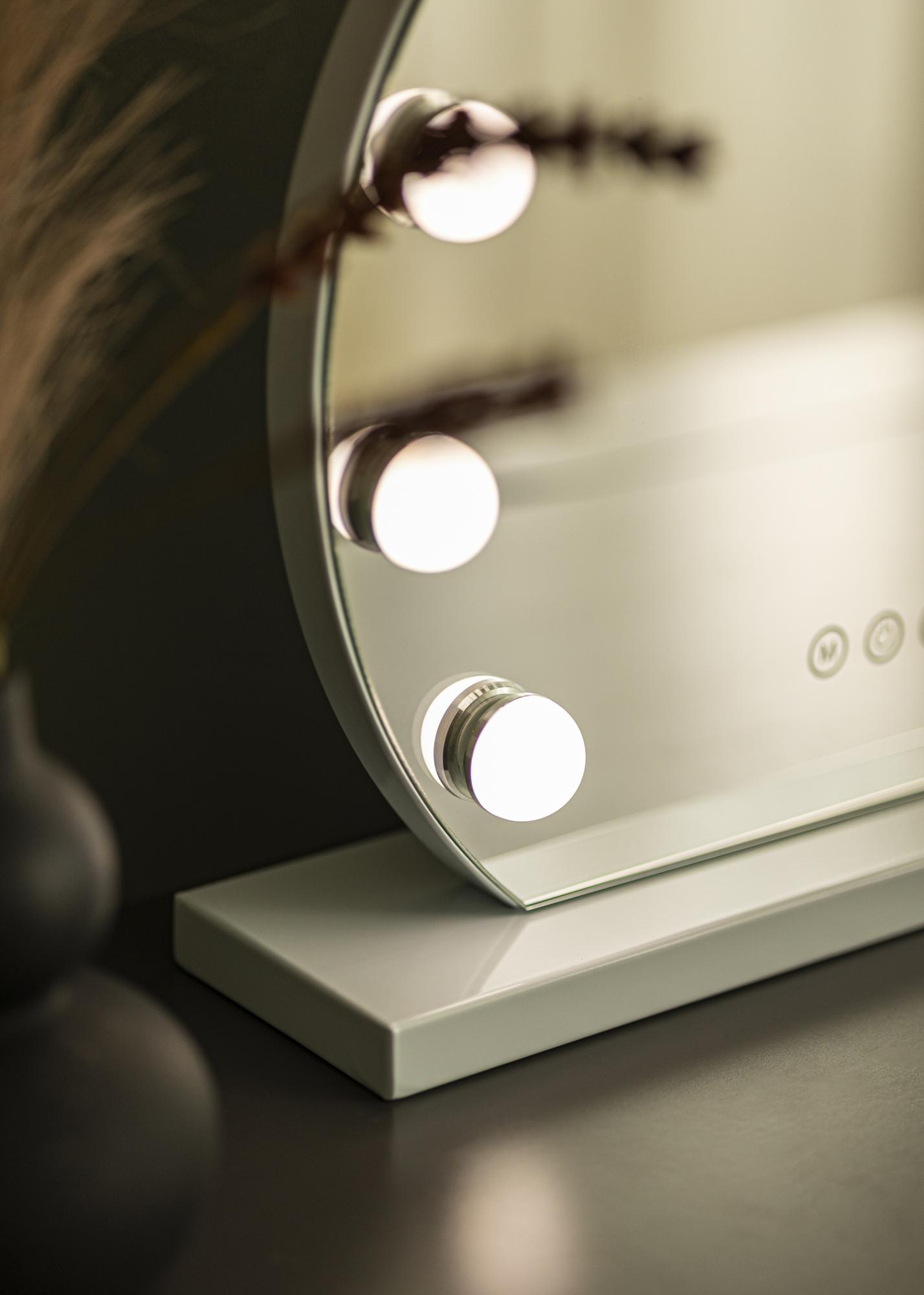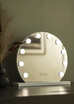 Tai prabangi kosmetikos veidrodis su įmontuotu LED apšvietimu, kuris suteikia tolygų apšvietimą veidui, kai atspindite. Apšvietimą sudaro 10 LED lempučių, išdėstytų palei veidrodžio kraštą. Šviesą galima reguliuoti pagal savo pageidavimus, nes turite galimybę nustatyti tiek šviesos stiprumą, tiek spalvos temperatūrą. Šviesos nustatymai atliekami naudojant jutiklinius mygtukus apatinėje veidrodžio krašto dalyje, pažymėtus raidėmis. Mygtuku, pažymėtu "M", galite pasirinkti spalvos temperatūrą tarp šiltos, šaltos ir natūralios šviesos. Mygtukas, pažymėtas "P", naudojamas šviesos pritemdymui. Taip pat yra jungiklis, naudojamas šviesai įjungti arba išjungti. Elektros jungtis atliekama per kištuką.