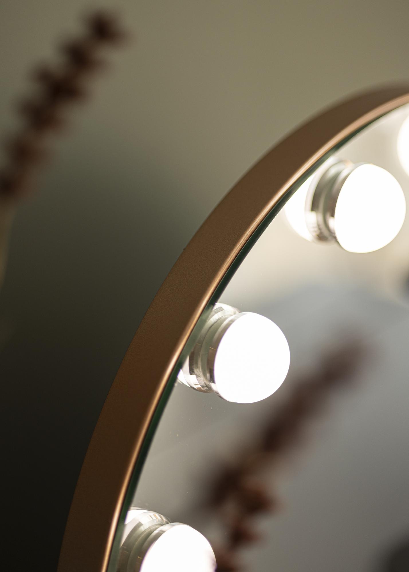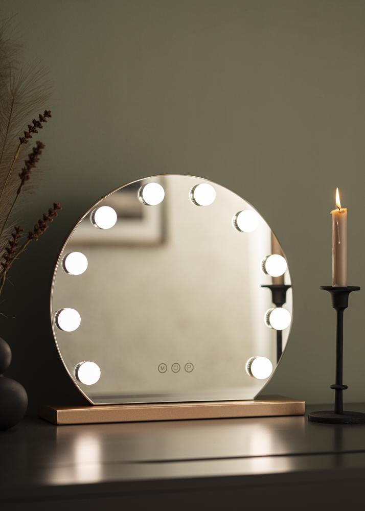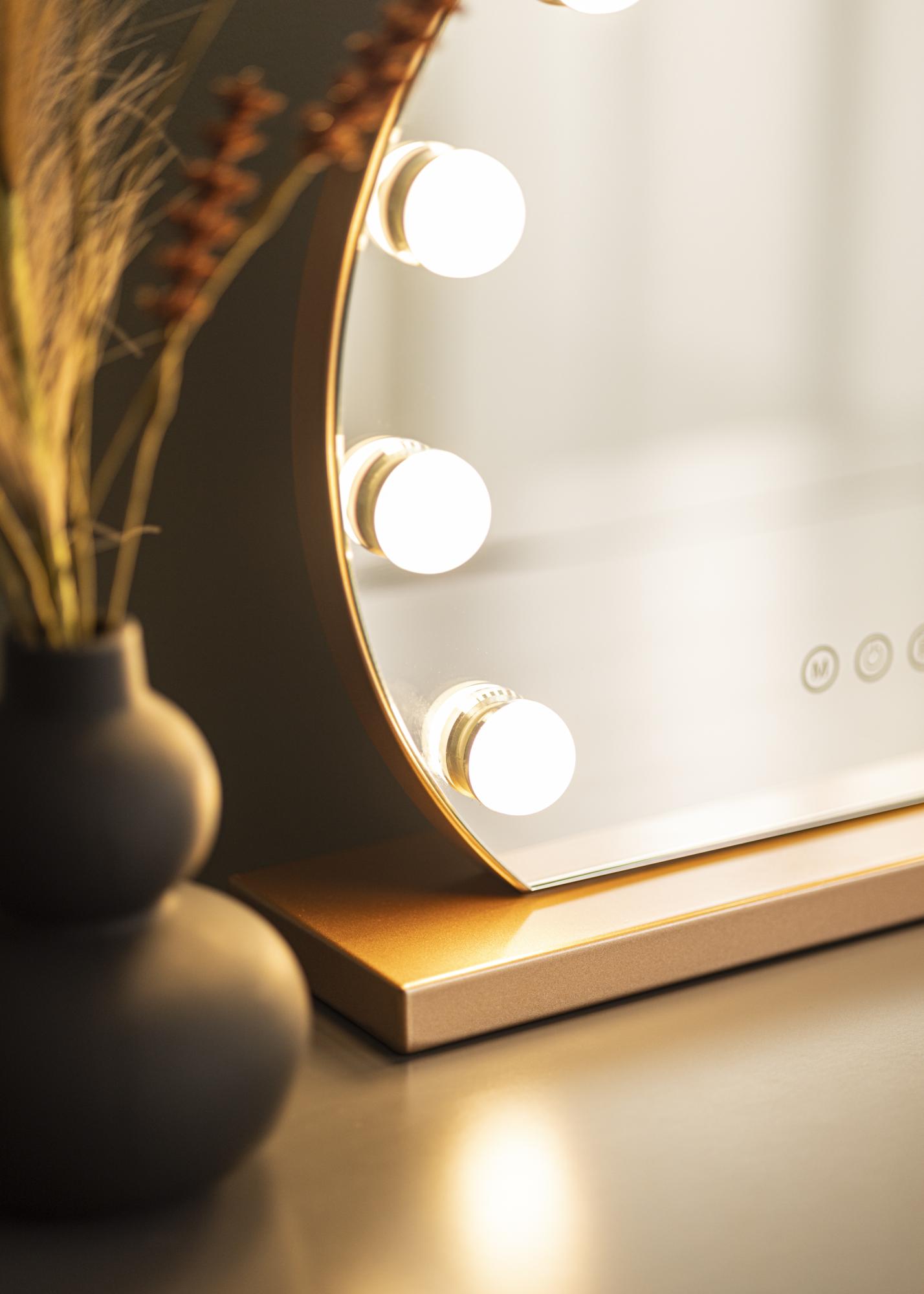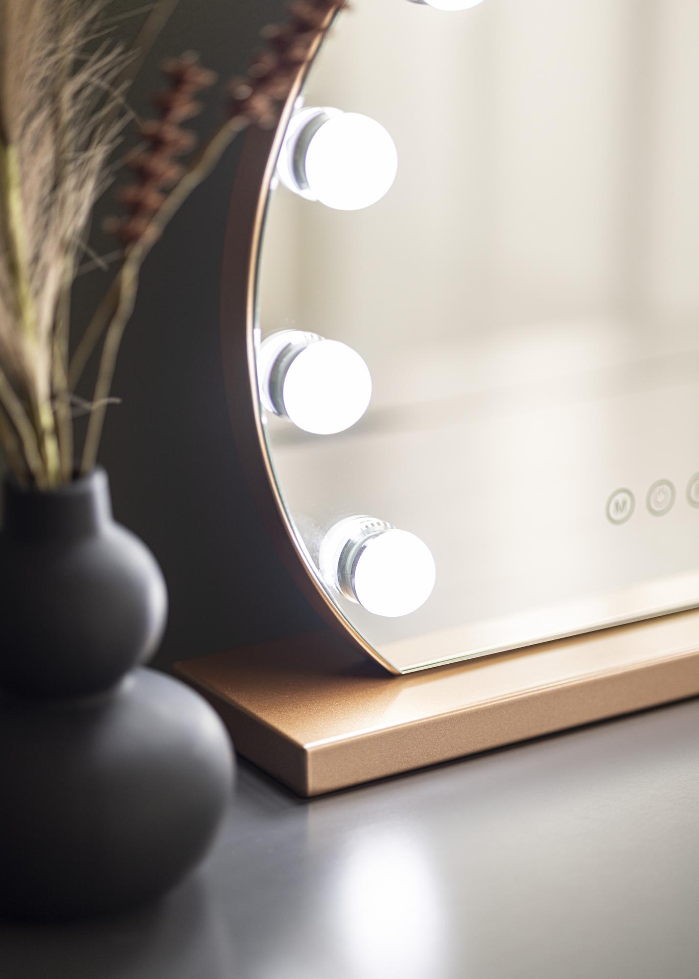 Šis veidrodis pasižymi klasikine apvalia forma su 10 didelių LED lempučių, kurios įrėmina 40x30 cm dydžio veidrodinį paviršių. Tai suteikia išskirtinę išvaizdą, kuri dar labiau sustiprėja dėl veidrodžio pagrindo, pagaminto iš madingo rožinio aukso atspalvio. Jūs įjungiate integruotą apšvietimą su jutikliniu mygtuku veidrodžio priekyje. Taip pat galite reguliuoti šviesos spalvos temperatūrą ir šviesumą pagal savo pageidavimus. Tai taip pat galima atlikti naudojant patogius jutiklinius mygtukus, pažymėtus „M“ spalvos temperatūros reguliavimui ir „P“ šviesumo nustatymui. Galite pasirinkti iš trijų spalvos temperatūrų: šilta, šalta ir natūrali šviesa.
