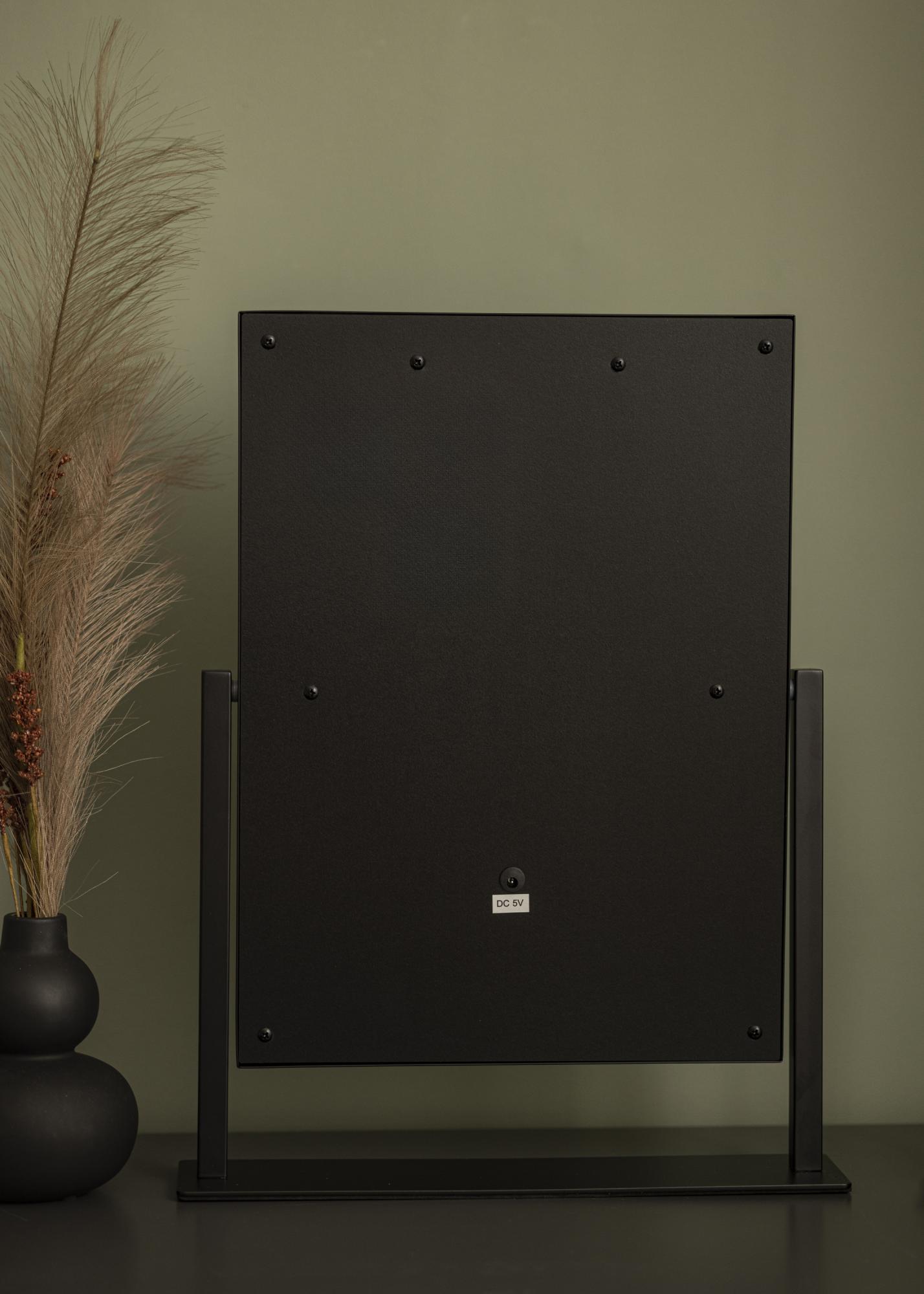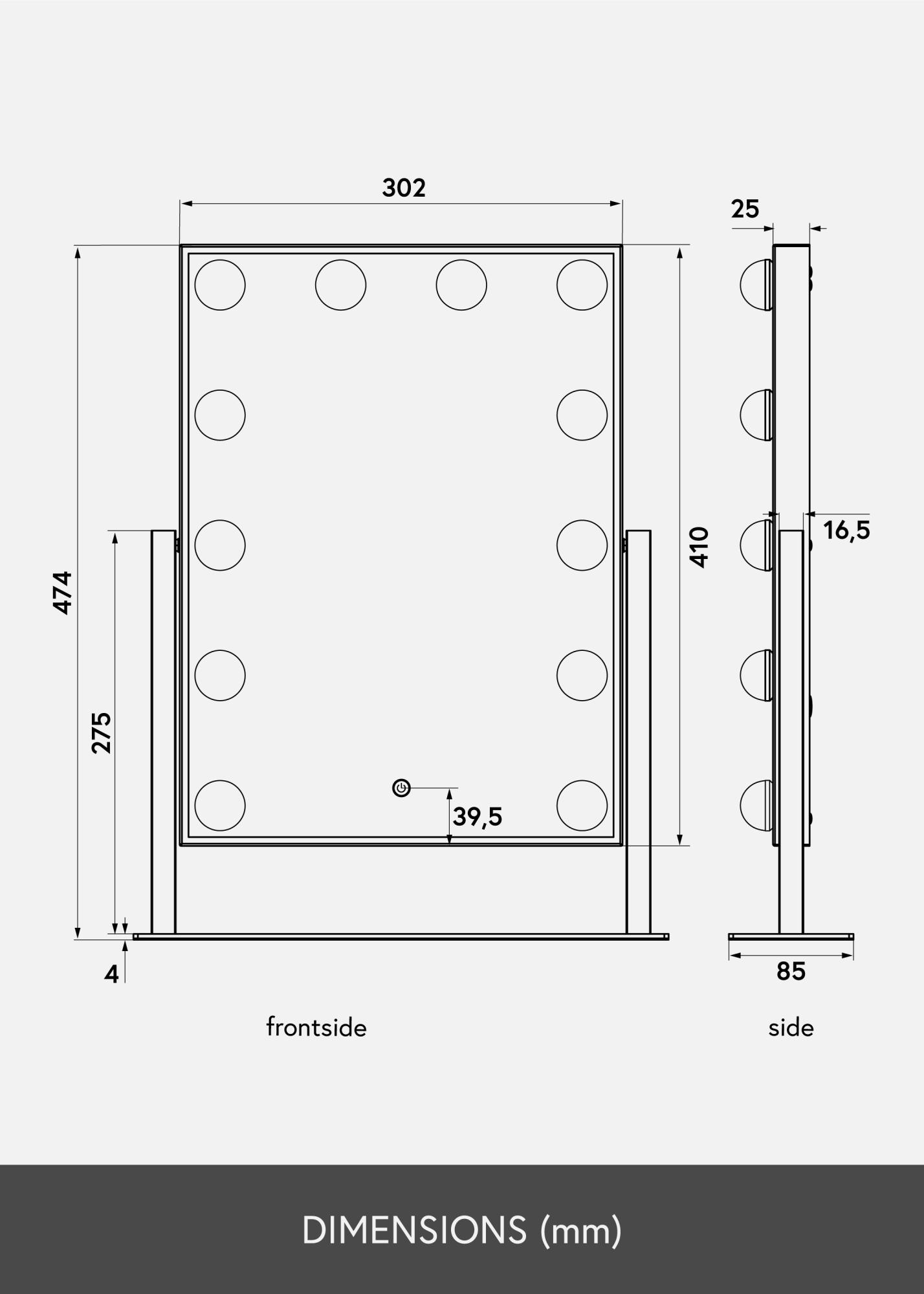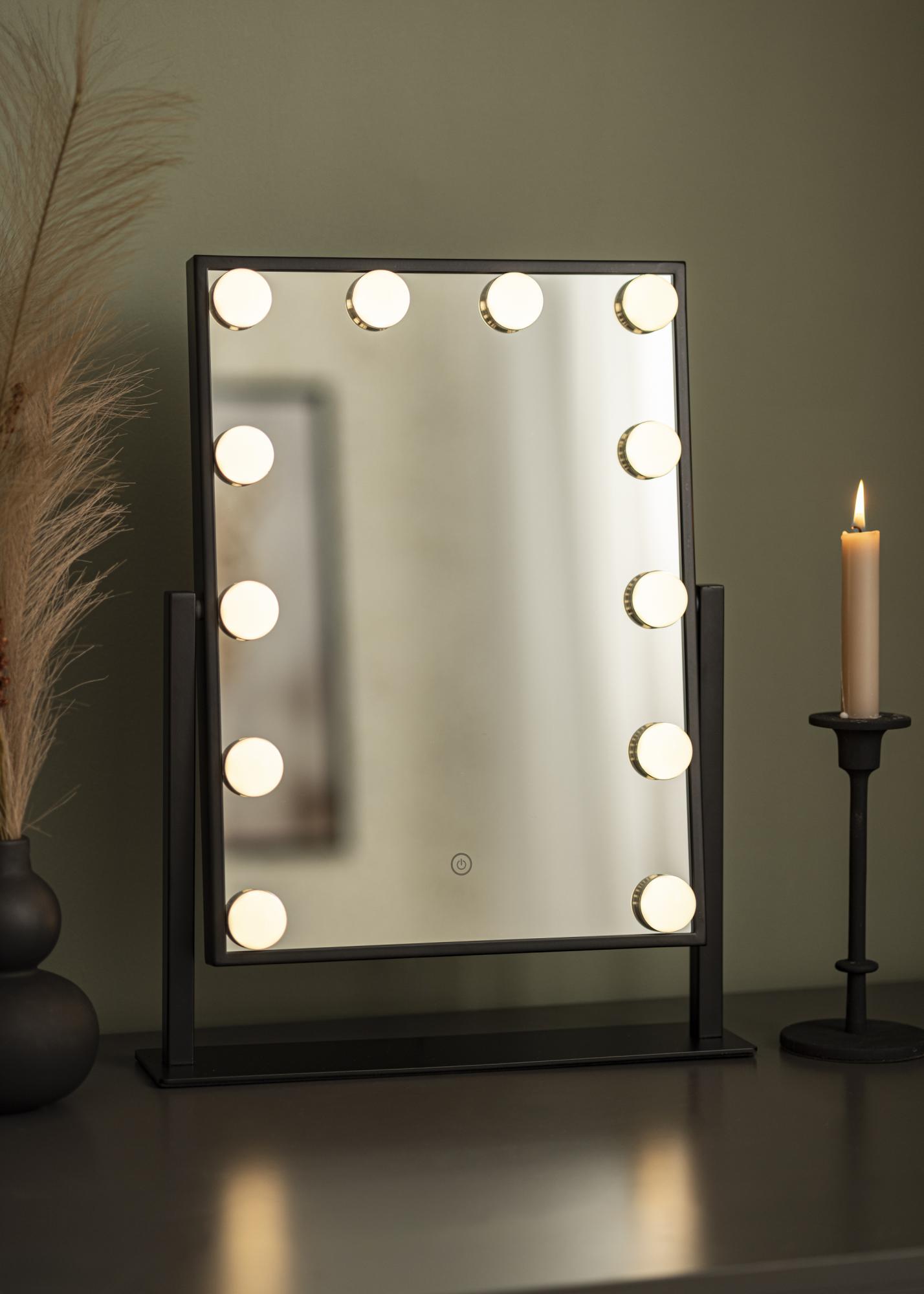 Tai yra makiažo veidrodis su prabangiu dizainu ir 12 dekoratyvinių LED lempučių elegantiškame juodame atspalvyje. Lemputės stilingai įrėmina didelį veidrodžio paviršių, kurio matmenys 30x40 cm, ir suteikia šiltą baltą šviesą 3000K. Apšvietimas įjungiamas paspaudus jutiklinį mygtuką ekrane, ir turi šviesos reguliavimo funkciją, kurią lengvai nustatysite laikydami mygtuką kelias sekundes. Veidrodį galima pakreipti vertikaliai, kad galėtumėte patogiai pasidažyti iš jums tinkamo kampo. Be daugybės funkcijų, šis makiažo veidrodis tampa elegantiška detale ir sukuria tikrą Holivudo pojūtį jūsų namuose!