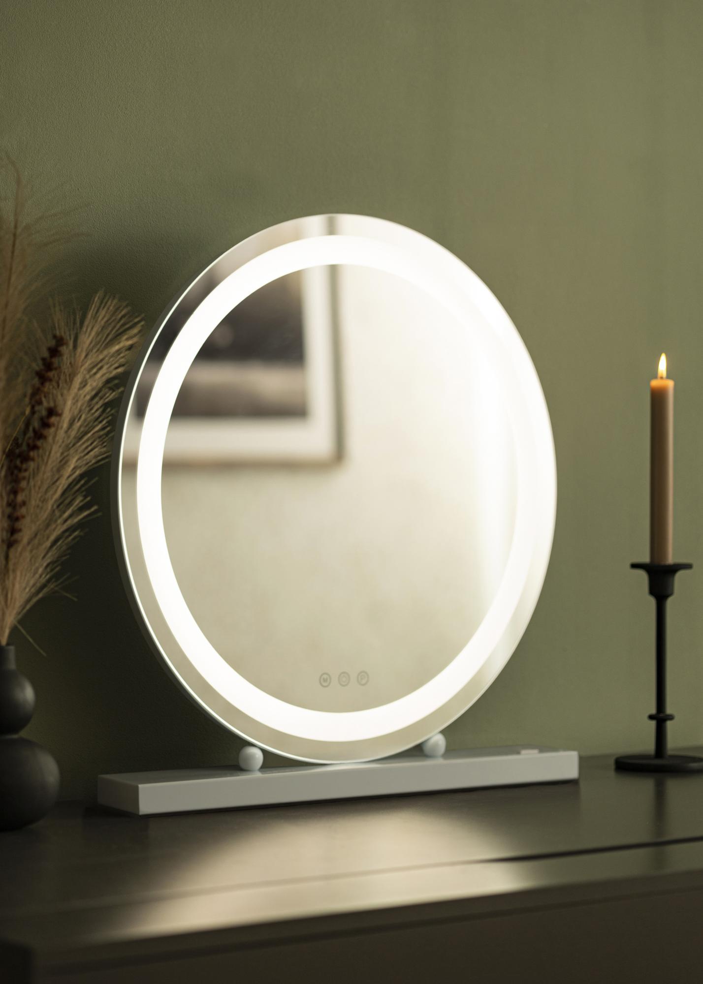 Norite turėti rafinuotą vertikalios formos veidrodį ant kosmetikos stalo, prieškambario komodos arba svetainės bufete? Tai yra apvalus veidrodis su elegantišku baltu pagrindu ir integruotu LED apšvietimu, kuris bus tiek gražus, tiek praktiškas papildymas jūsų namuose. Makiažo veidrodžio LED apšvietimas susideda iš integruotos LED juostos, kuri įsijungia ir išsijungia per jutiklinį mygtuką veidrodžio paviršiuje. Taip pat yra jutikliniai mygtukai, skirti reguliuoti veidrodžio apšvietimo nustatymus; mygtukas pažymėtas "M" spalvos temperatūros reguliavimui ir mygtukas pažymėtas "P" šviesos intensyvumo koregavimui.