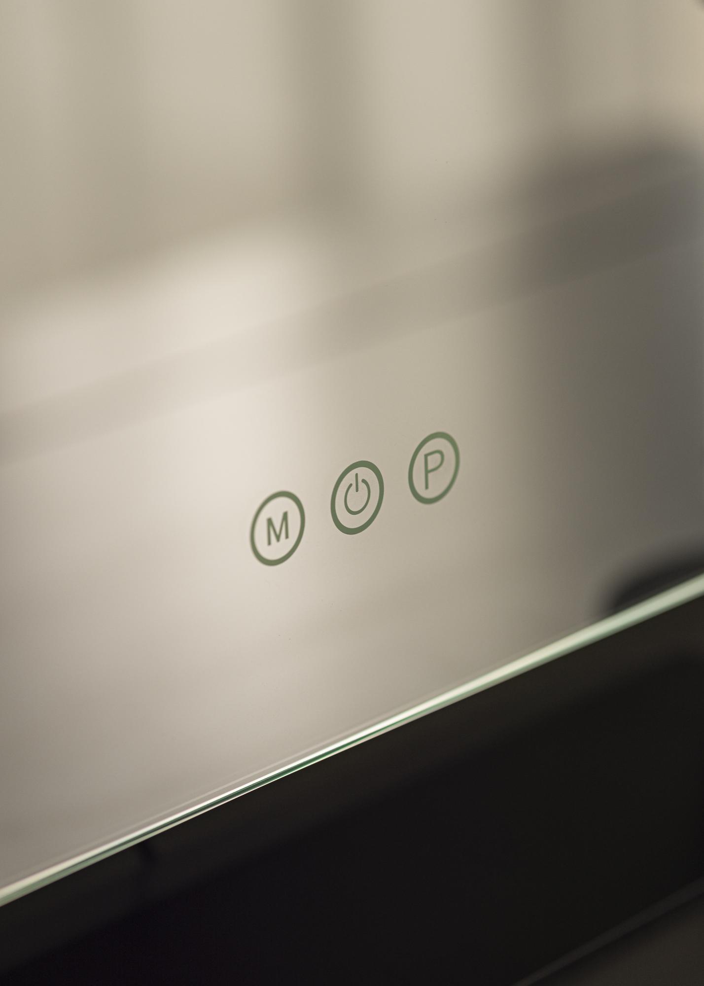Šis veidrodis turi integruotą LED juostą, kuri įrėmina veidrodžio paviršių. Galite pritemdyti apšvietimą naudodami jutiklines mygtukas, pažymėtas "P", ir reguliuoti šviesos spalvos temperatūrą naudodami jutiklinę mygtuką, pažymėtą "M". Taip galite keisti veidrodžio šviesos nustatymus pagal kiekvieną poreikį, ar tai būtų noras turėti minkštą foninį apšvietimą, ar ryškesnę šviesą, kuri padės jums susikaupti į savo atspindį. Taip pat yra įjungimo/išjungimo mygtukas, kurį galite naudoti veidrodžio apšvietimui įjungti ir išjungti. Elektros jungtis vykdoma per jungtį.
