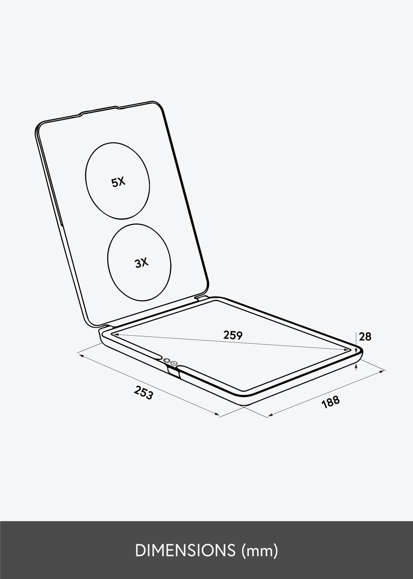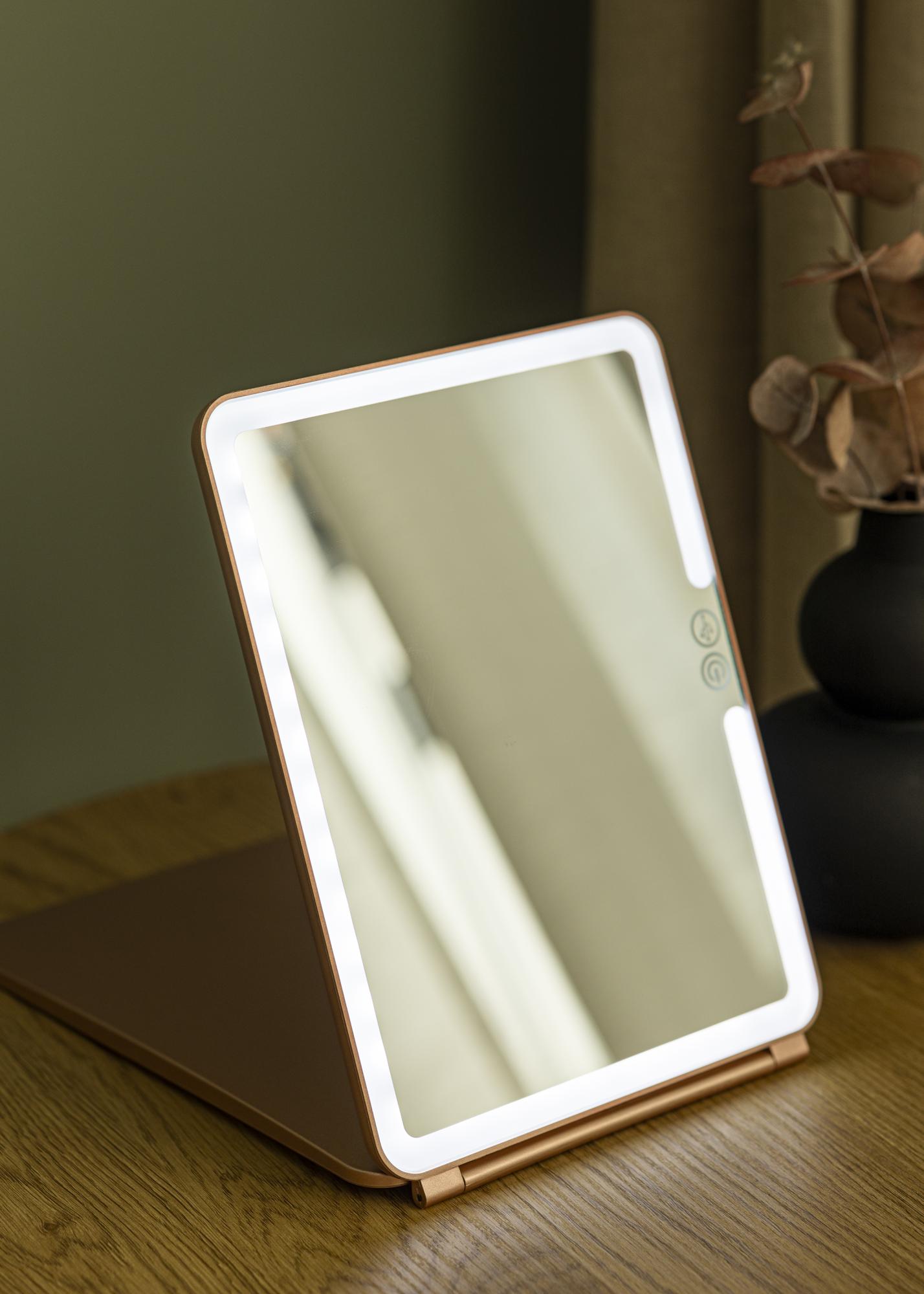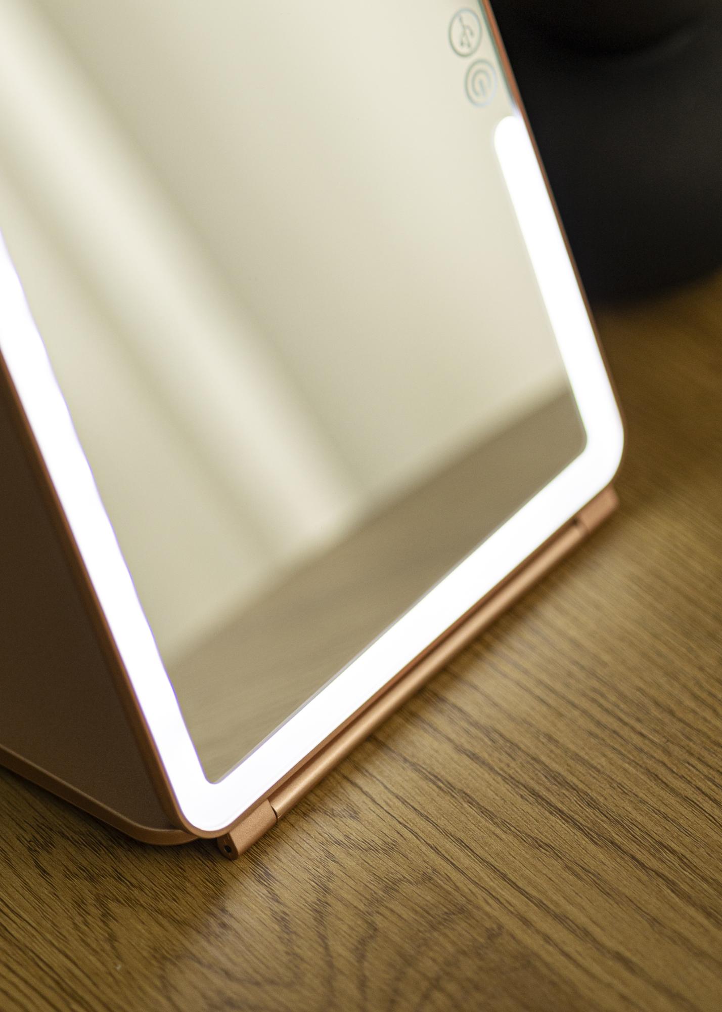 Šis yra makiažo veidrodėlis, kuris yra tobulas naudoti keliaujant, dėka savo kompaktiško dydžio, sulankstomos konstrukcijos ir įmontuoto LED apšvietimo. Jis taip pat turi madingą rusvos aukso atspalvį. Makiažo veidrodėlis lengvai telpa į jūsų rankinę tiek kasdieninei veiklai, tiek kelionėms. Sulankstoma konstrukcija apsaugo veidrodžio paviršių nuo įbrėžimų ir purvo bei leidžia pasukti veidrodį į pageidaujamą padėtį. Veidrodis turi tradicinį veidrodžio stiklą ir dvi mažesnes veidrodžio sritis; viena su 5x priartinimu ir viena su 3x priartinimu.