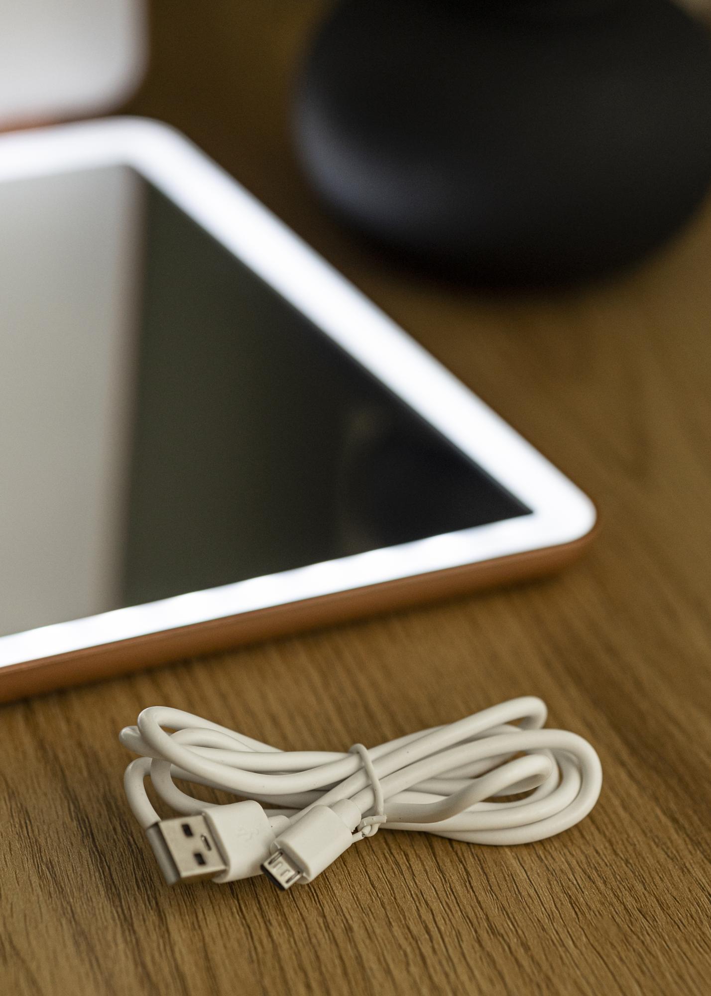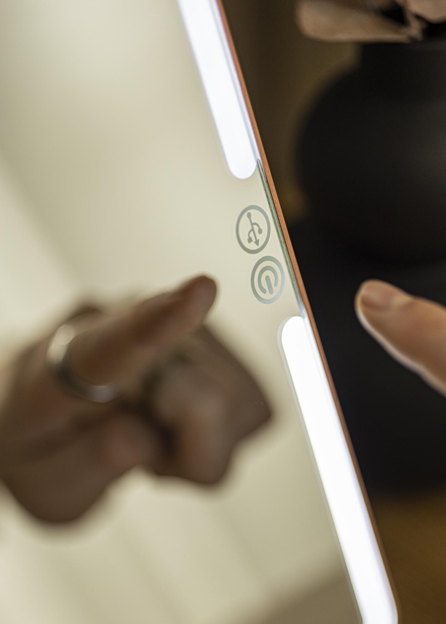 Įmontuota LED juostelė suteikia malonų apšvietimą, kai atspindite save. Apšvietimą tiekia įmontuota baterija, kurią lengva įkrauti per USB jungtį. Veidrodis yra aprūpintas lietimo mygtuku, kuris naudojamas apšvietimui įjungti ir išjungti, taip pat šviesos stiprumui mažinti. Jei sulankstote veidrodį, kai jis yra įjungtas, jis automatiškai persijungia į energijos taupymo režimą ir lemputė išsijungia, kol vėl neatsidaro veidrodis.