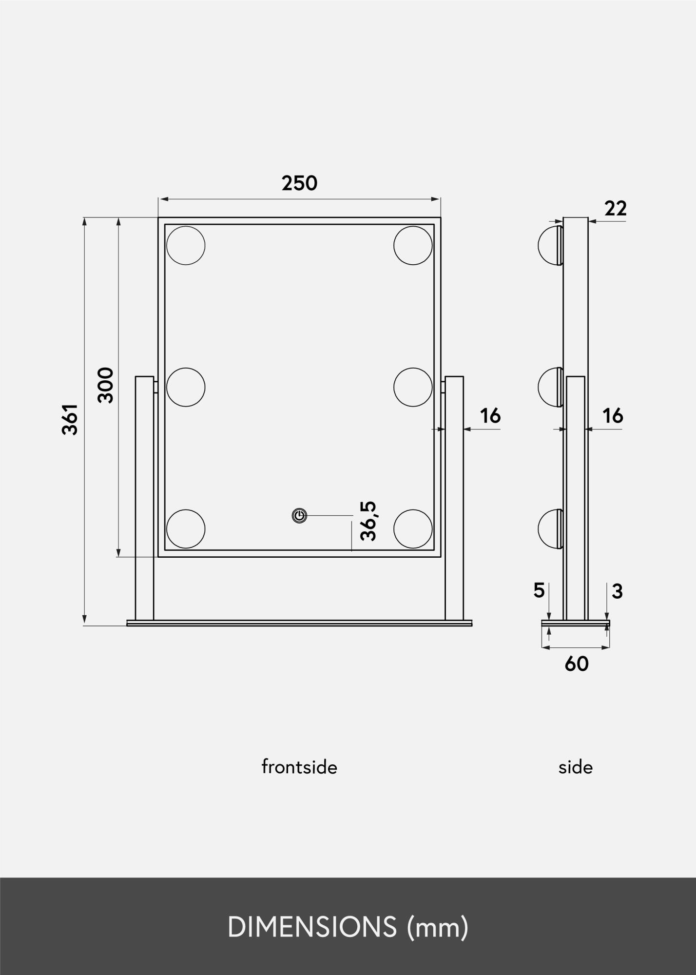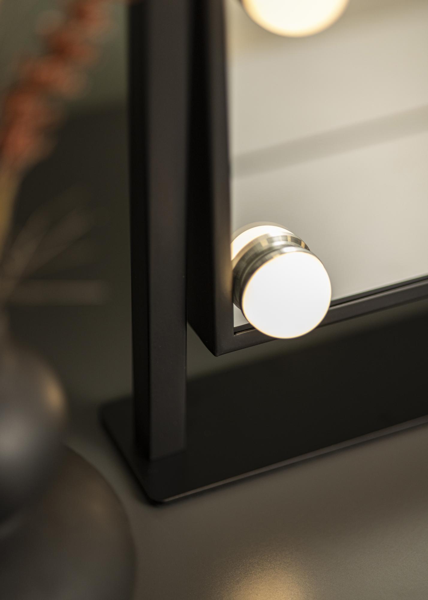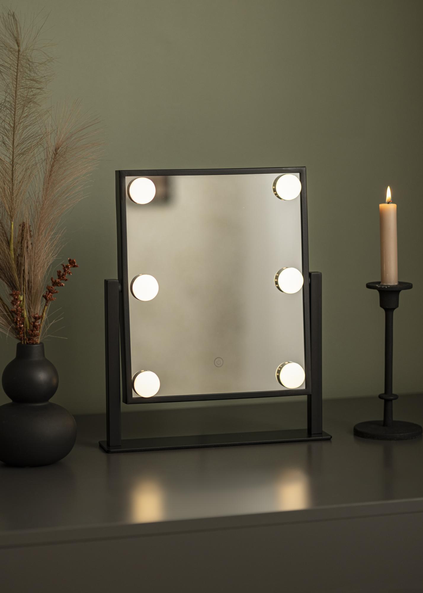 Tai tikrai prabangus makiažo veidrodėlis su šešiomis dekoratyvinėmis ir reguliuojamo ryškumo LED lemputėmis madingos juodos spalvos. Apšvietimas suteikia šiltą baltą šviesą esant 3000K ir įsijungia paspaudus liečiamojo mygtuko. Reguliuokite lemputės ryškumą laikydami mygtuką keletą sekundžių. LED yra šviesos šaltinis, kuris sunaudoja mažiau energijos, turi ilgesnį tarnavimo laiką ir suteikia natūralesnį ir tolygų apšvietimą. Makiažo veidrodėlį galima pakreipti taip, kad galėtumėte tiksliau pritaikyti savo makiažą. Be daugelio funkcijų, šis makiažo veidrodėlis turi tikrą Holivudo atmosferą ir tampa elegantišku namų detalu!