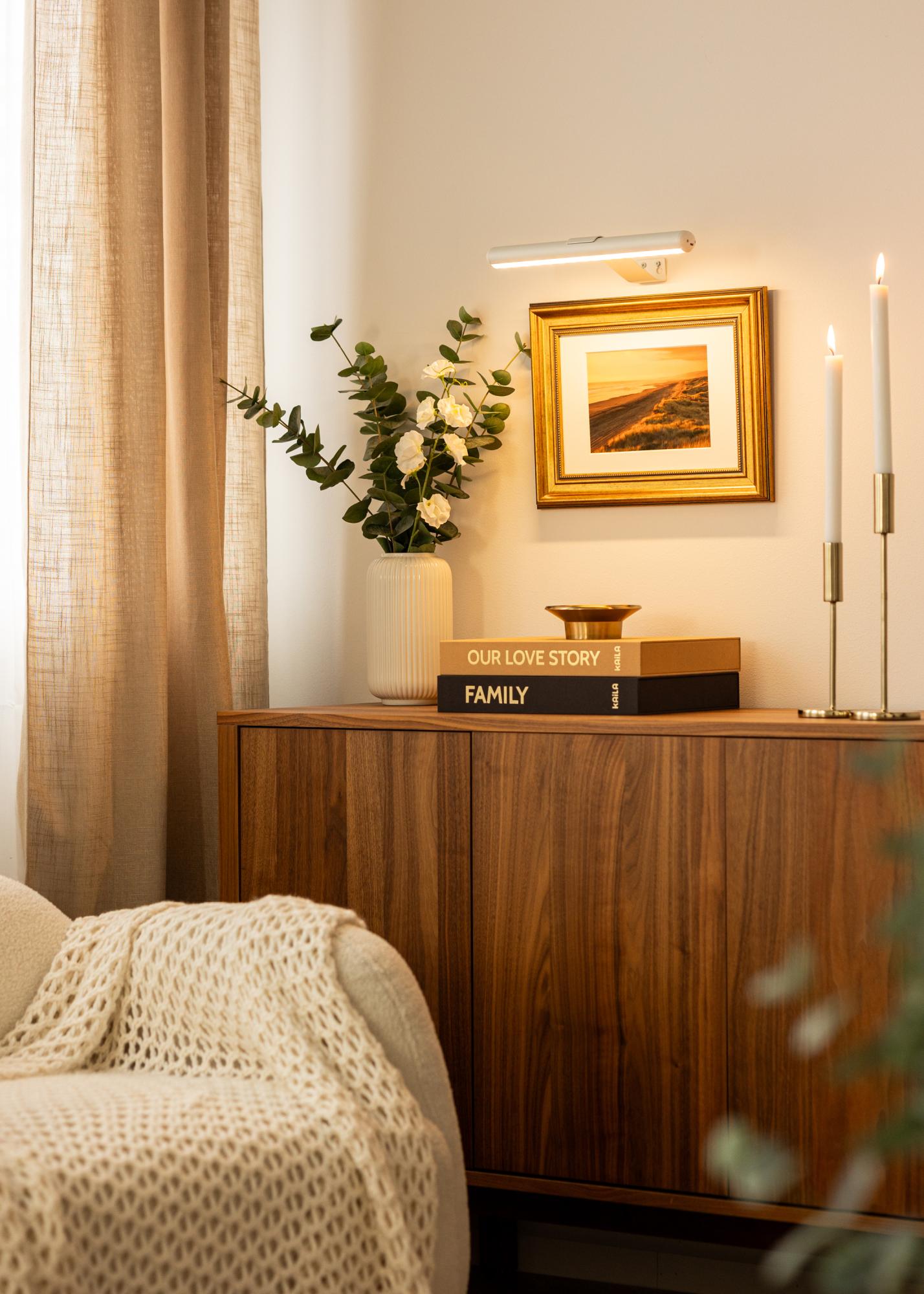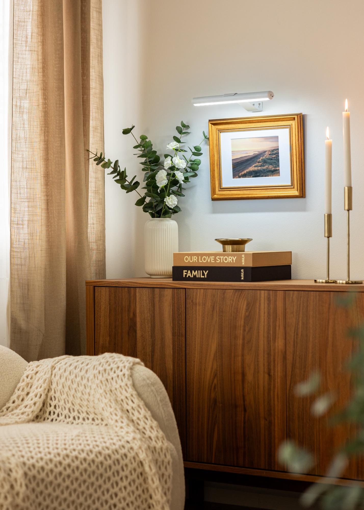 Šis baltos spalvos baterijomis maitinamas paveikslų apšvietimas suteikia patogų sprendimą apšviesti jūsų meno kūrinius be laidų. Kadangi jis veikia su baterija, jį galima padėti bet kur, nesirūpinant elektros lizdais, todėl jis labai lankstus. Apšvietimo gylis yra 15 cm, o ilgis - 33 cm, todėl jis yra kompaktiškas ir lengvai įmontuojamas, ir tuo pačiu gali apšviesti meno kūrinius, kurių plotis yra iki 60 cm.